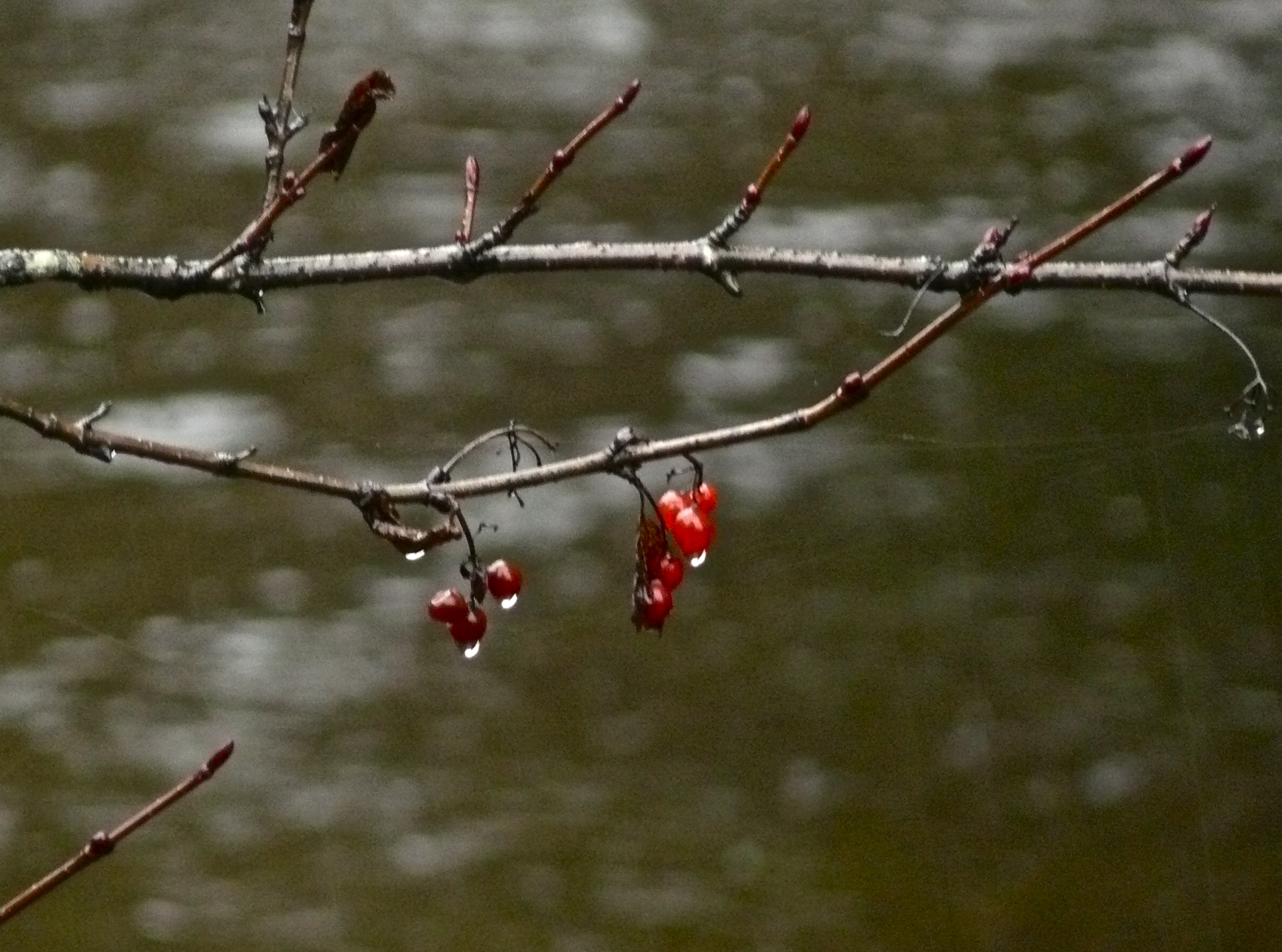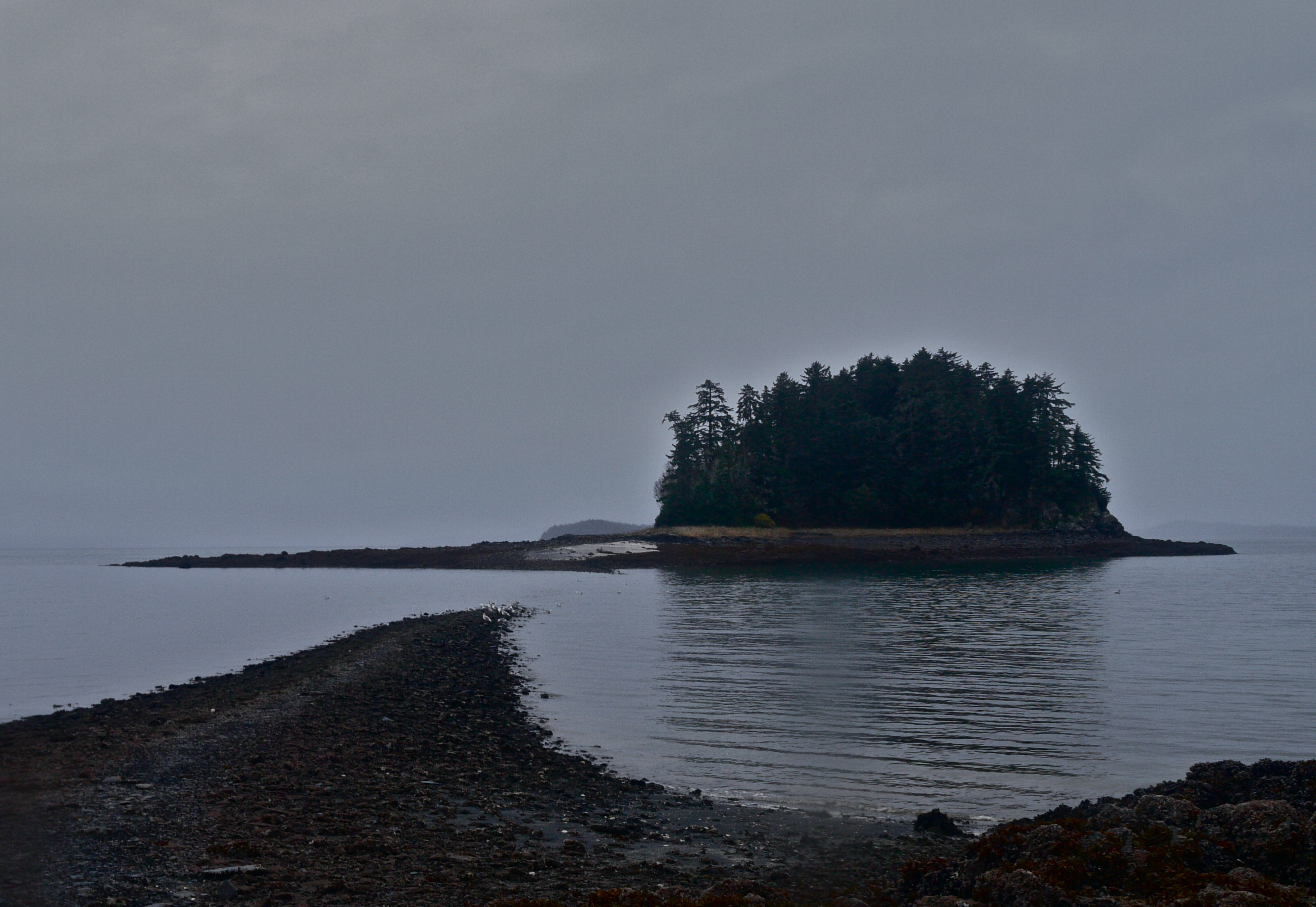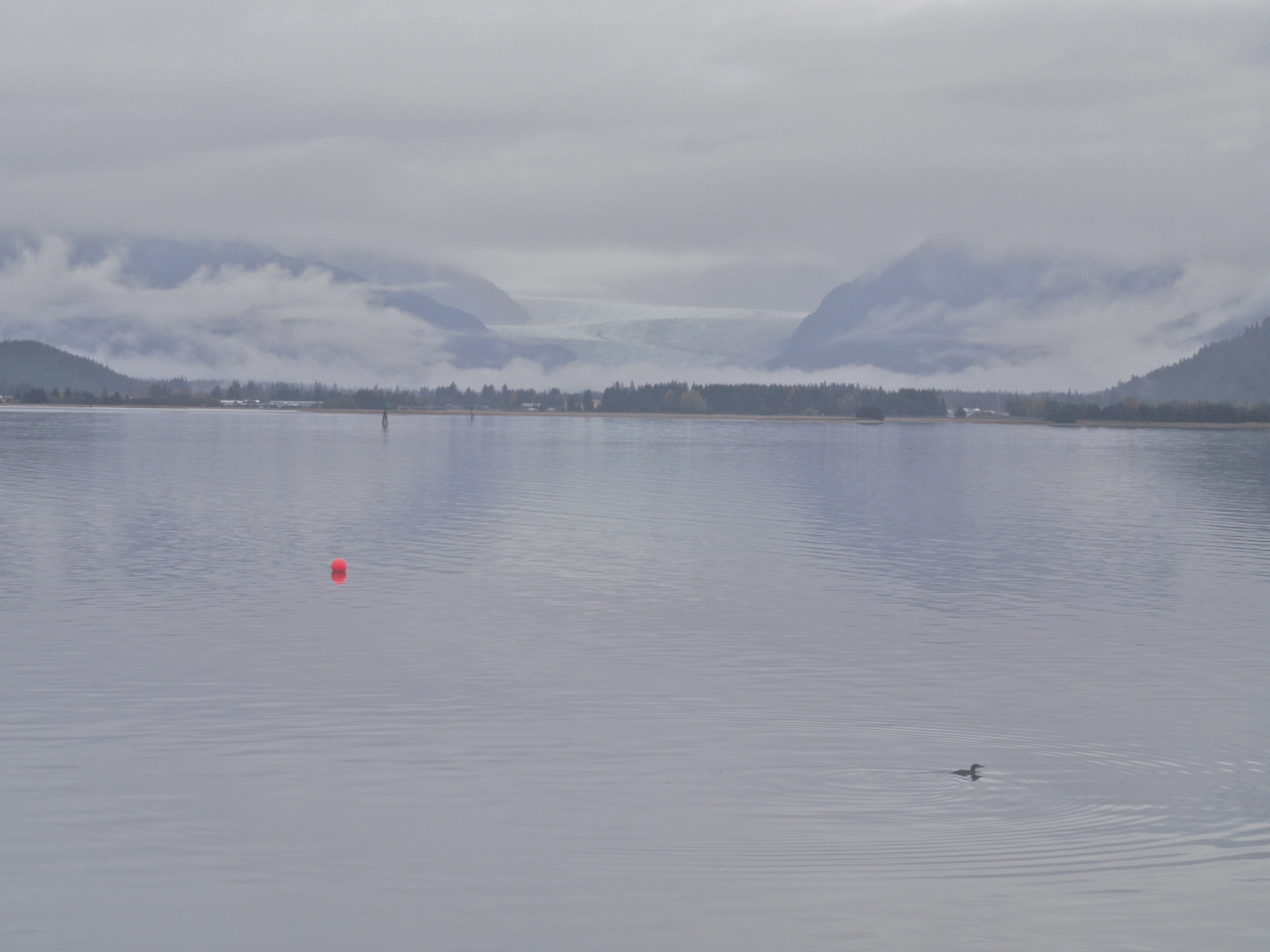 Leaving the forest I drove further out the road to wrack for sea weed. We use it in the garden. Only thin lines of rock week marked the high time line at the beach I usually harvest so I didn’t bother with it. A flood tide almost filled Bootlegger Cove with water the color of dulled mercury, reaching toward the Mendenhall Glacier. Only a bright red buoy floated on the calm water until a common loon popped, corklike, to the surface. I resented the presence of the rude-colored buoy as much as I enjoyed watching the loon’s graceful comings and goings; I who just left the woods with an alway curious toy poodle mix, she wearing high visibility yellow and I bright red.