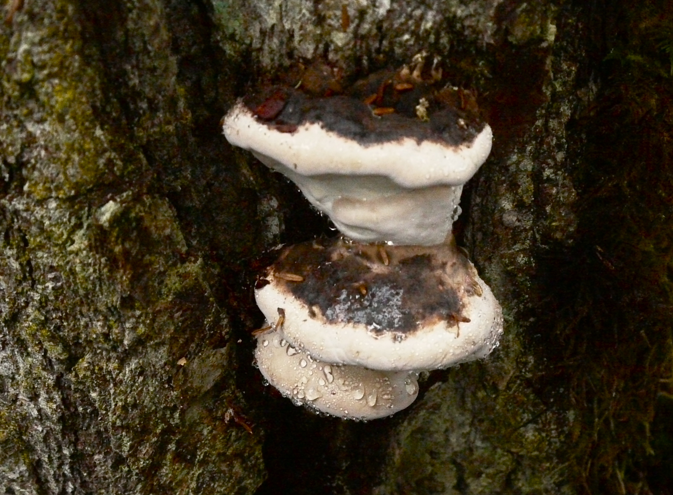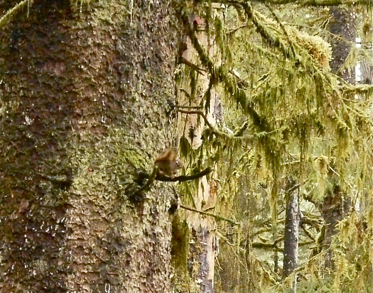 After that visit two years ago, I wasn’t sure if I could mine Fish Creek for enough material to fill even one blog post. But an old growth forest, even at quiet times, always has some new trick to show you. Today it offered white lacy ferns in transition from green to dead brown, clumps of fungus mimicking a pipe organ, a squirrel willing to stare down a poodle in fleece, a freshly fallen spruce tree blocking the trail. Grown large and tall in disturbed ground along the stream that fertilized it with spent salmon, the gambling spruce paid the price for its easy riverine life. It will never grow to maturity like the spruce occupying the ground just beyond reach of the fickle stream, but its flesh could change the stream’s course.
