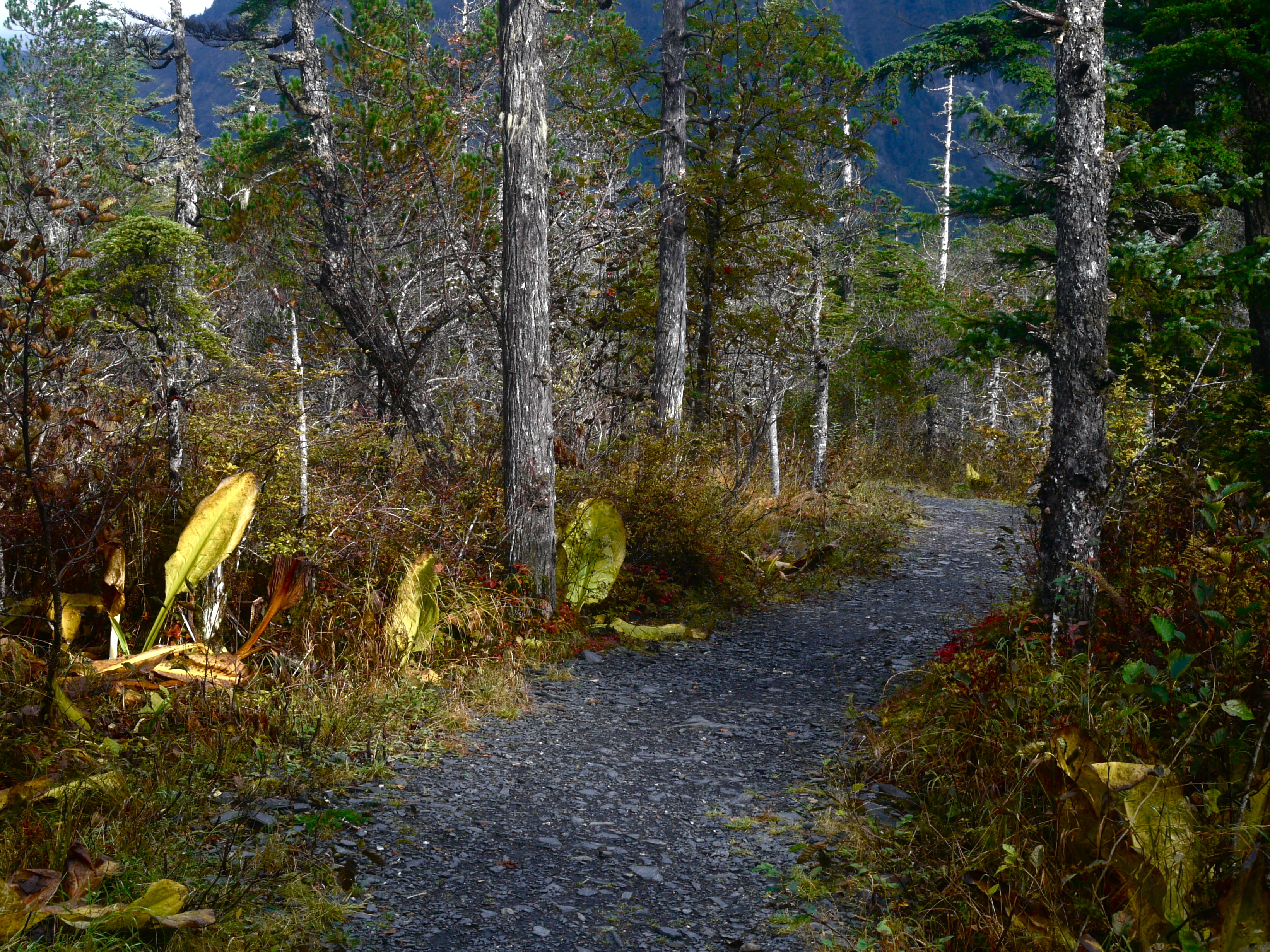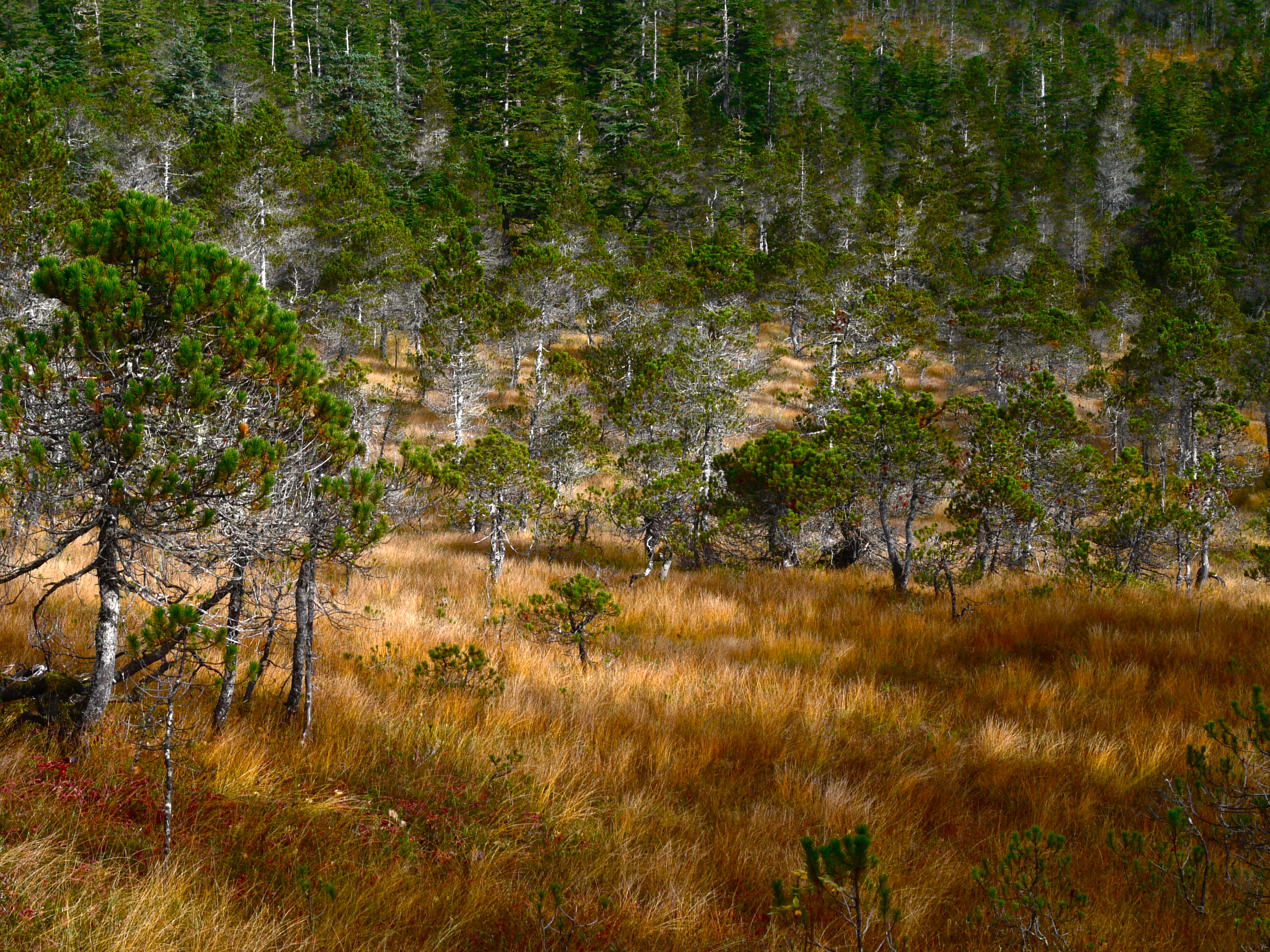 A shaft of sunlight would bring out the color of the red in the dying berry bushes and emphasize the tone variations of gold yellow meadow grass. With no hope of that show, I am satisfied with the color contrasting in places where red or yellow plants crowd the barkless flesh of dying pine trees.