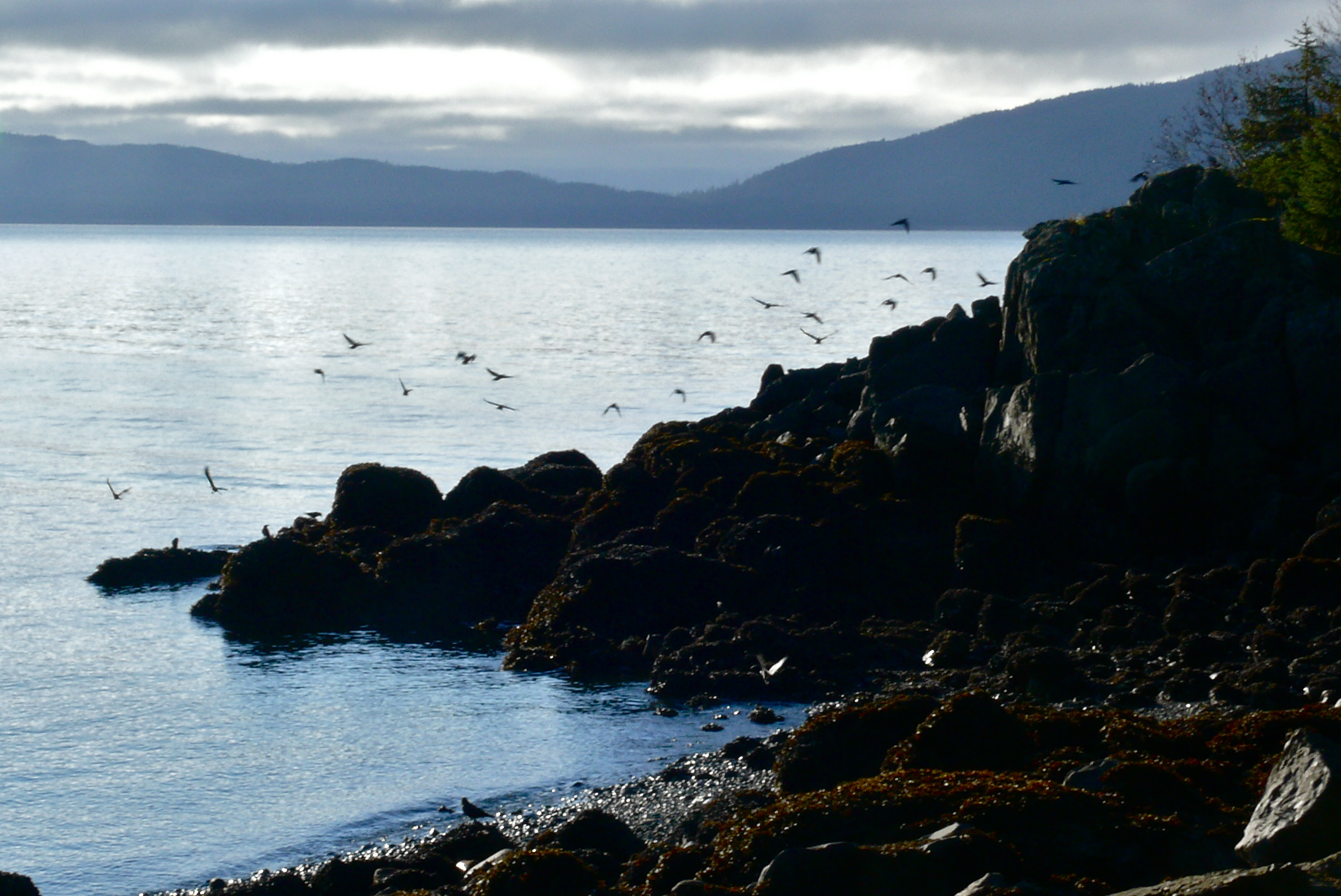 We walk over a low hill to Aki’s favorite pocket beach, where we have watched sea lions, harlequin ducks, and sometimes whales from a sunny rock bench. Today only we find a murder of crows skulking on the beach. They still manage some beauty as they fly around the point, croaking a protest or maybe a curse as they go.
