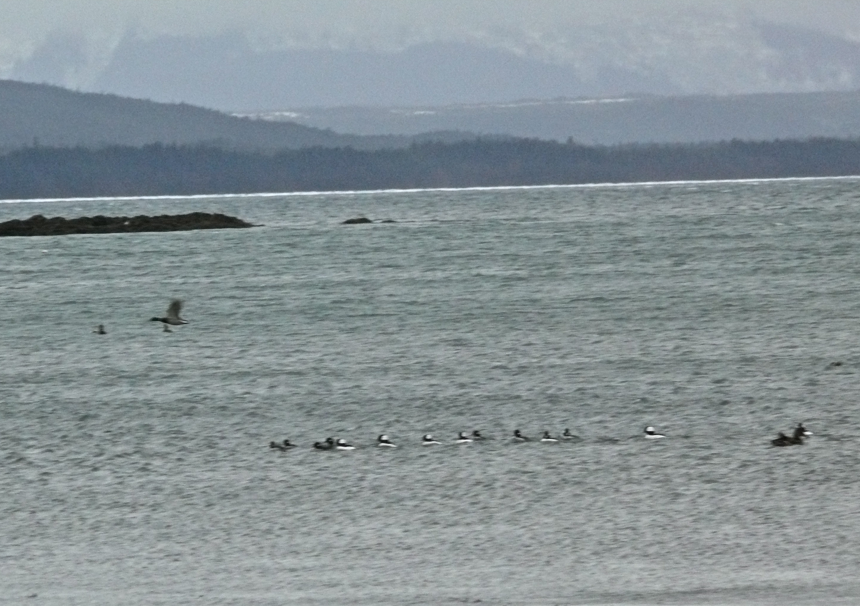 A raft of barrow’s golden eye floated near the beach along with one red-breasted merganser who might have hired as body guard for the smaller ducks. At the mouth of Peterson Creek the recently empty small bay was lousy with buffleheads and harlequins, scoters and mallards—all returned to their winter feeding grounds.