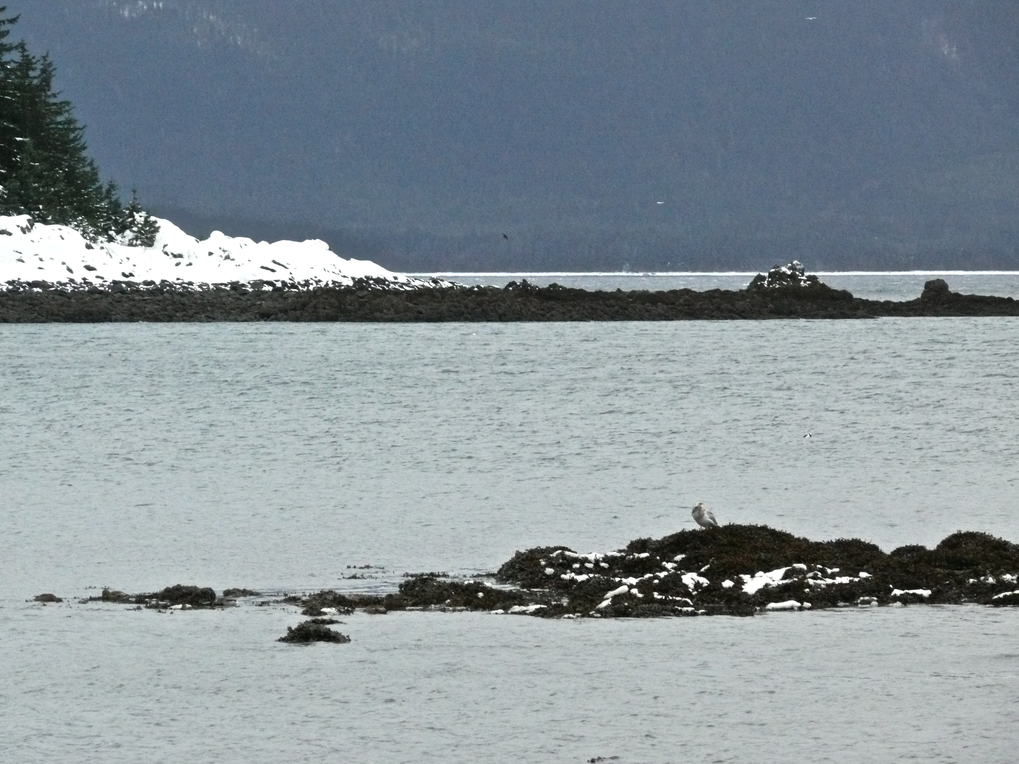 We had to cross an even deeper snow field to move from forest to beach recently bared by the receding tide. Our presence didn’t bother a loose collection of gulls relaxing among some small beachside boulders. One stood tall and alone on an offshore outcropping. I mused about gull behavior, always wanting to credit them with knowledge and organization skills they can not have. Later, a picture I took of the offshore guard showed it with a beak full of fish.
