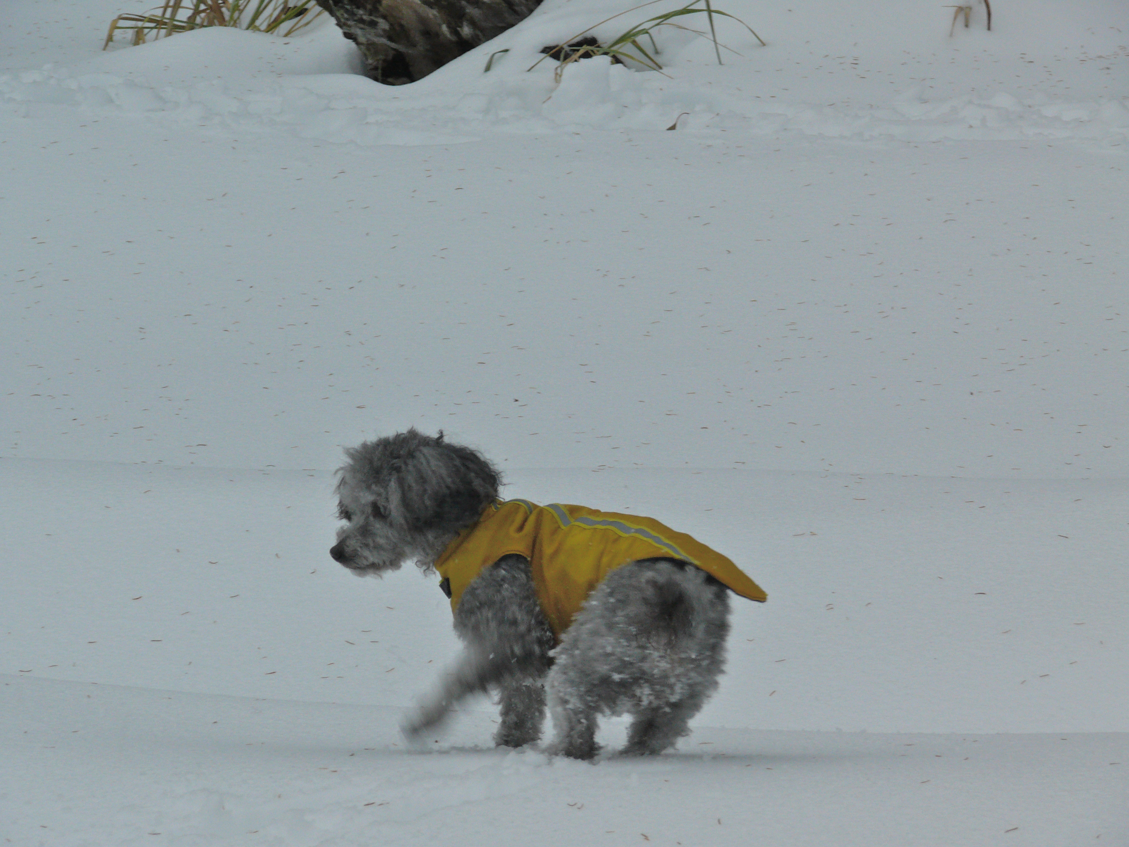 Aki stays well ahead on this trail, showing impatience each time she must wait for me to catch up. With the temperature around 14 degrees Fahrenheit, today’s rain forest snow falls dryly on the trail. It doesn’t stick or form pesky snowballs on Aki’s poodle coat. With only a few inches fallen, the snow can’t impede her flight across the meadow.