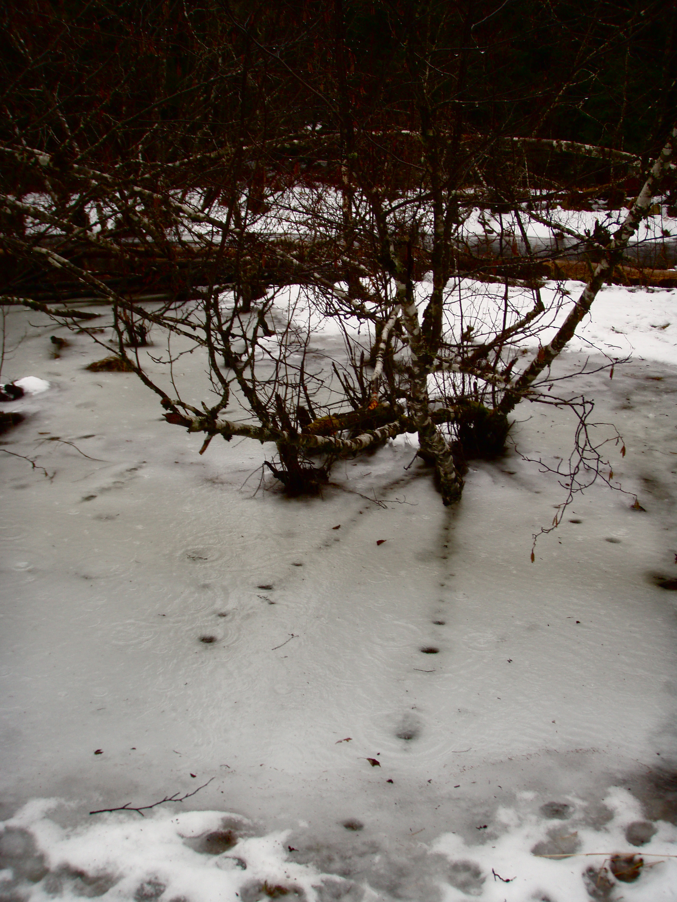 We started this walk in a thick alder forest drained by winding stream filled with muskeg brown water. Clear panels of 2 inch thick ice, straight edges sharp enough to have been cut with a knife, lay against the stream edges, secured there by back eddies. Armed with a camera, I hunted beauty; Aki the urine stories of forest animals. Away from the trail, tracks in the snow, wolf and a human hunter, crisscrossed those of a large deer. Wolves don’t honor our hunting regulations but the deer’s other predators must stop hunting after the first of the year. I’ll look for the deer’s tracks in January.