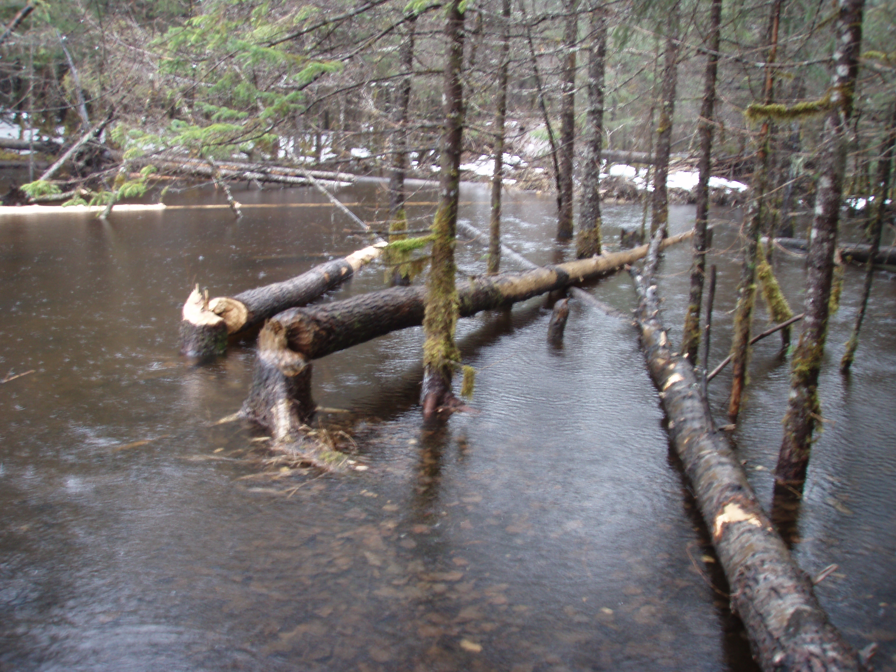 While the rain lessened the effectiveness of my gloves, I read a government sign that asked us not to attack the beaver dams currently flooding out access to half the moraine. A group of trained volunteers were controlling the flooding by notching the dams. This reduced the flooding while keeping the water levels high enough to protect the silver salmon spawn. According the sign, and I have no reason to doubt its words, the beavers’s work helps the salmon which feed trout, eagles, and bears. Have I misjudged the industrious rodents. Maybe yes, maybe no. The problem is that the little guys dam salmon streams and watercourses that have never seen a silver salmon. Water backing up from one of the later efforts is currently flooding out my favorite access trail to moraine.