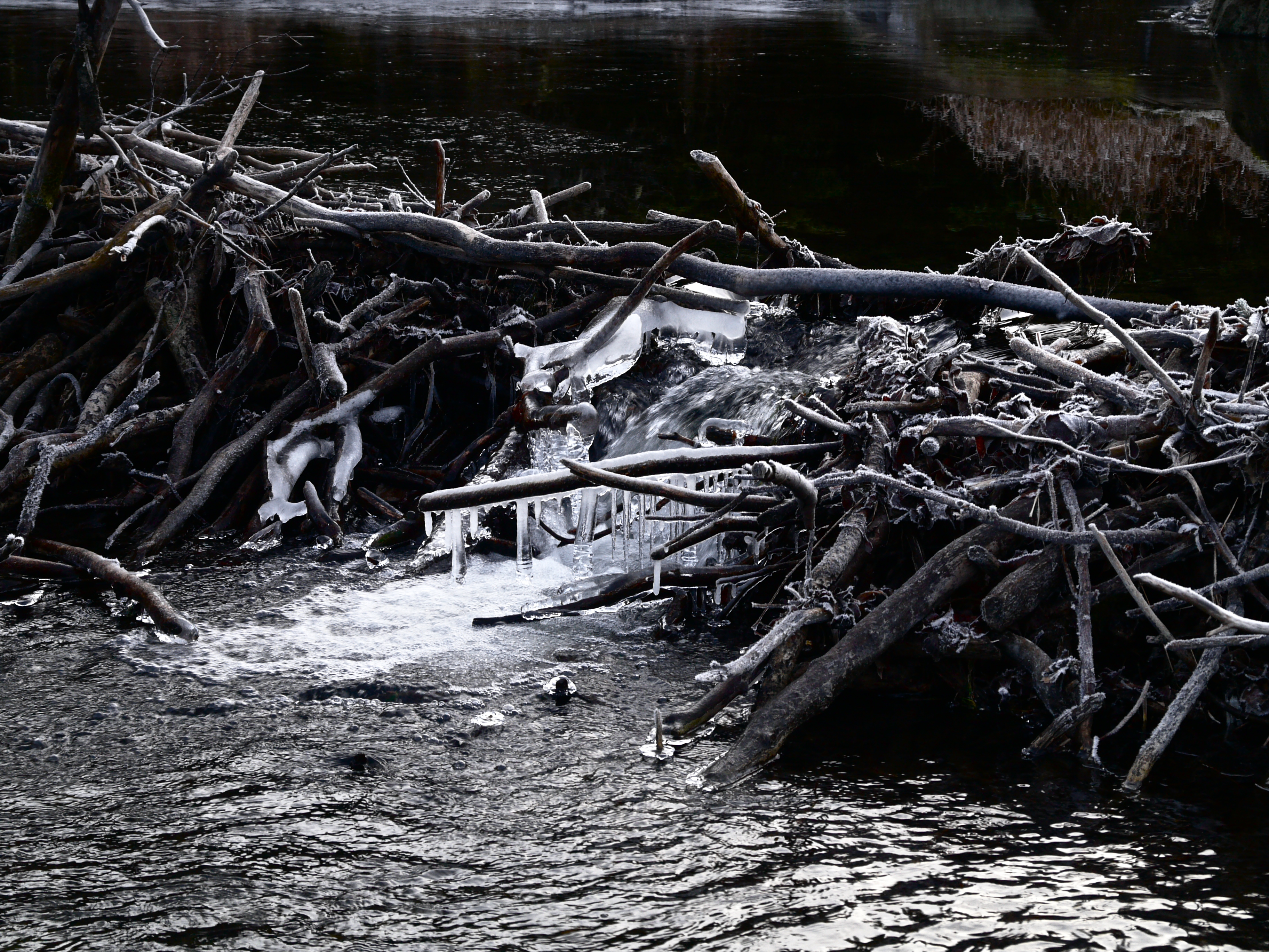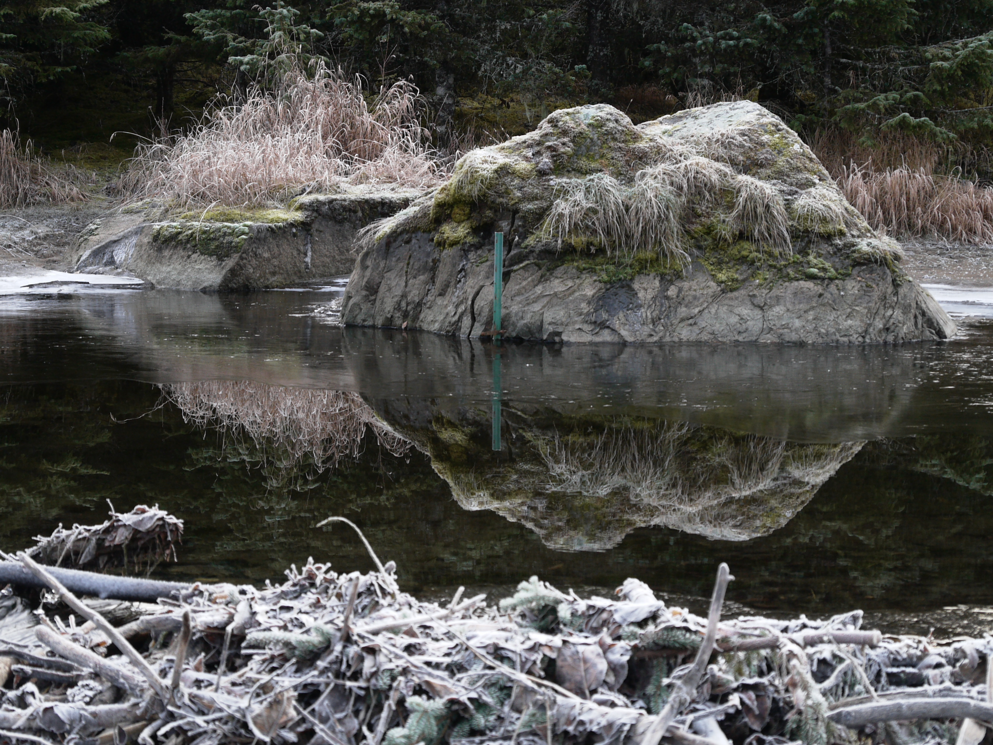 Not wanting to see how Aki would deal with a brown bear, I reverse direction and head back to the car. It’s time anyway. The sun finally crests Thunder Mountain so its rays can reach the upper glacier. This brings new beauty but also a rising wind chilled by its run over the ice field. On the way we visit a frost covered beaver dam, ice sculptures forming where water flows through a minor breach. Behind the dam, a glacier erratic mimics the beaver house in shape and placement.