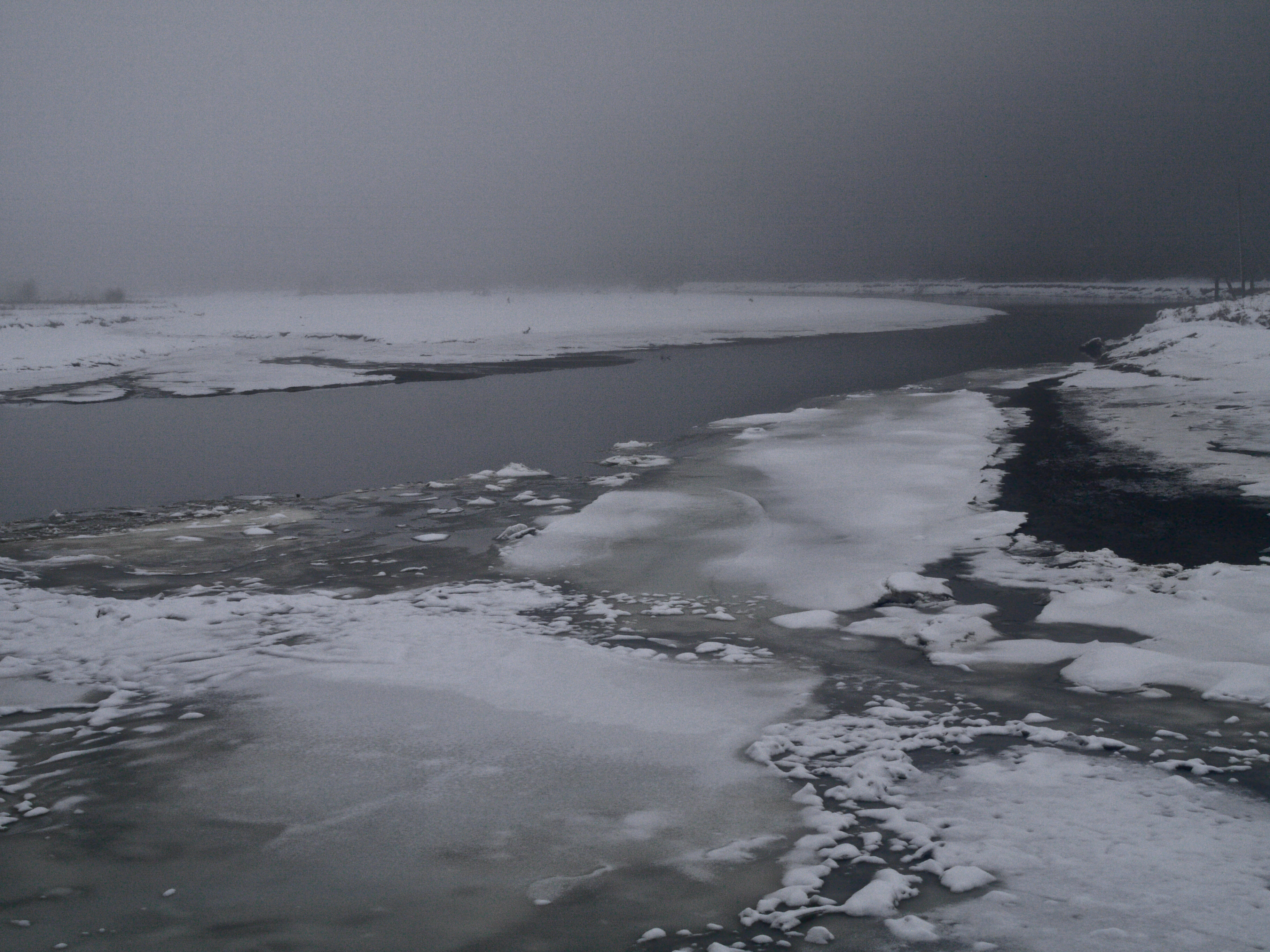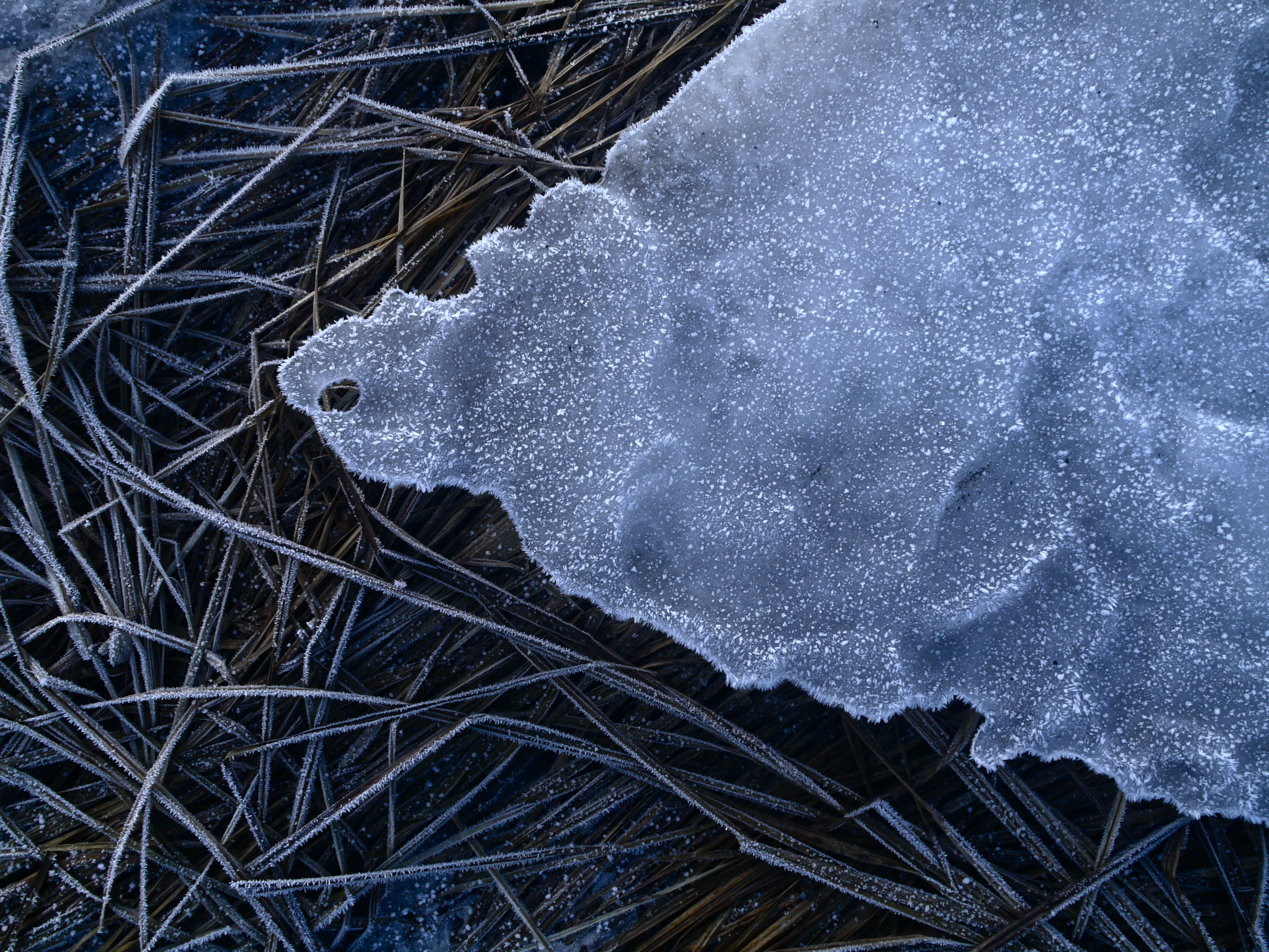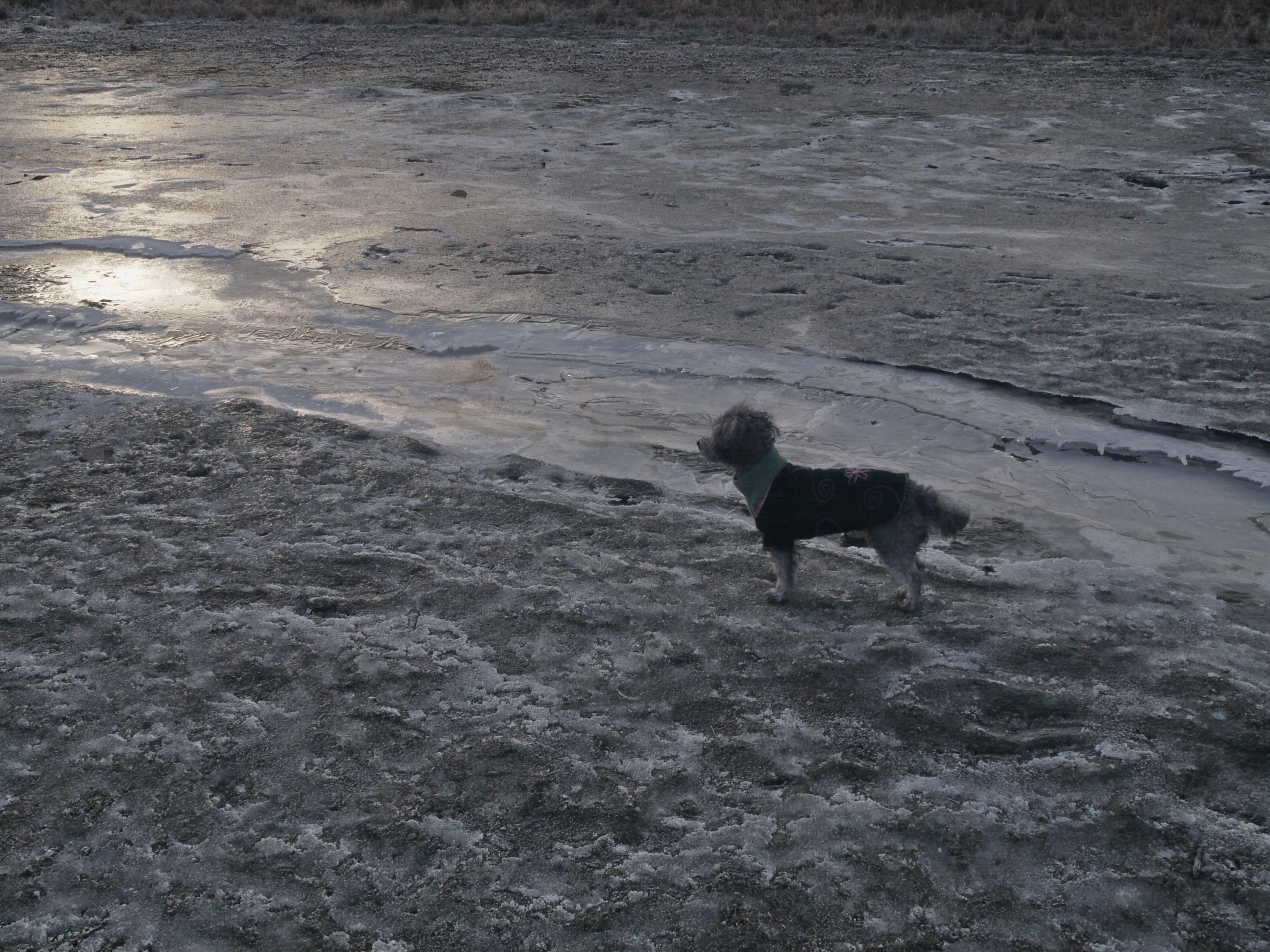 Aki shot out of the car and down into tidal zone. I followed, taking pictures of frost covered grass and ice covered streams—-anything sparkling in the retreating sun. Dusk replaced daylight in ten minutes but the grasslands, now covered with a sheet of refrozen snow, still glowed as if giving back light taken during the short day. Long blades of grass flowed in and out of the ice. When ice free the grass lay just above the frozen ground in patterns formed by the retreating tide.