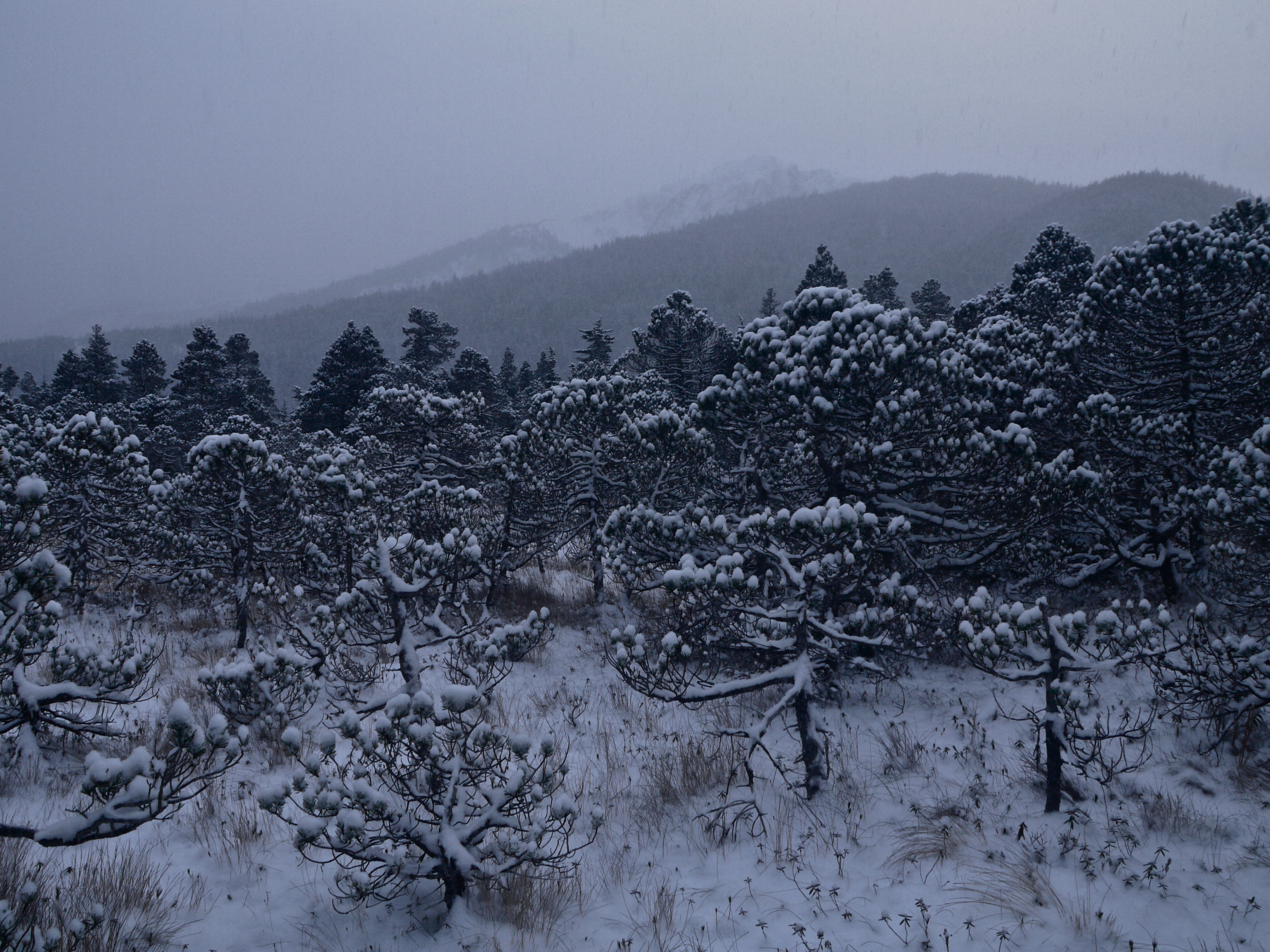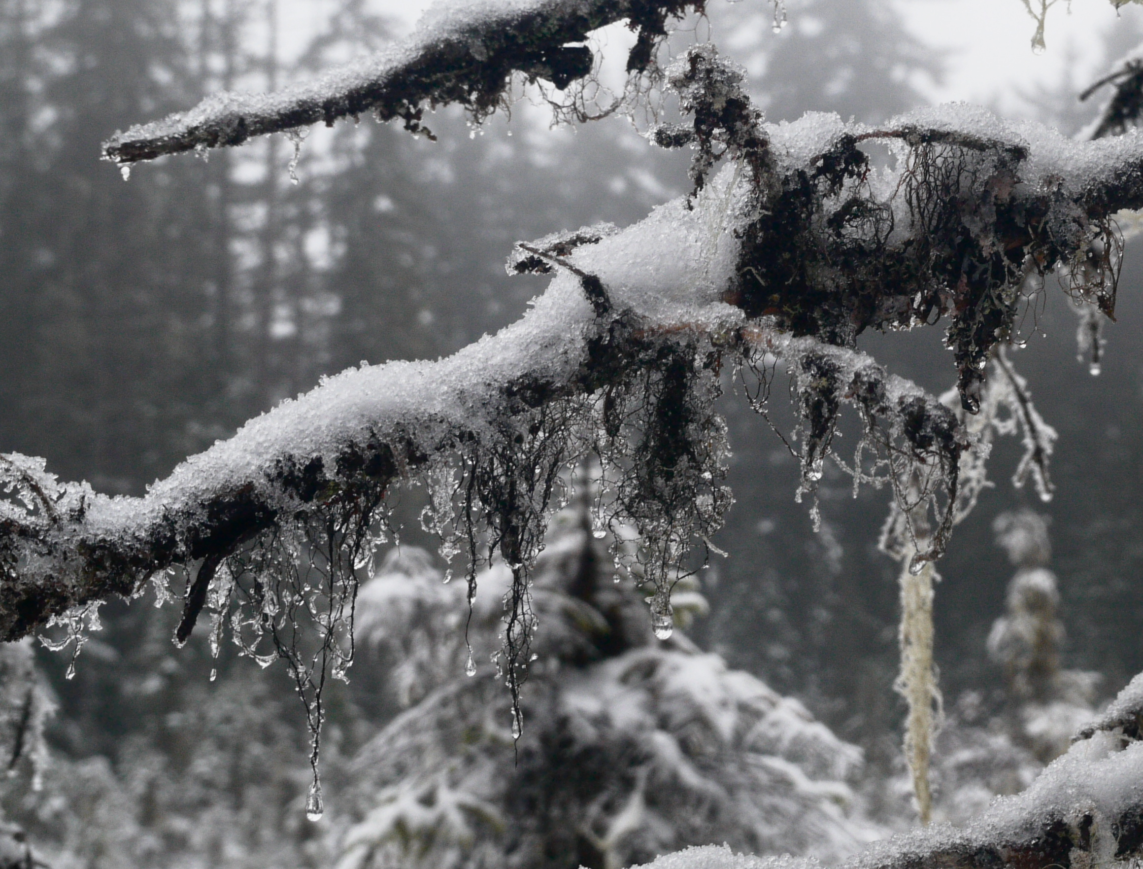In hope of finding snowfall rather than the heavy rain plaguing Chicken Ridge this morning, I hauled Aki out to the glacial moraine. Rain followed us there. In a minute Aki lost her initial exurburance for the adventure, stopping me 50 meters from the car with a questioning look. Raising one front paw out from the rain sluiced trail ice, she stopped to offer an excuse for returning to the house. Believing that beauty and the happiness it brings can be found even in hypothermic weather, I pressed on. Loyal friend that she is, the little dog followed with tail down until we met a happy Labrador retriever who had not lost his exurburance. After that, pride and interesting scents kept up her spirits.