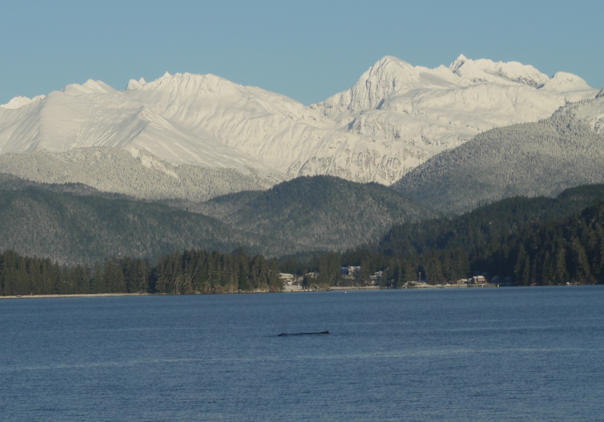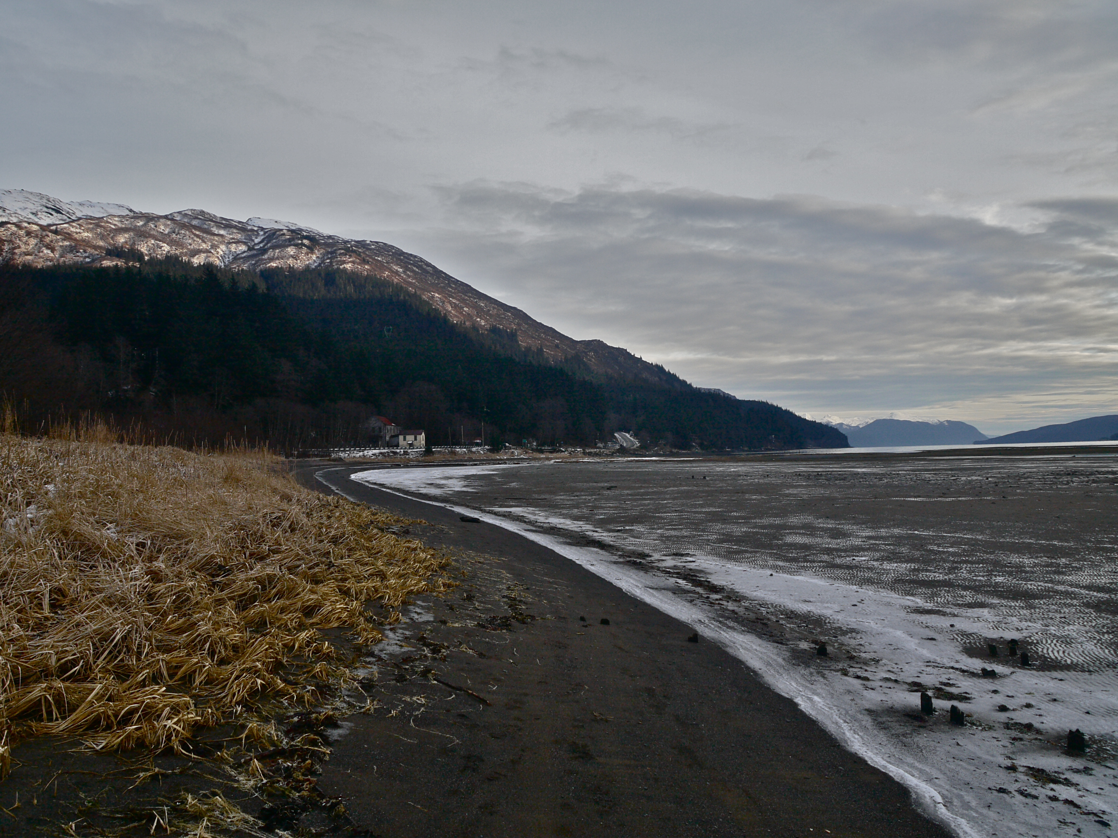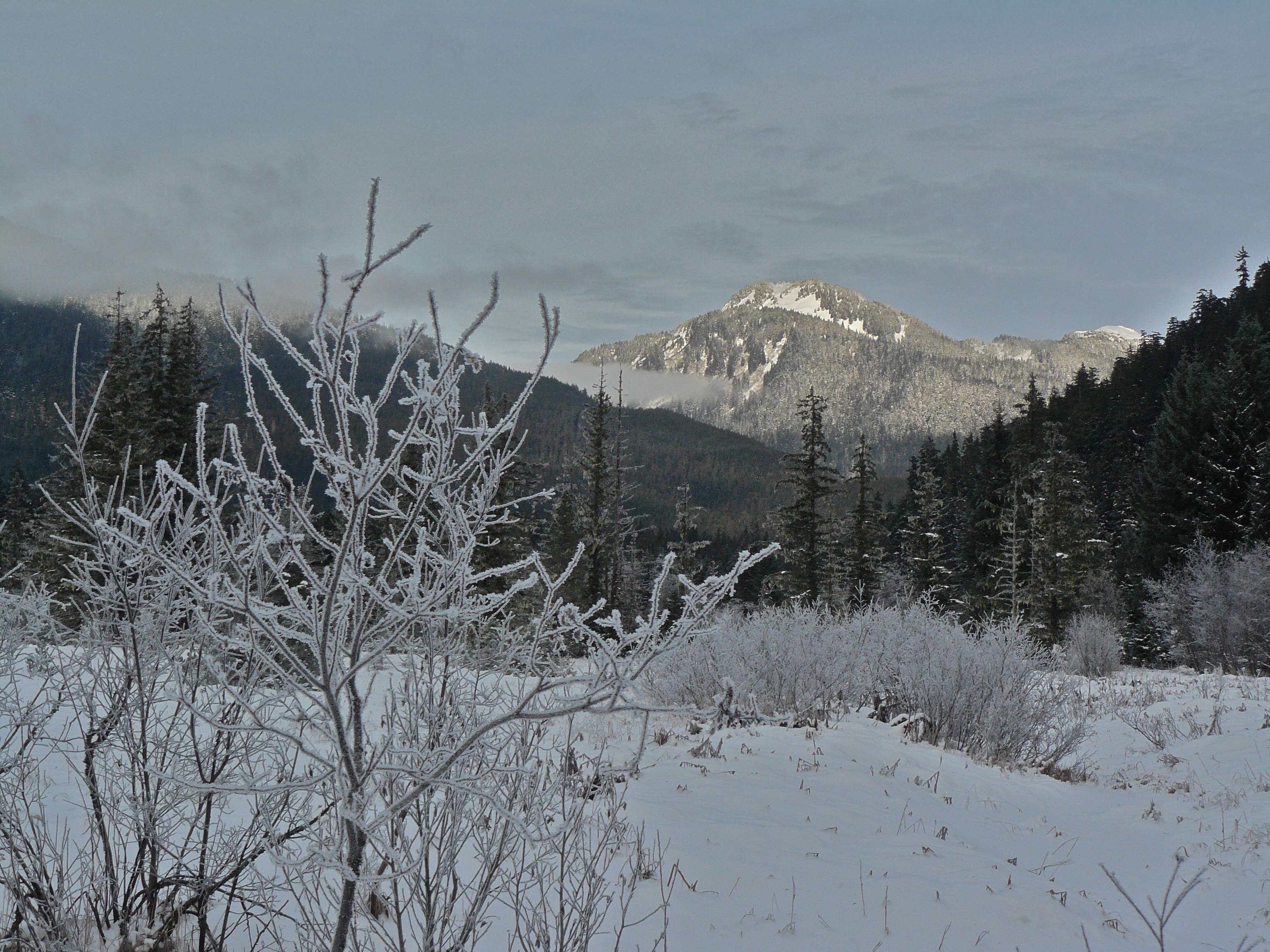 While it rained on Chicken Ridge last night, it snowed hard a few miles away on North Douglas Island. I had to clear a foot of fresh white from the trailhead trash can before depositing Aki’s bag of scat. My boots sunk through deep snow with every step until we reached the shelter of old growth spruce. The limbs of the big trees bent almost straight down under a load of new snow. Such sacrifices provide comfortable passage for our Sitka black tail deer. Today they made it possible for Aki to dash around the forest floor, tail up, ears rising and falling with each leap. Her fun ended when one tree released its load, sending a white shower across the trail. It sounded like an express train passing through a subway station. After, I almost expected a sigh, like I would emit after being freed from a heavy burden.