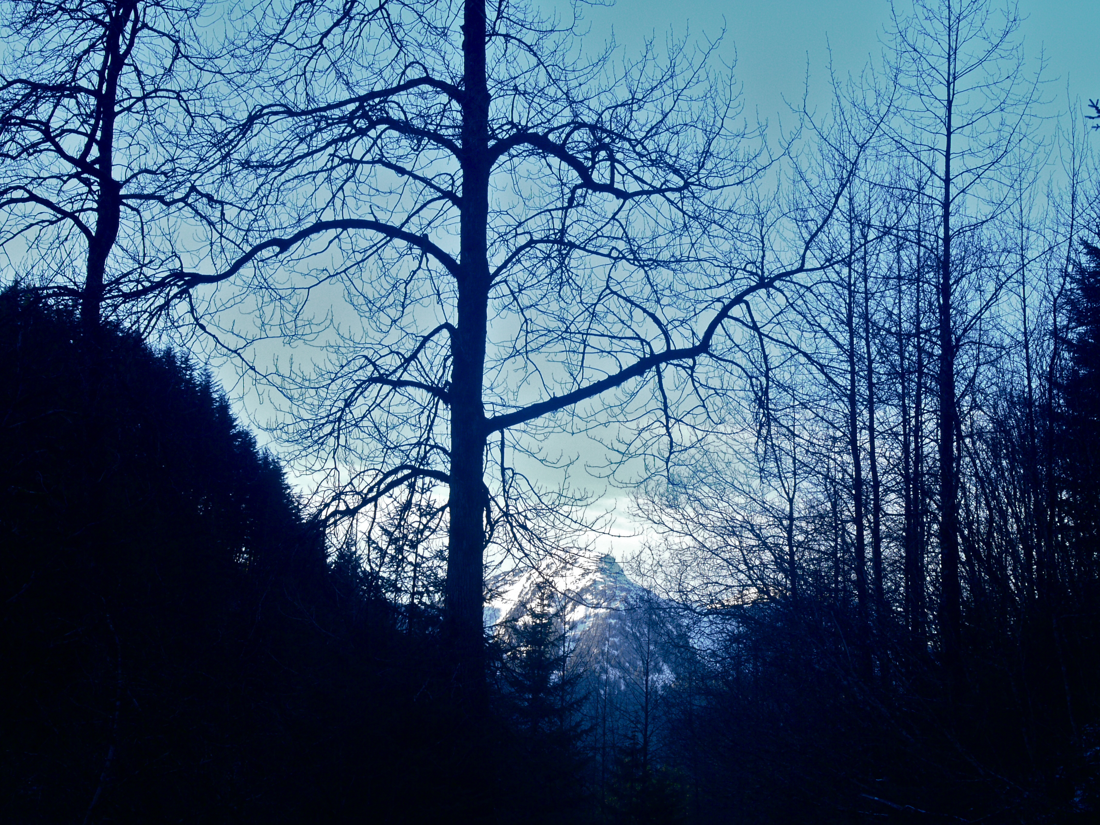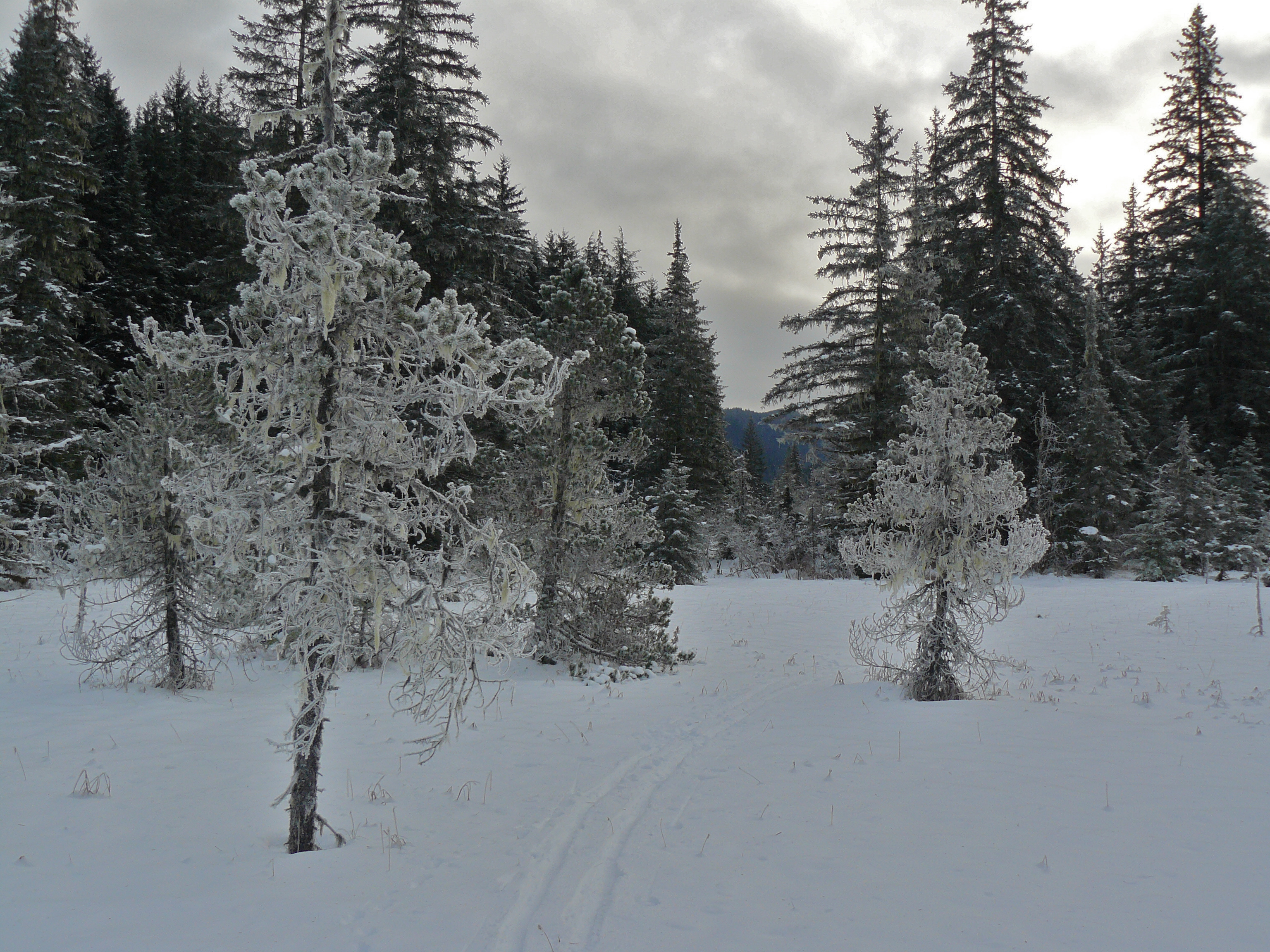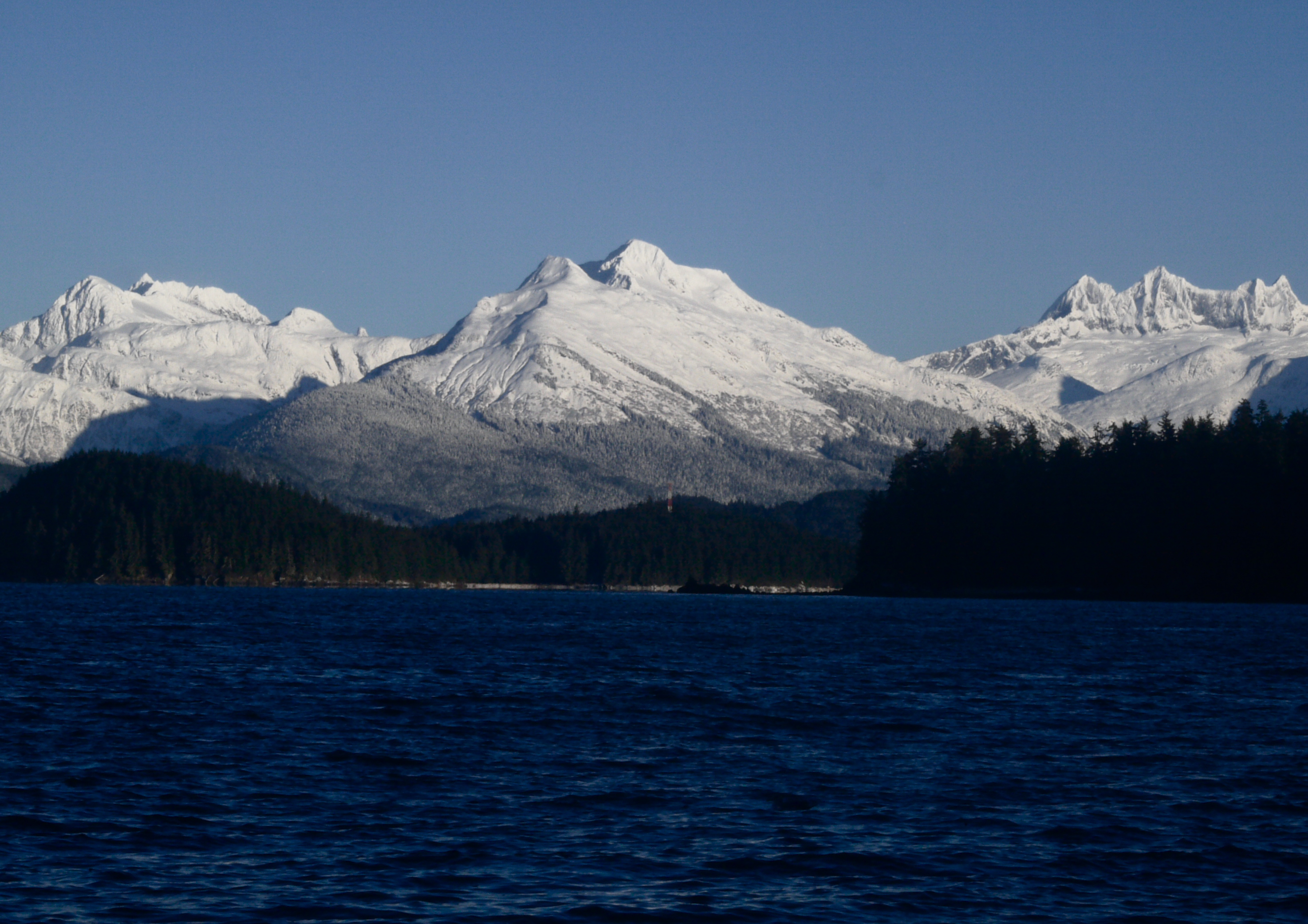 While it rained on Chicken Ridge last night, it snowed hard a few miles away on North Douglas Island. I had to clear a foot of fresh white from the trailhead trash can before depositing Aki’s bag of scat. My boots sunk through deep snow with every step until we reached the shelter of old growth spruce. The limbs of the big trees bent almost straight down under a load of new snow. Such sacrifices provide comfortable passage for our Sitka black tail deer. Today they made it possible for Aki to dash around the forest floor, tail up, ears rising and falling with each leap. Her fun ended when one tree released its load, sending a white shower across the trail. It sounded like an express train passing through a subway station. After, I almost expected a sigh, like I would emit after being freed from a heavy burden.