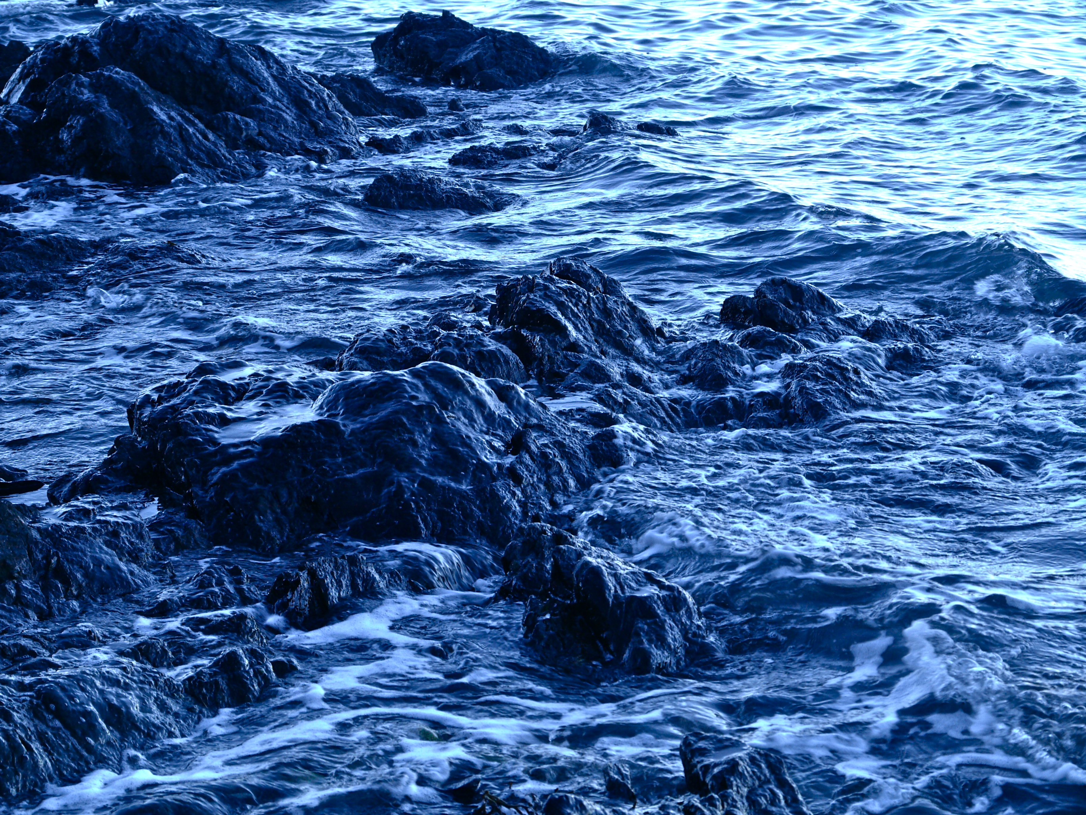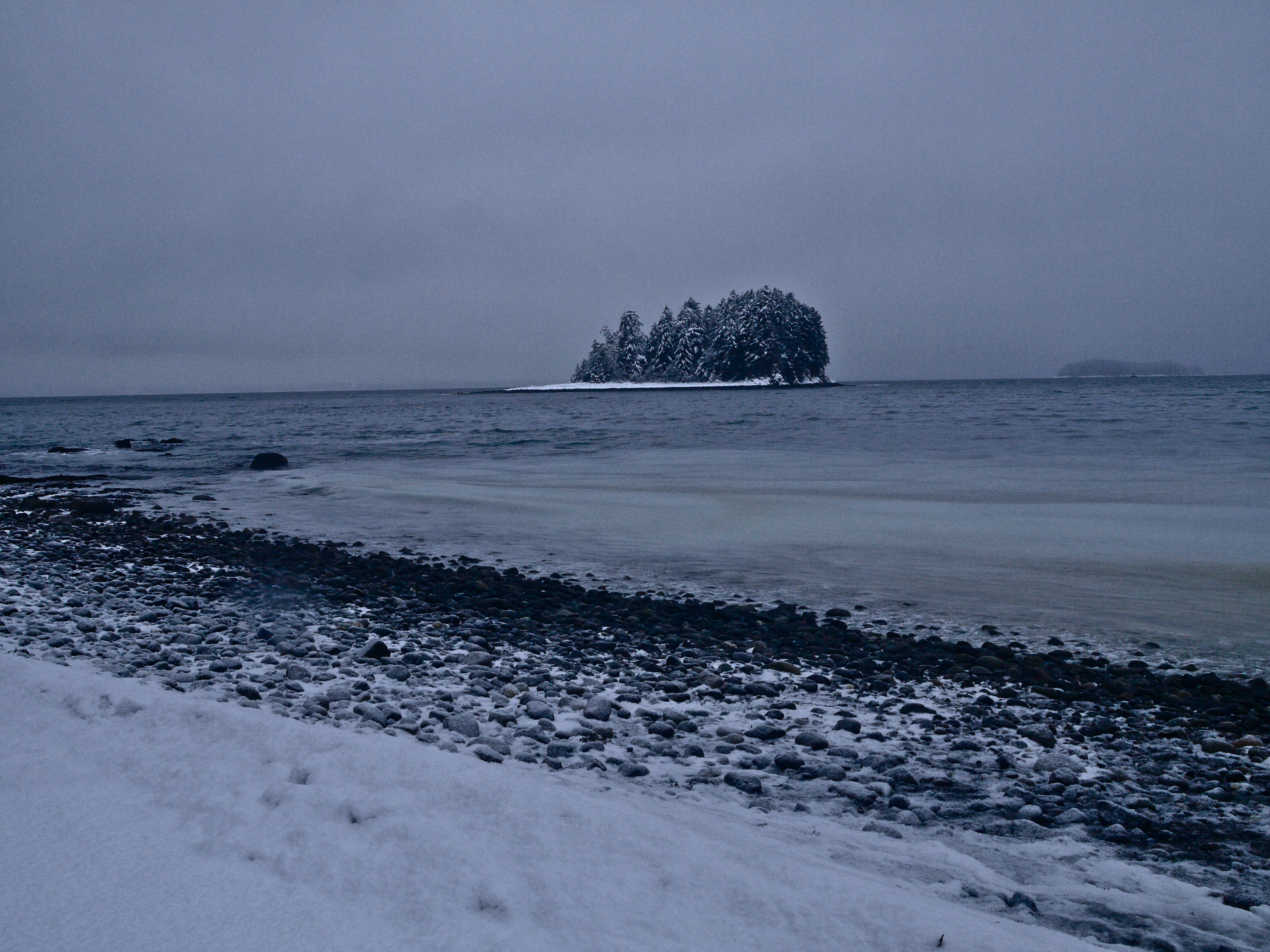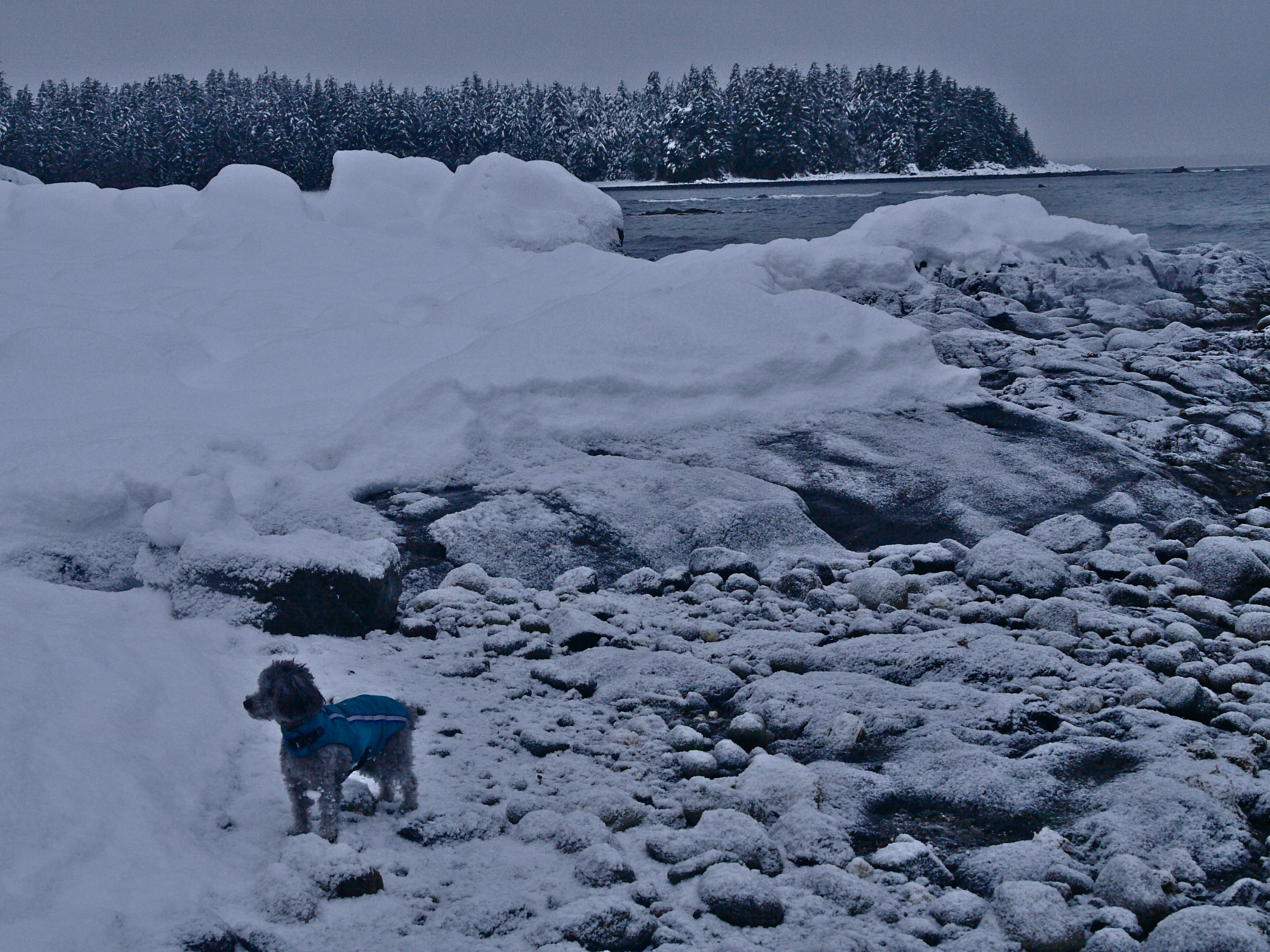 Walking through a forest of trees accumulating then releasing their snow burdens we made it to the sea where the high tide pushed a thick strip of cream colored water onto the beach. I considered and rejected many fanciful explanations for this snow white water—surplus milk dumping, silly practical joke, environmental disaster. The answer was simply a matter of timing. Last night’s storm struck at low tide, allowing a great amount of snow to accumulated over exposed tide pools, gravel and sand. The morning’s flood lifted off the snow, then churned it with wave and swell until the near-beach water turned an opaque white.