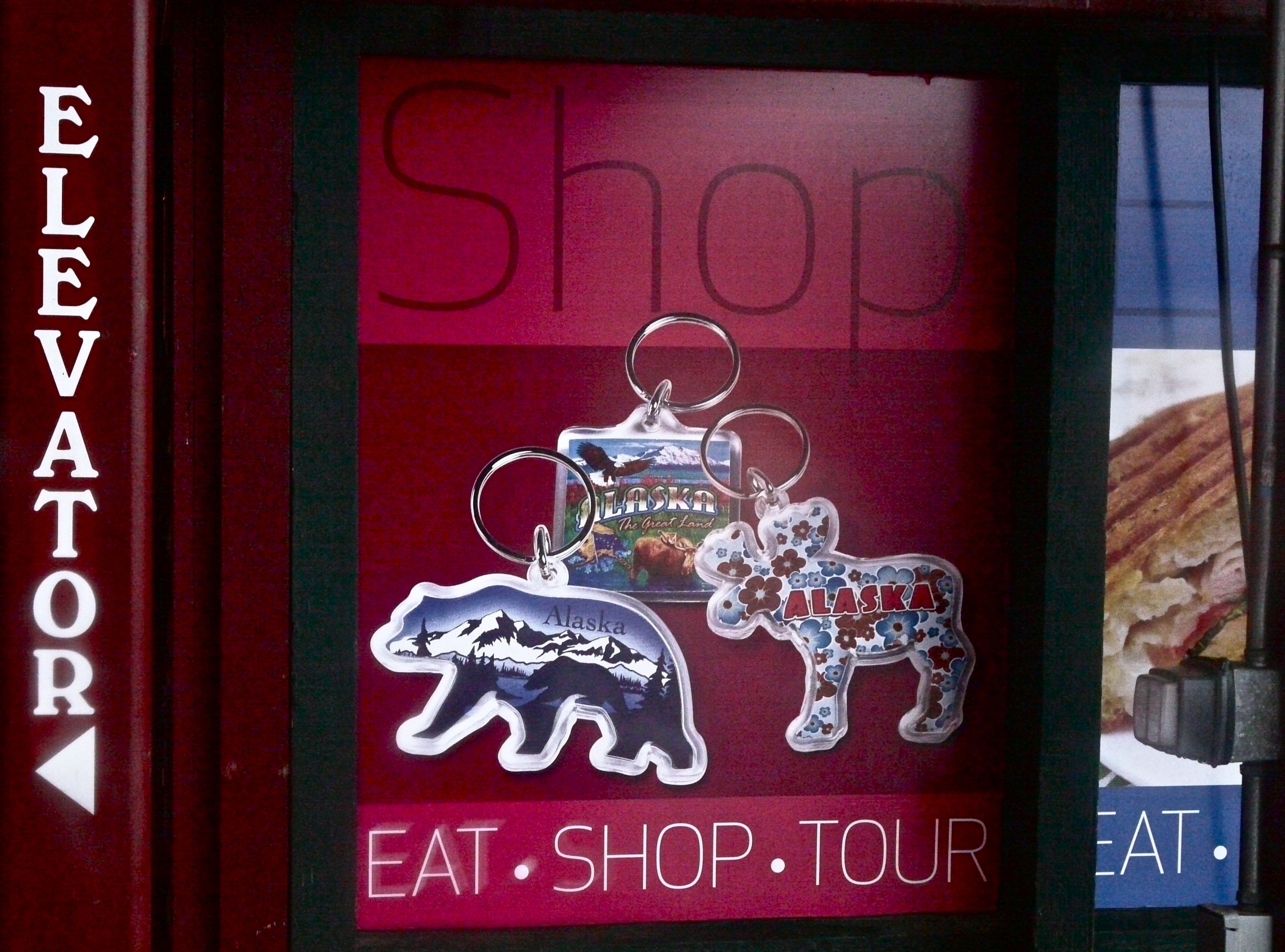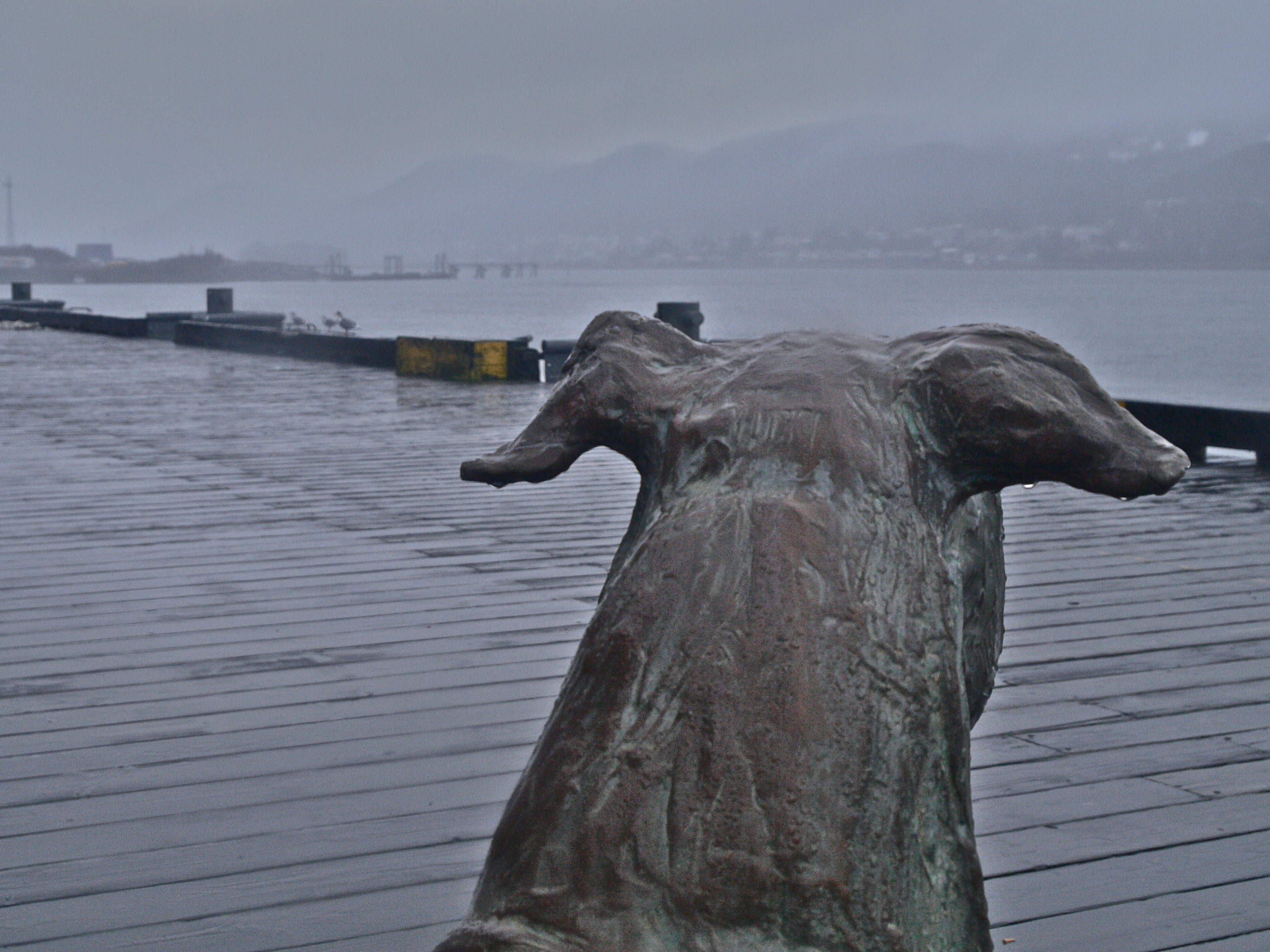 At the end of Gasteneau, we take a stairway street to a strip of South Franklin Street lined with shuttered curio shops. Brightly colored banners promise great bargains on Alaska theme tee shirts and foreign diamonds but there is no around to sell or buy the amazing merchandise. Aki pees here, then poops—for her a double benediction—more honor than the street deserves. I carry a black bag of her scat along the old Alaska Steamship Dock all the way back to town before finding a functioning garbage can. We pass the statute commemorating Patsy Ann, a punctual bull terrier who in the 1930‘s, greeted every passenger ship that tied up at the Steamship Dock. http://www.patsyann.com/story/ Today her statute stares down an channel as rain water drips off her turned down ears. When a puppy, Aki would bark at this big bronze dog. Now she ignores the statute and two gulls that strike iconic poses on nearby dock dolphins.