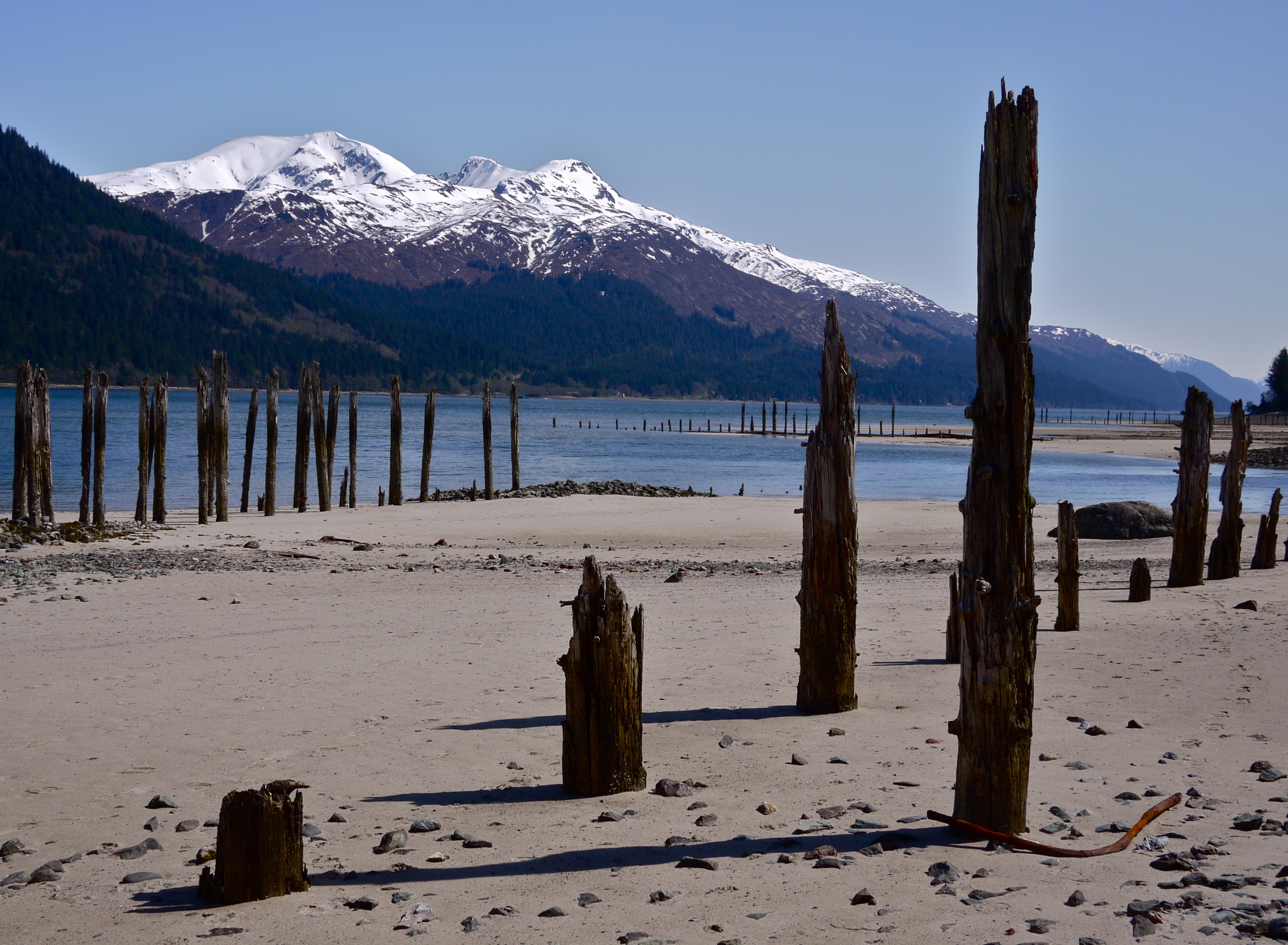 We have sun today in Juneau and warm temperatures but also wind. A sirocco blew allow our plant starts out of the greenhouse and drives me into sheltered places. This afternoon, Aki and I walk through the trees of Treadwell that grow over the ruins of the old mining town of the same name. The woods look different in sunshine, almost bleak, compared to the moist lush greenness of rainy days. Now it is a place where drama comes in the form of shadows thrown by bare trees and the intense yellow-green of skunk cabbage blossoms.