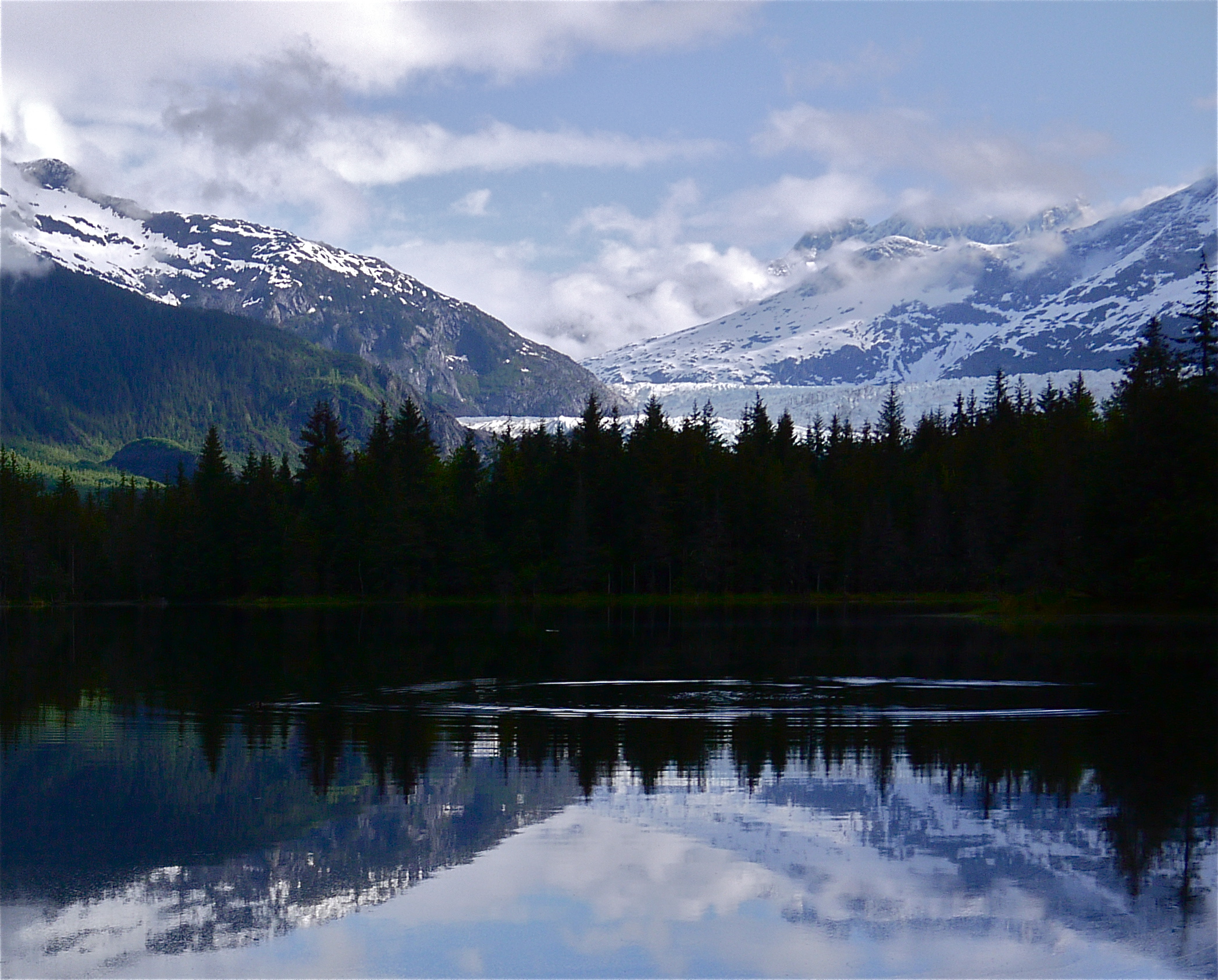 We are here before the daily startup of Juneau’s industrial tourism machines so no helicopters fly. No buses roar along the edge of the moraine. Only thrush song brakes the silence until reach a lake owned by two beavers. Aki, who fell through the ice covering this lake during an ill advised attempt to visit them one spring, whines as she watches a beaver approach. The beaver spots her and then slowly swims toward the little dog. I watch for several minutes as the beaver swims to within 40 feet, slaps the water with its tail, then continues its approach. It tail slaps the water again when much closer and then disappears.