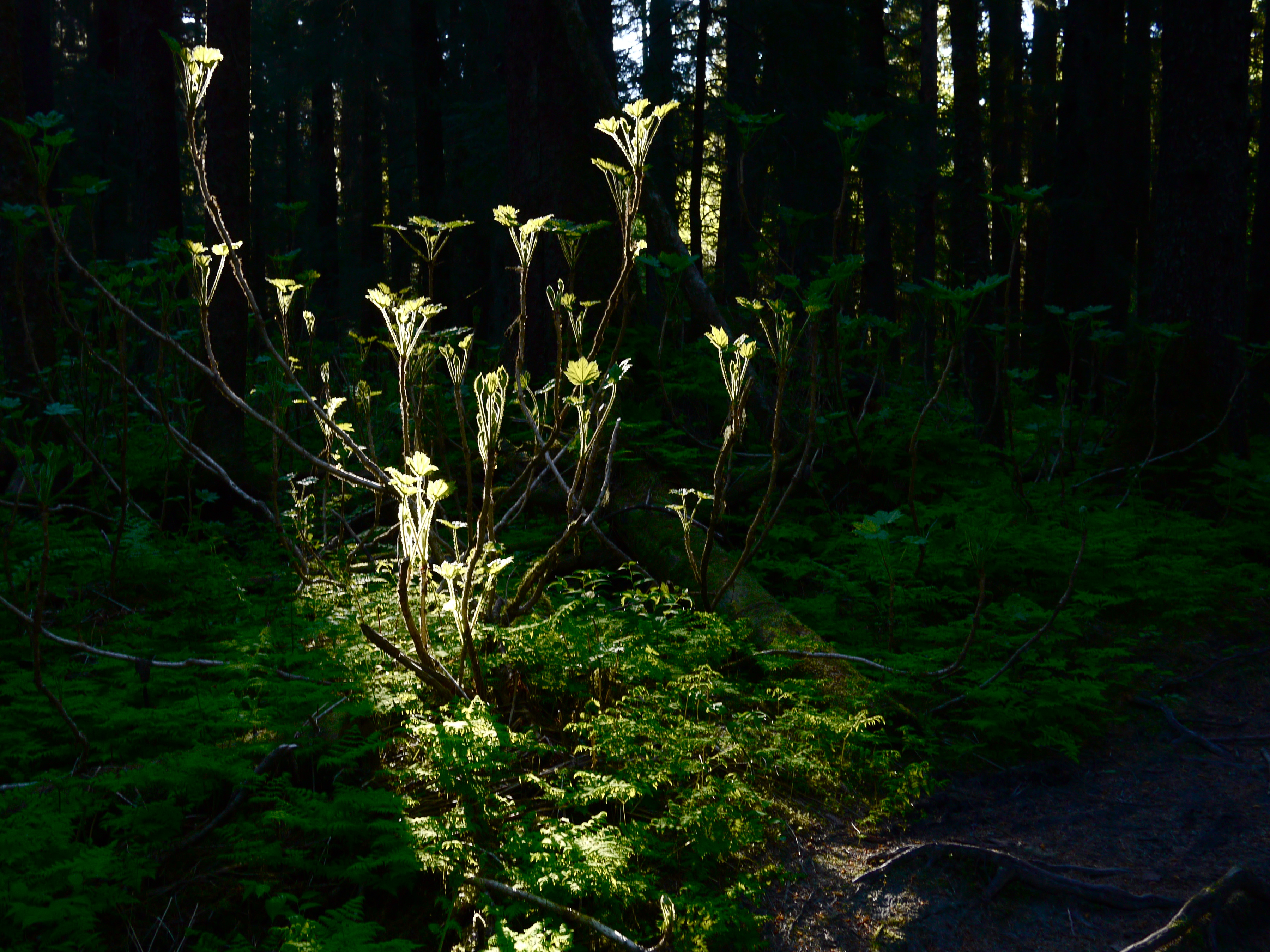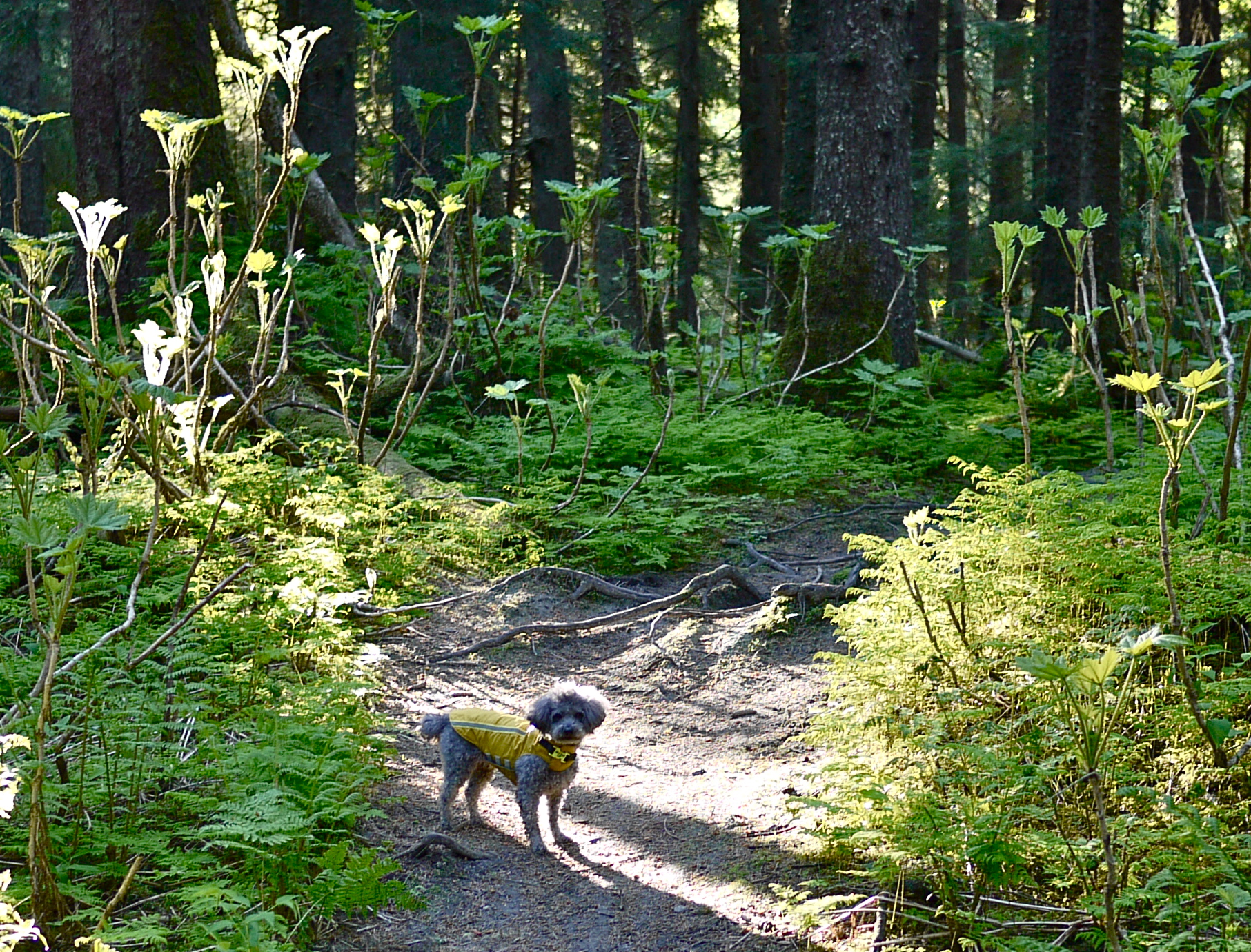 This morning an alert Aki patrols ahead then strikes a guard dog pose next to a trailside clump of devil’s club. Each branch of the thorny plant holds a chalice of spring-green leaves too porous to capture the morning sun.