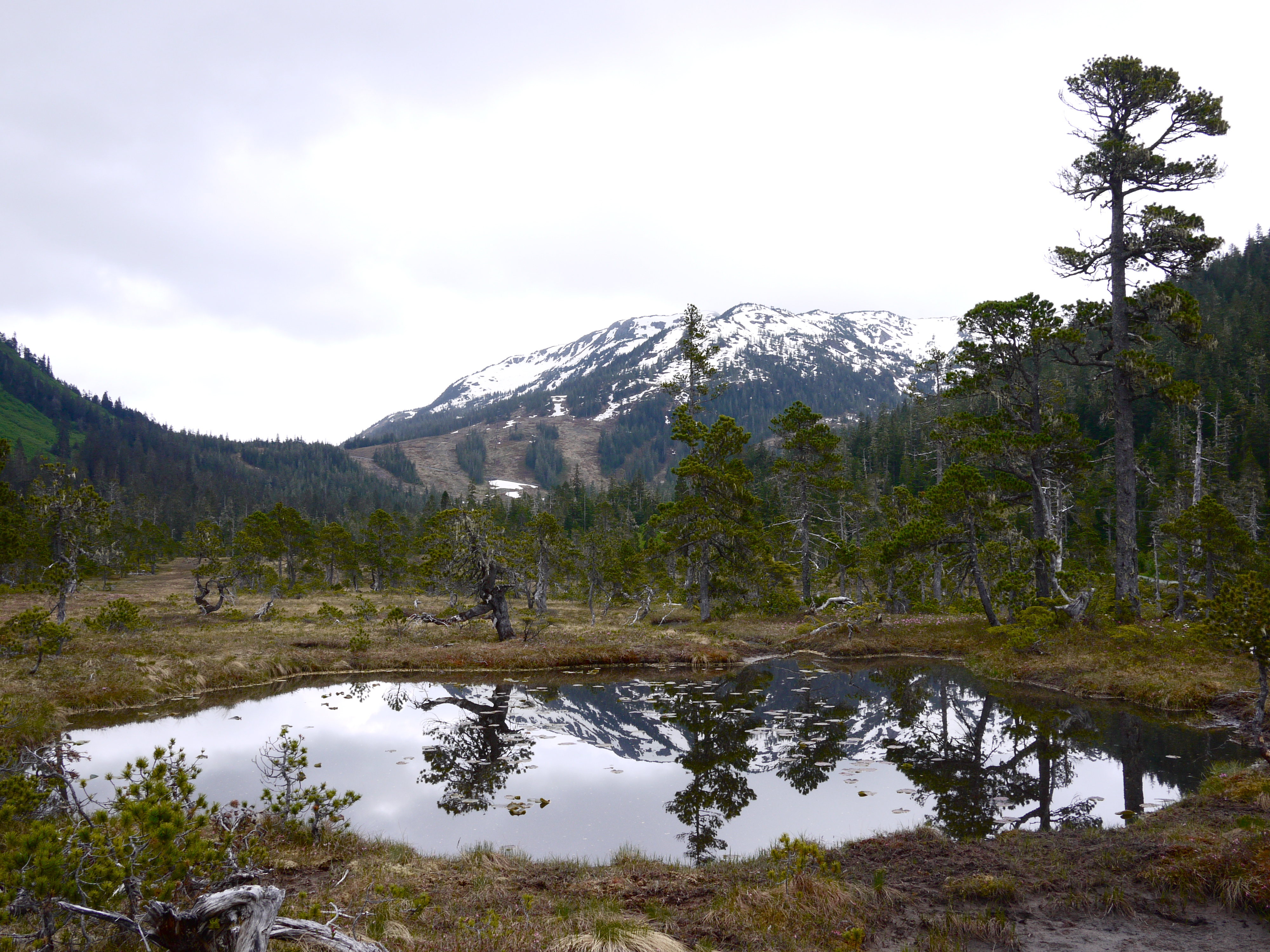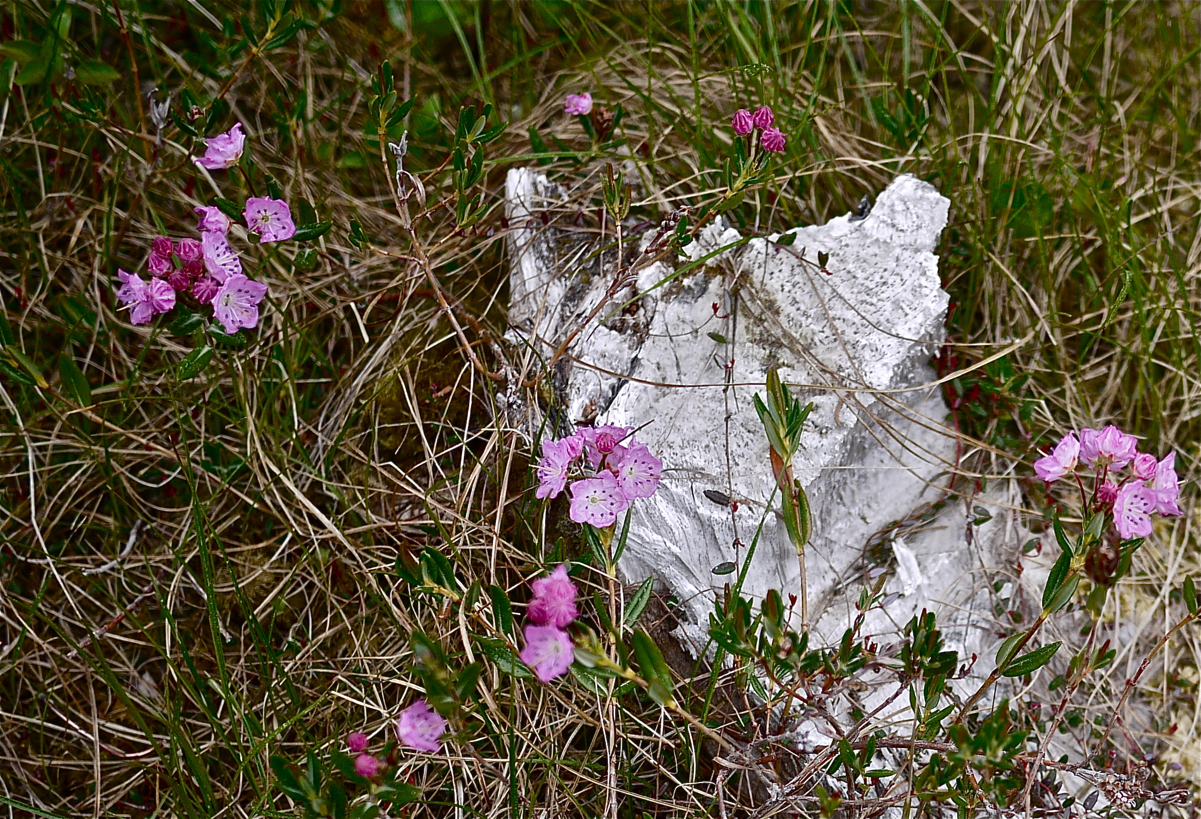 Two days of flat, grey light has diminished some of the joy of walking with Aki across this mountain meadow. Thoughts of a woman lost while hiking on a cross channel mountain doesn’t help. Not even the explosion of pink and magenta wildflowers (bog rosemary and dwarf rhododendron) lifts my spirits for the muskeg meadow they grow in is in drought. Ponds, where the reflections of mountains and British buckbean flowers can be broken by skittering water bugs are now dry. I can walk anywhere without soaking my boots.