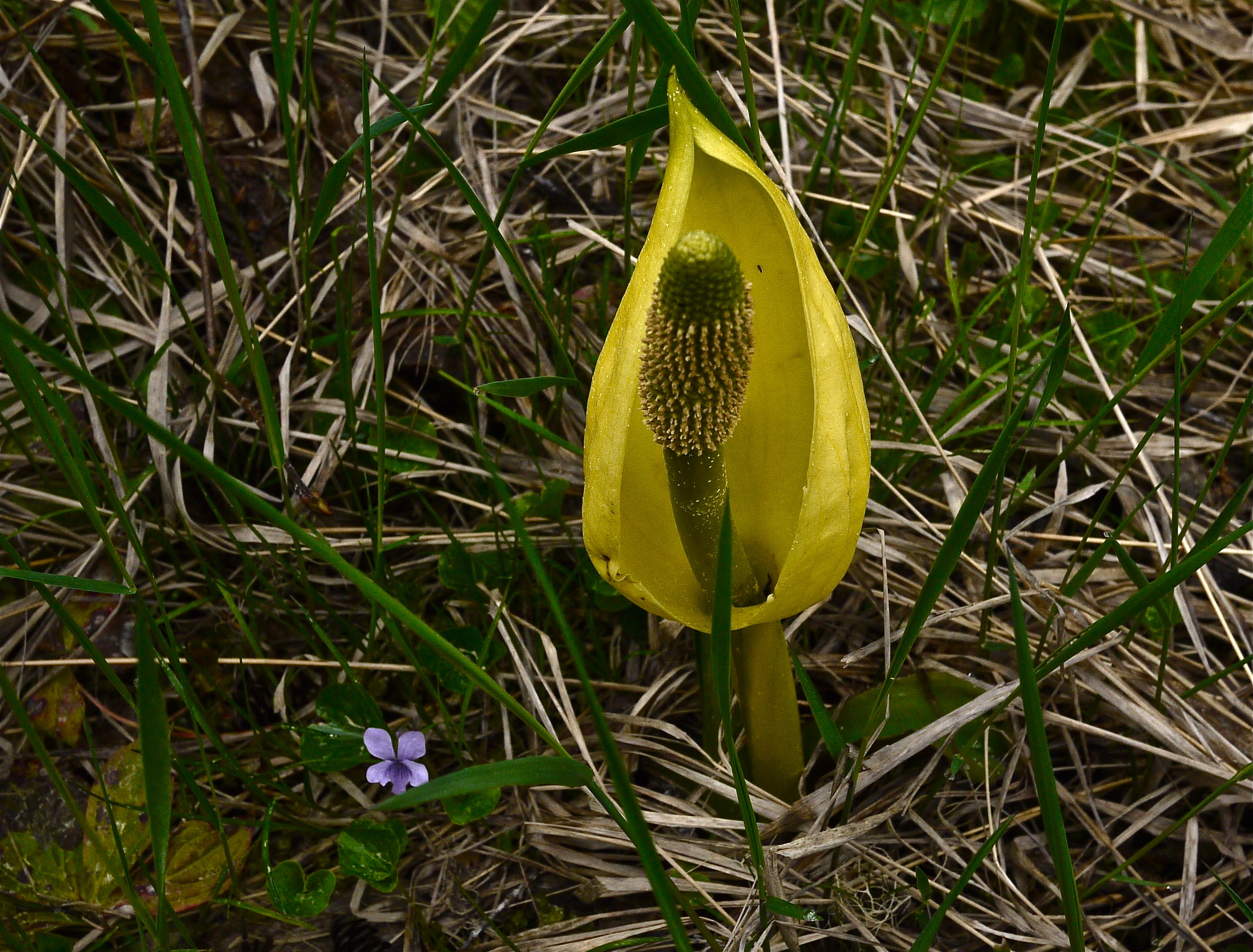 We walk down to where the trail crosses a diminished Fish Creek and turn back to the car. As the creek noise fades, I start to hear thrush song and here and there a robin making the most out of this summer day. We pass an odd pair—one purple violet and a yellow skunk cabbage flower—standing side by side, but a discrete distance apart. They could be strangers waiting for a bus or new kids killing time before school orientation begins.