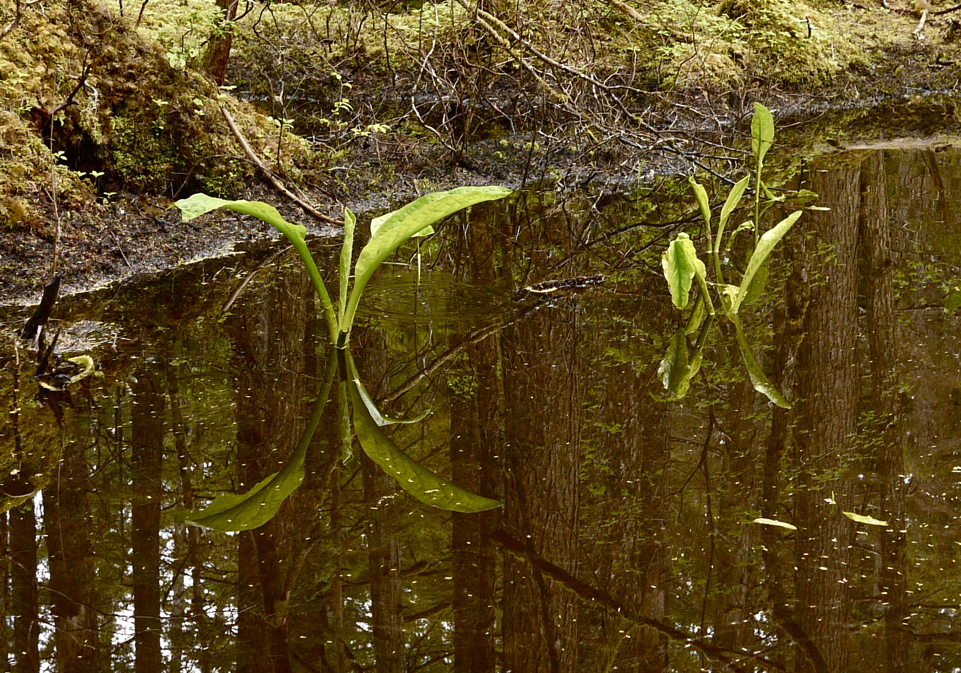 Today’s light rain has chased away everyone from the rainforest trail but Aki, my adult daughter and me. We find the forest green, its foliage still intact, yet to be wounded by hungry insects, deer, and bears. The broadleaf skunk cabbage plants are still spring supple.