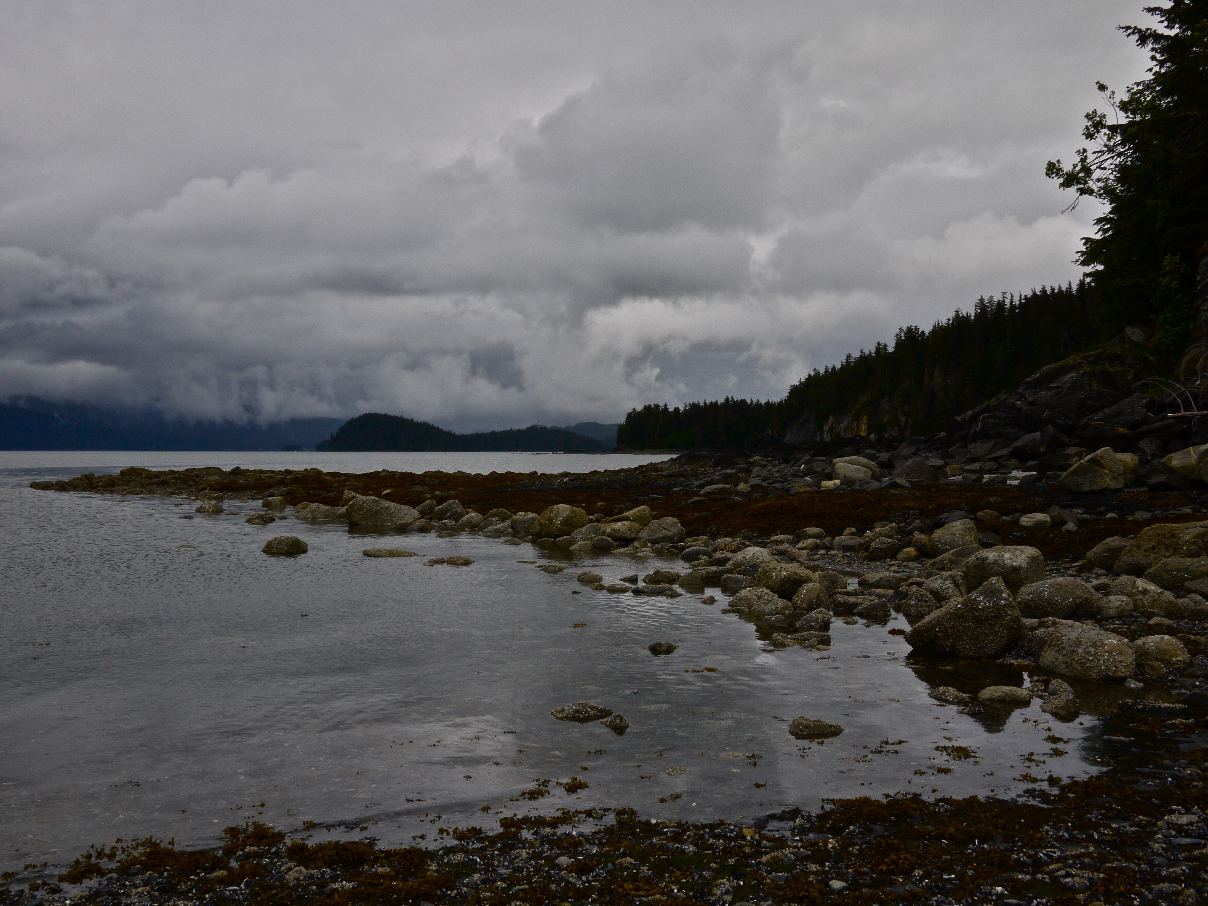 At the forest edge, Aki looks for someone to throw her frisbee so she can chase after it down the beach.She has to settle for the daughter skipping rocks over salt water. We walk out a spit of land that will disappear under an incoming tide to where good flat rocks are plentiful. The path is still two feet above water so I don’t worry about whether the tide is ebb or flood. Aki wades chest deep to better watch the rocks skip five, six, sometimes ten times before sinking. I watch too and remember how I watched her skip rocks on beaches here and in Ketchikan for more than 20 summers. Distracted, I don’t notice the tide cover our escape route until it maroons us. We have to wade through ankle deep water to reach dry land.