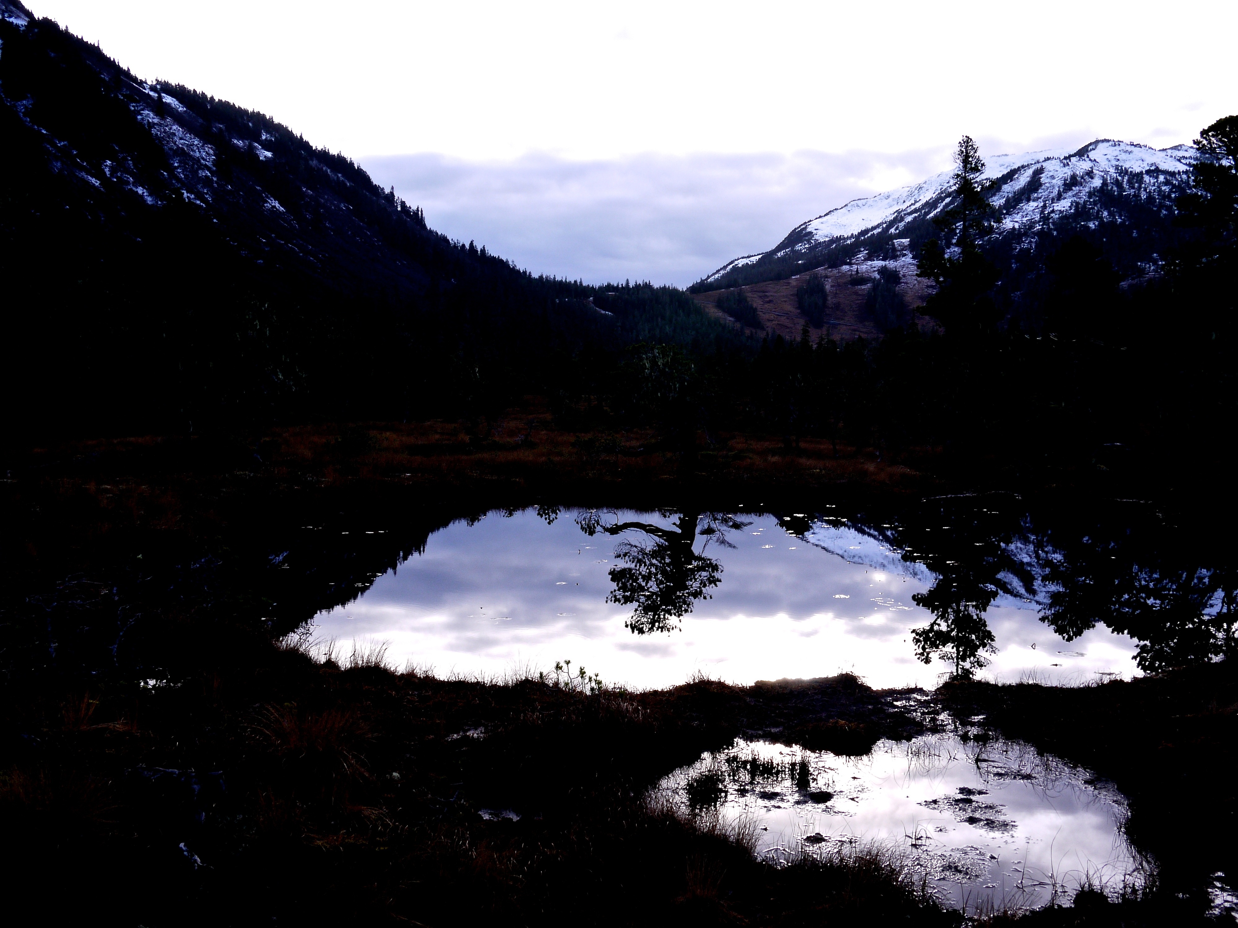 The yellow light still shines on the meadow when Aki leaps out of the car but fades to gray before I’ve taken more than a few photographs. Sunlight will blink through for a few second at a time during our hike but only it will confuse my digital camera. Without its rich distraction I can appreciate reflections of the bordering mountain ridges in the meadow small ponds, even those broken by fading lily pads.