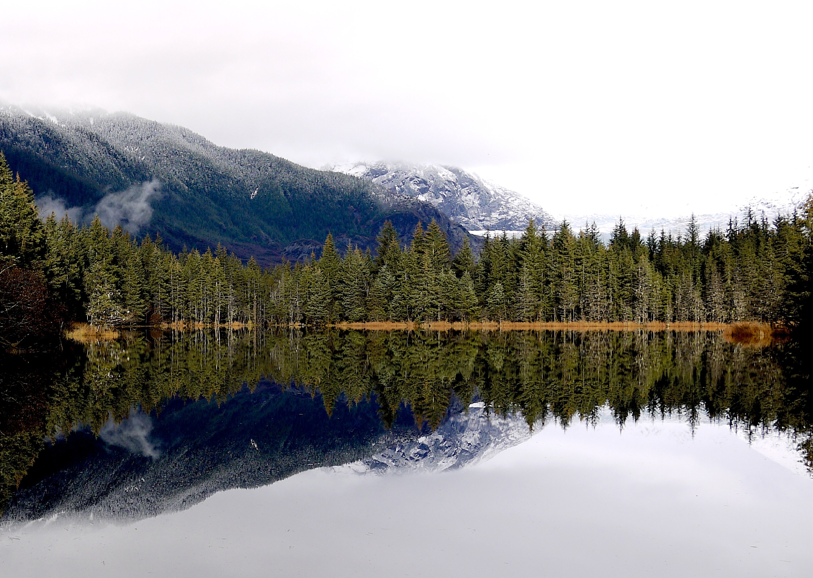 In a hiatus between rainsqualls, Aki and I cobble together an outing along Mendenhall Lake. Fall has finally buried the summer that recently lingered along the lakeshore. Gray, not falling leaf yellow is the color of the day. We’d find winter’s snow by climbing halfway up Mt. McGinnis.