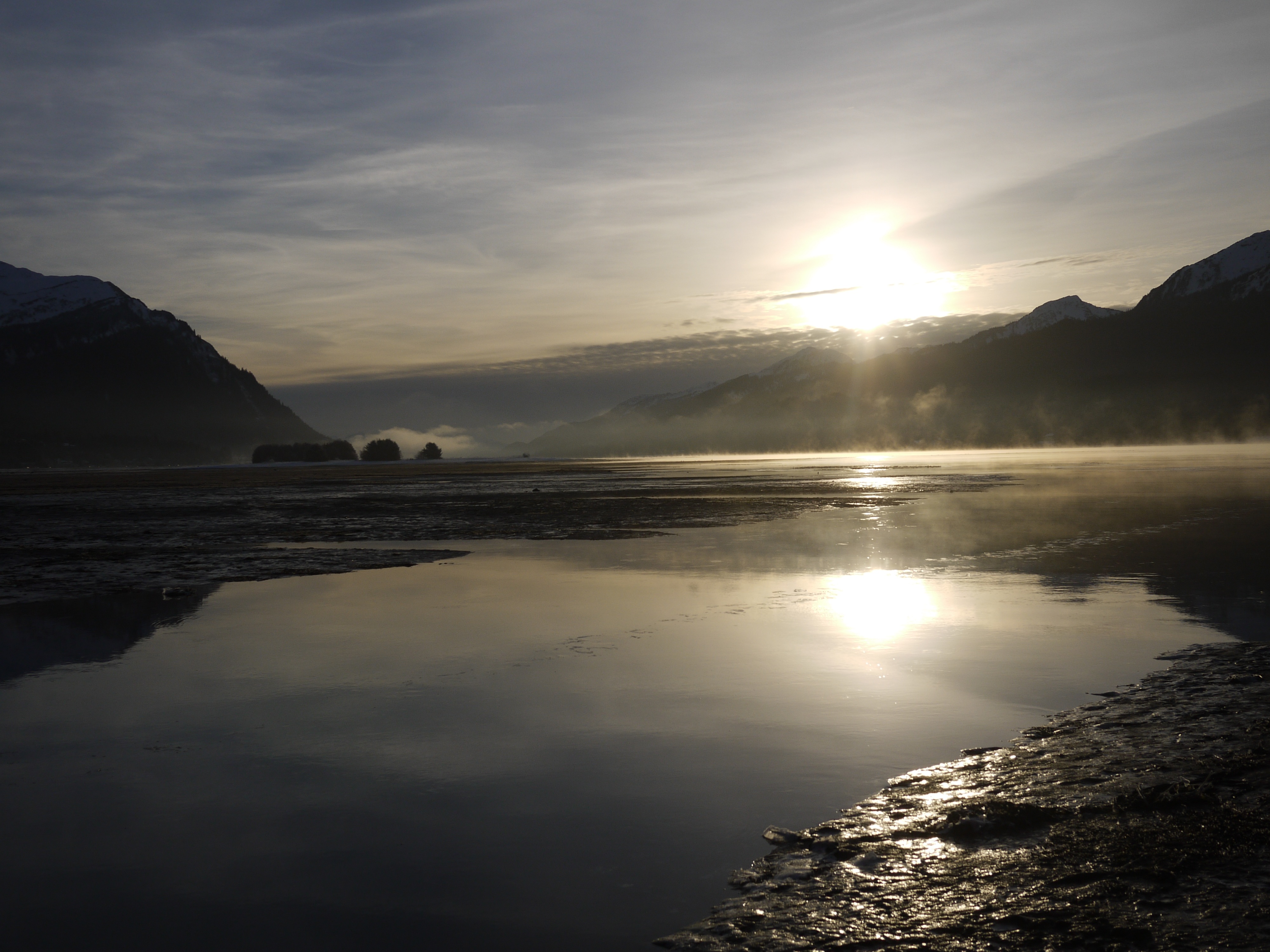 The sun does rise but so does a bank of clouds that partially blocks the light. When sunlight can break free it brightens the snow, flooding water, and surrounding mountains; making it almost painful to look at them. Then I can see how fast the tide covers the wetlands and backfills the channels we must cross to reach high ground. Time to retreat.