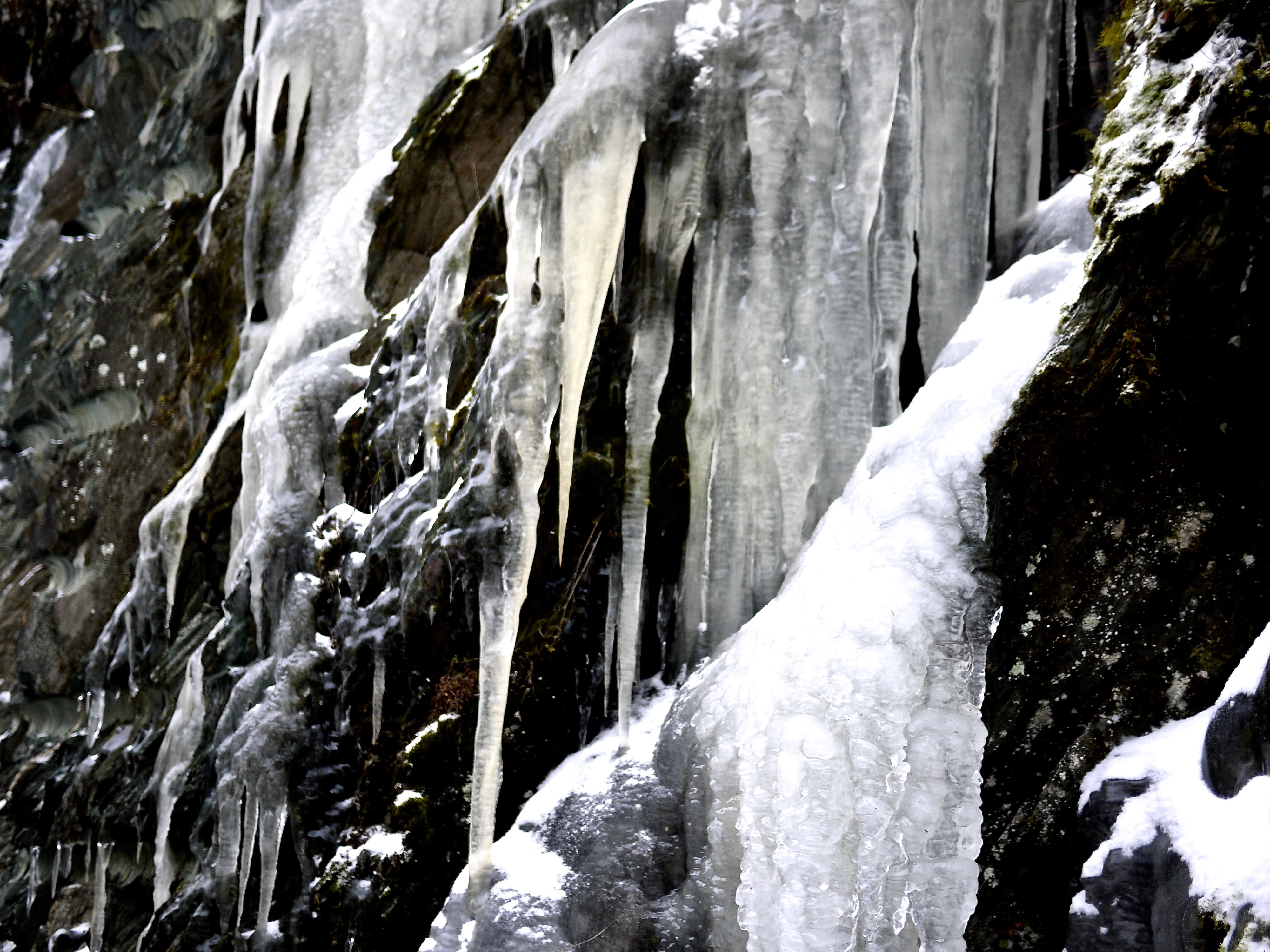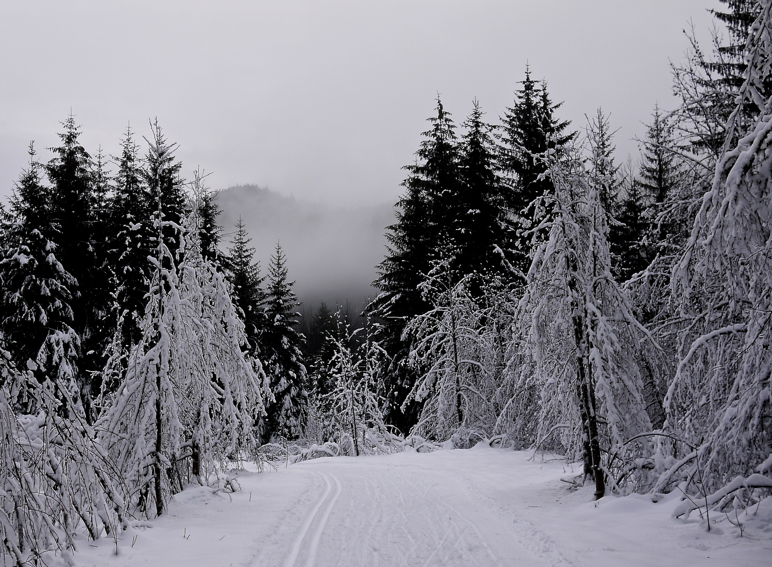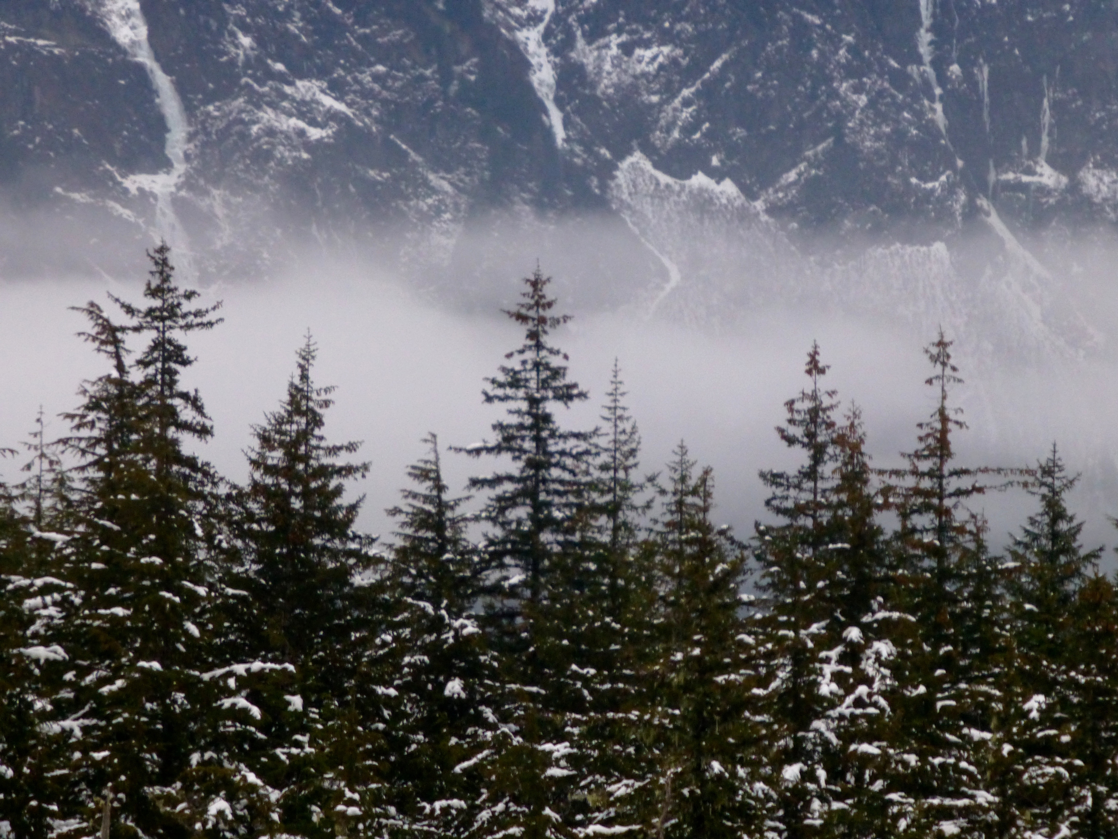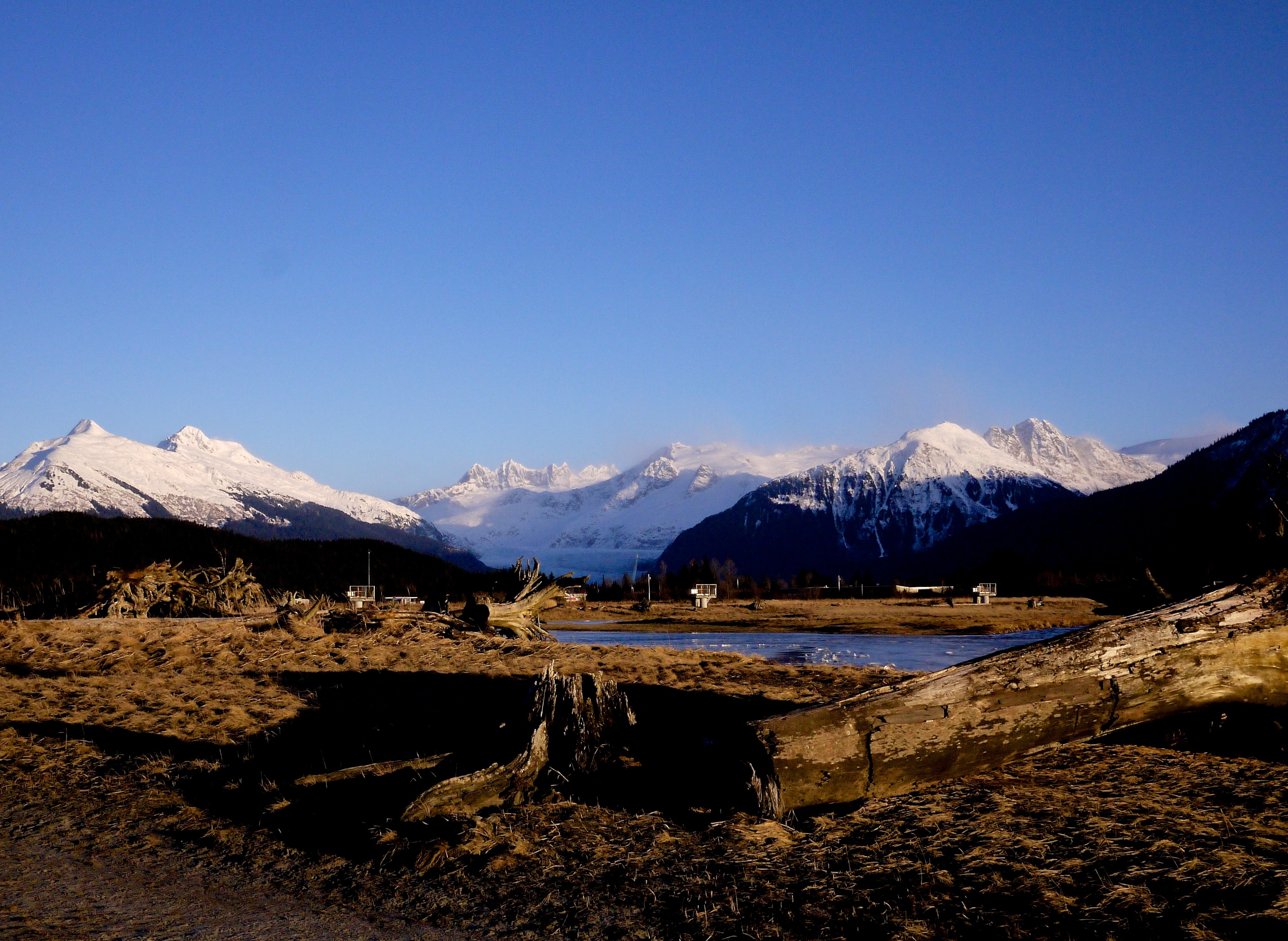 I can tell no one has walked this moraine trail for a while. My boot cleats are the first to chip the trail’s hard, slick ice. My admiration for the effective cleats is exceeded only by a fear that the worn rubber strapping will snap. After side slipping a couple of times Aki now travels on the trail margin where the ice tapers onto bare ground or snow. Smart dog. Mt. Fog blocked all mountain views when we entered to the moraine but is melting away into the spruce covered hills. Through breaks in the trailside alders I can see Mt. McGinnis, its snowy outline barely contrasting with the white sky. We are heading to a frozen mud bar on the Mendenhall River that offers an unencumbered view of the mountain.