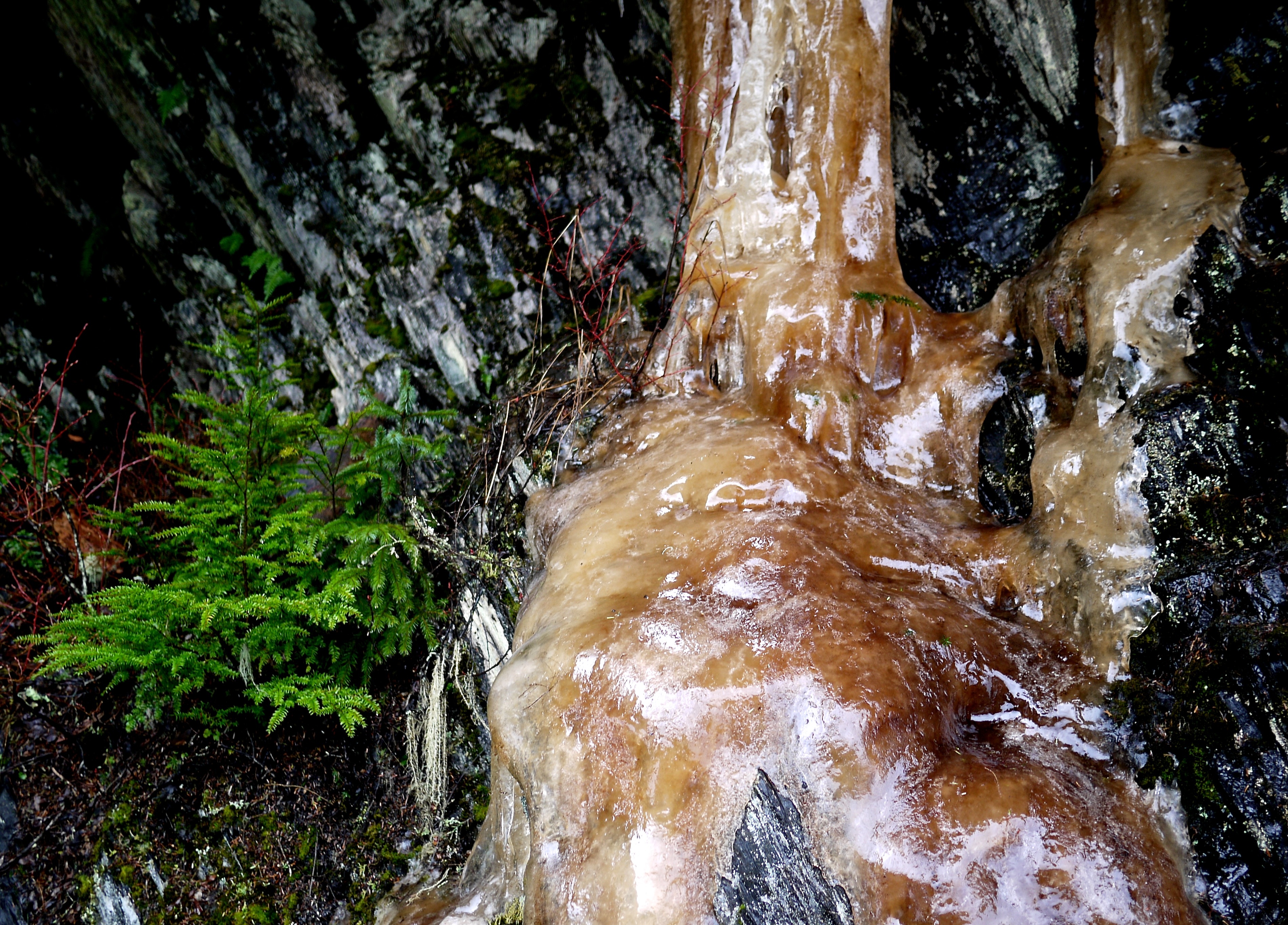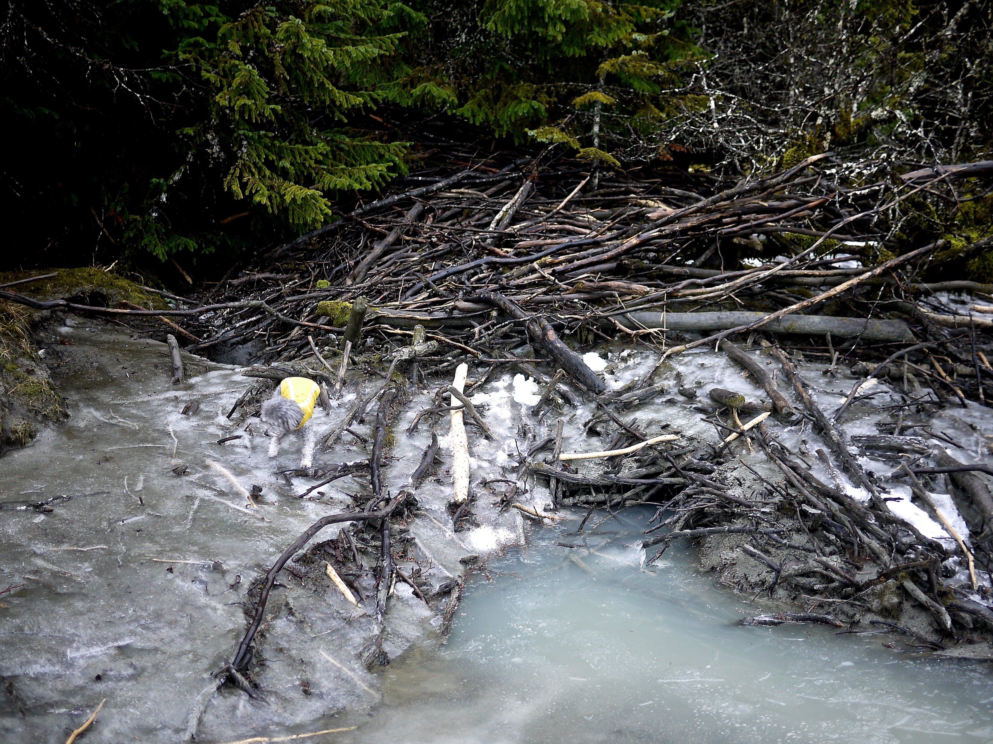 With the white sky, flat light and narrow variation in hue, the scene is a disappointment. But, when I follow Aki down the mud bar we find a beaver lodge, its three entrances open and apparently unprotected. My little dog sniffs around a bit and pees the beavers a greeting. I can’t see evidence of that a predator tried to dig its way into the lodge but the paths up to the entrances look well used. No wonder the moraine beaver population seems to be expanding. Aki and I pass the beaver’s current logging plot on the way back to the car and are startled by two splashes made by the day crew.