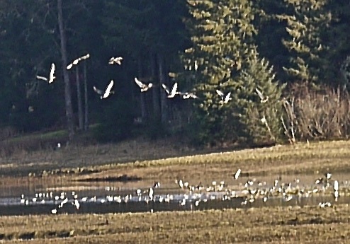 The varied thrush told me it is spring, as did the warmish temperature, sun, and a brace of eagles circling low over Chicken Ridge. The eagles warned that it is also a time of famine for the big birds by hunting cats in the neighborhood. Aki and I headed to the Fish Creek delta to check its grassy wetlands for migrating waterfowl.