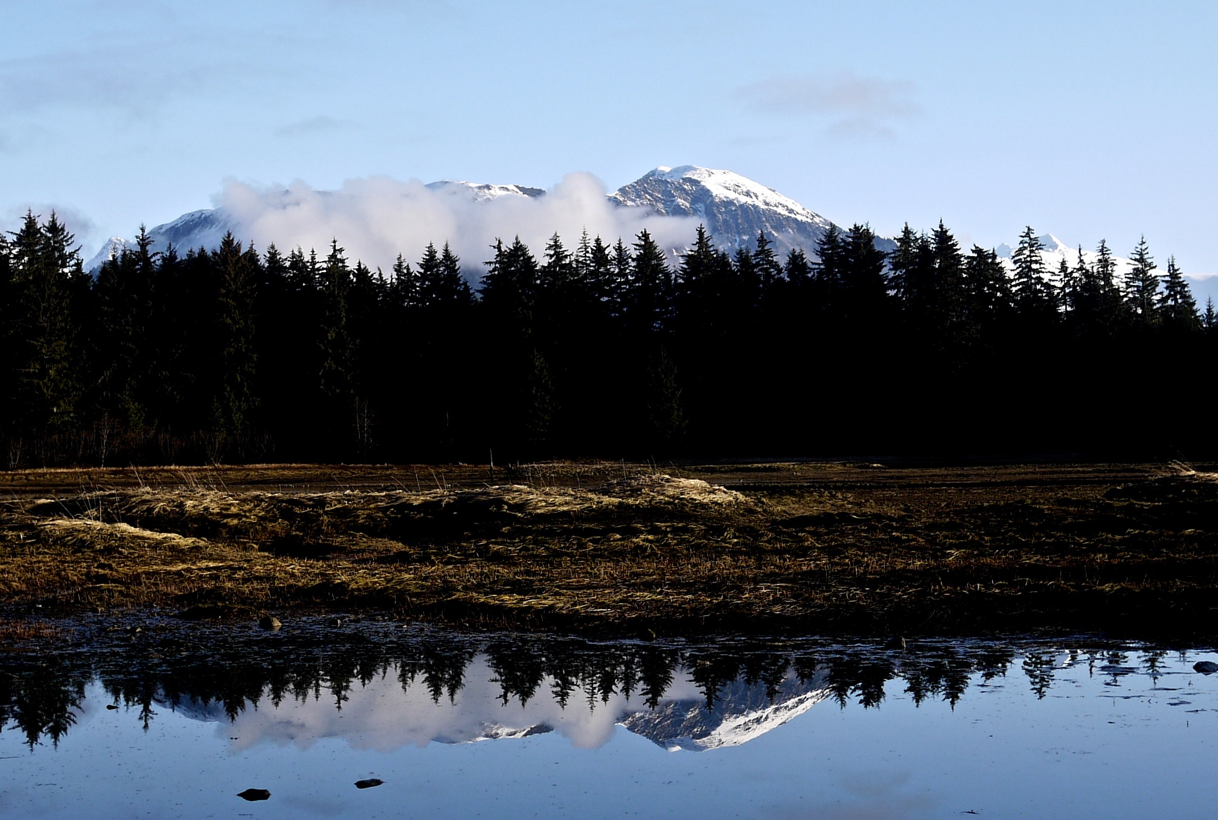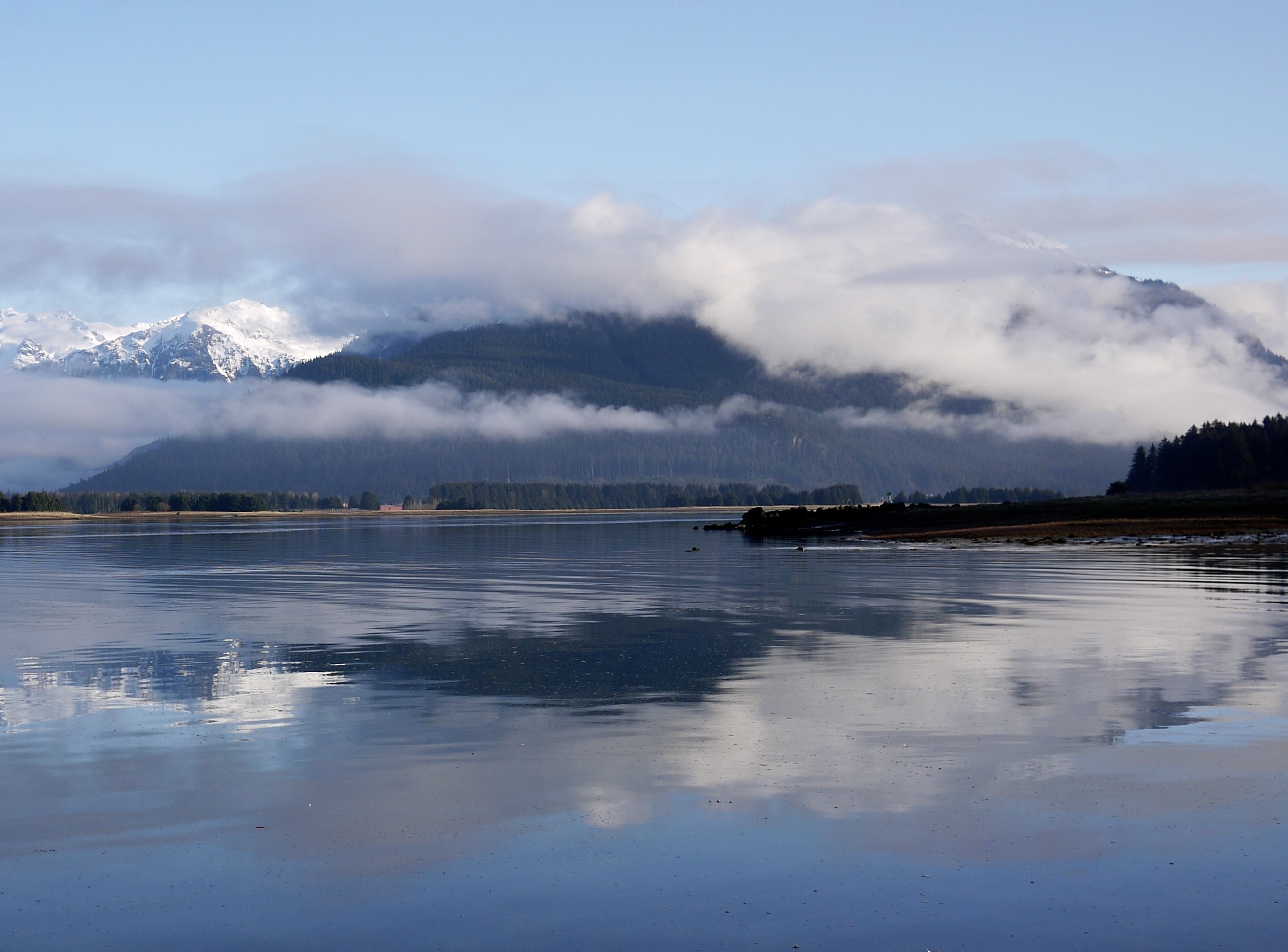 As punishment for displacing the birds, I find the glacier hidden behind clouds. Maybe it is not punishment. The clouds reveal enough of the ice field mountains to create beautiful reflections in the waters of Smuggler’s Cove.