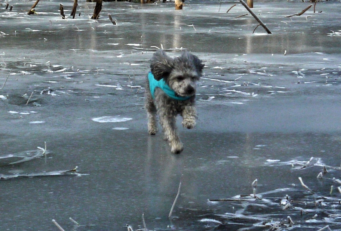 The snow is gone but a strip of smooth ice covers the trail. I slide down it while Aki checks the peemail. She sniffs something on one of the beaver dams near Norton Lake and then starts a wide sweep of the area. When a tree crashes onto the frozen lake, the little dog flies across the ice to investigate. I grow uncomfortable waiting for her to return, thinking about what a beaver’s teeth can do to a tree trunk. But Aki dashes onto the ice before I can head over to the beaver’s logging site.