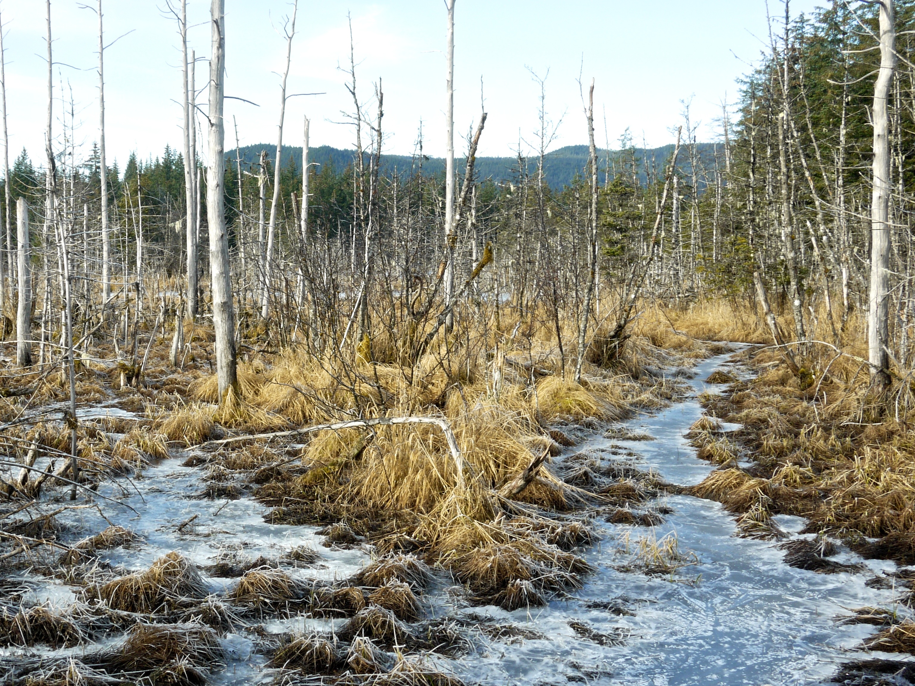 Aki and I pass some new fallen alders along the glacial moraine trail. Large wood chips, marked by beaver teeth, surround the resulting tree stubs. We never heard or seen a beaver drop a tree until today.
