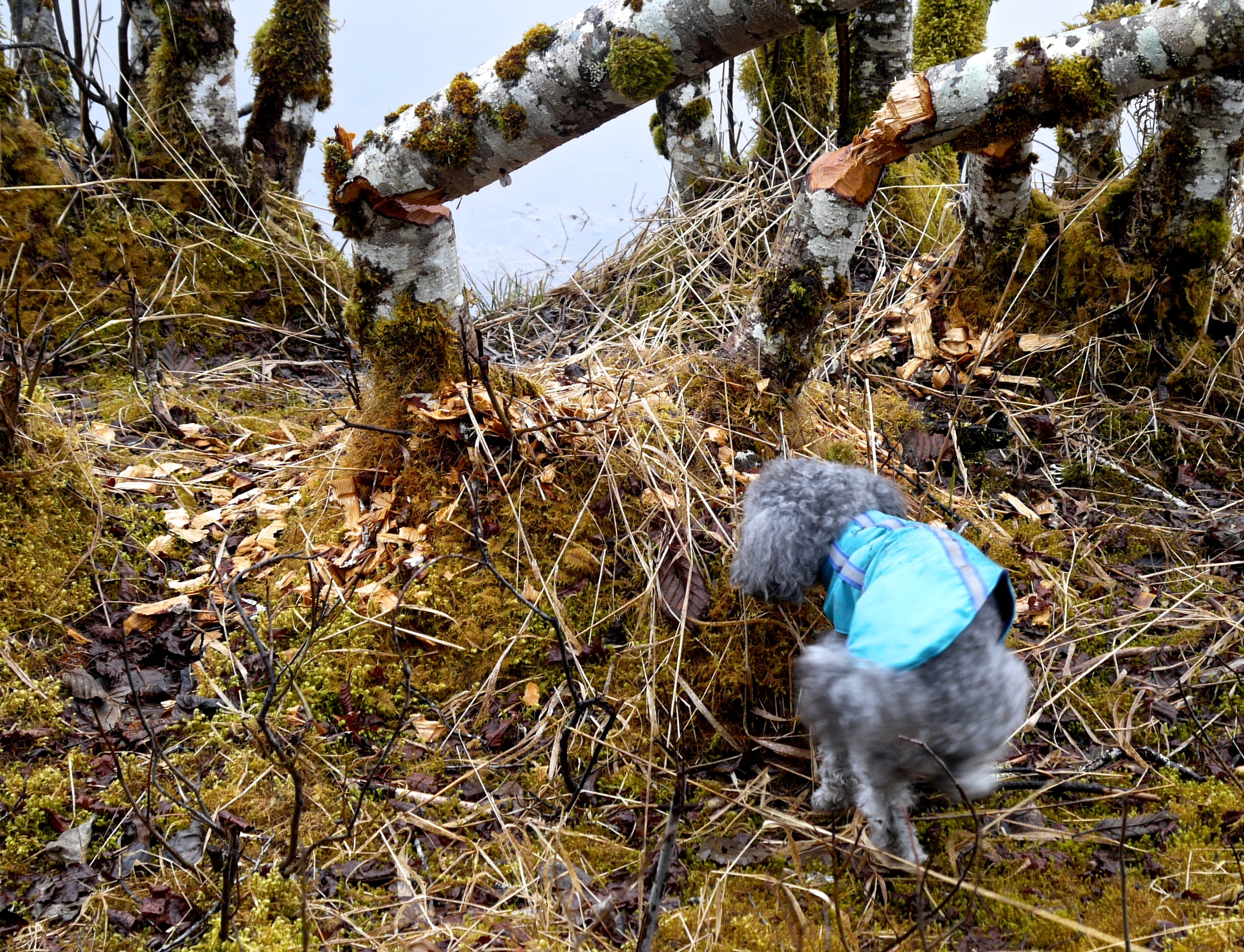 I suppose it is silly to be jealous of a beaver. But I feel a little green each time Aki rolls on a beaver trail. It’s the ecstasy that shows on her face—eyes squeezed shut with pleasure, lips curling up in a contented smile. She is ecstatic today with beaver sign spread everywhere we walk on the glacial moraine. Since our last visit the beavers have been reduced to logging alder trees along Crystal Lake. They have dropped and stripped the bark off of most of the lakeside cottonwoods. Only ones with trunks protected by wire fences stand. My resentment changes to concern when I think of the hard times ahead for the big-toothed rodents.