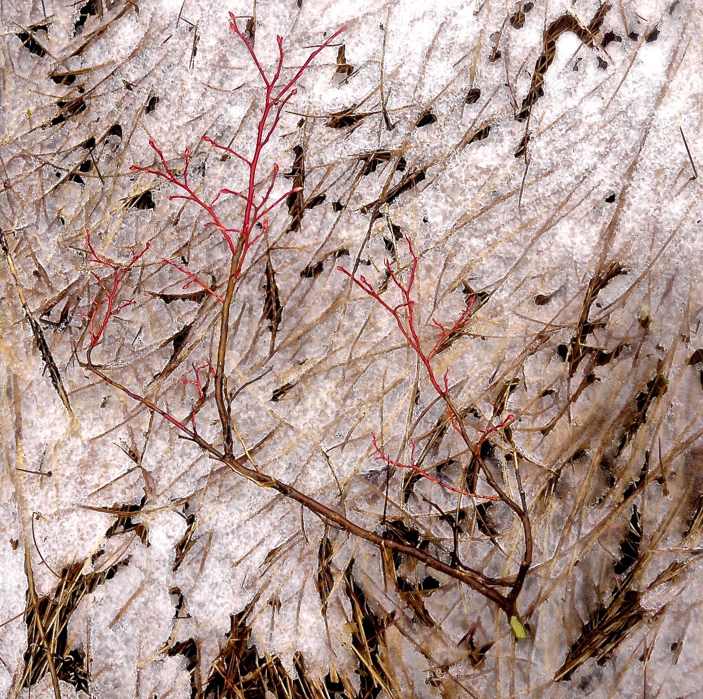 I carry home the limb of a blueberry bush. It’s leaf buds swell even though it has been severed from the bush. In our kitchen we will watch the leaves fill and, if lucky, enjoy creamy blossoms, each a tiny Japanese lantern swing from the maroon twigs of the branch.