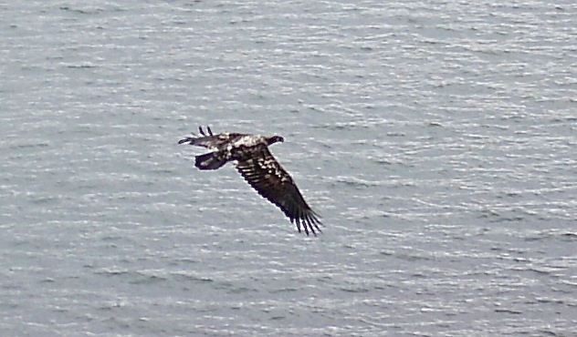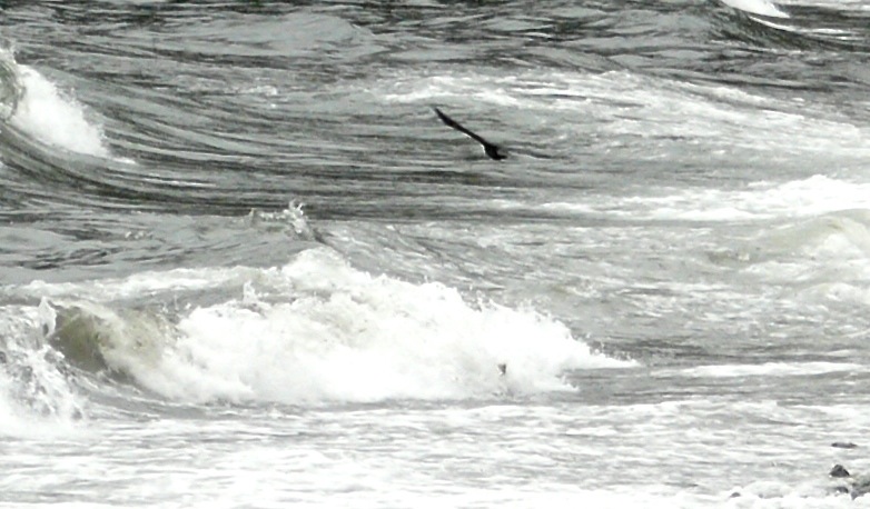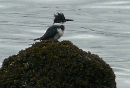 I find an old friend on the Outer Point Beach. A belted kingfisher watches from a perch on offshore rock as Aki and I emerge from the old growth. Aki and the bird ignore each other. He might be ignoring me as I walk slowly toward him to get a better photograph. I love this bird with its spear of a bill and mullet topknot. I like his feisty verbal challenges and goofy way he flies: up with a frantic beat of wings like a hummingbird then down in a dipping glide.