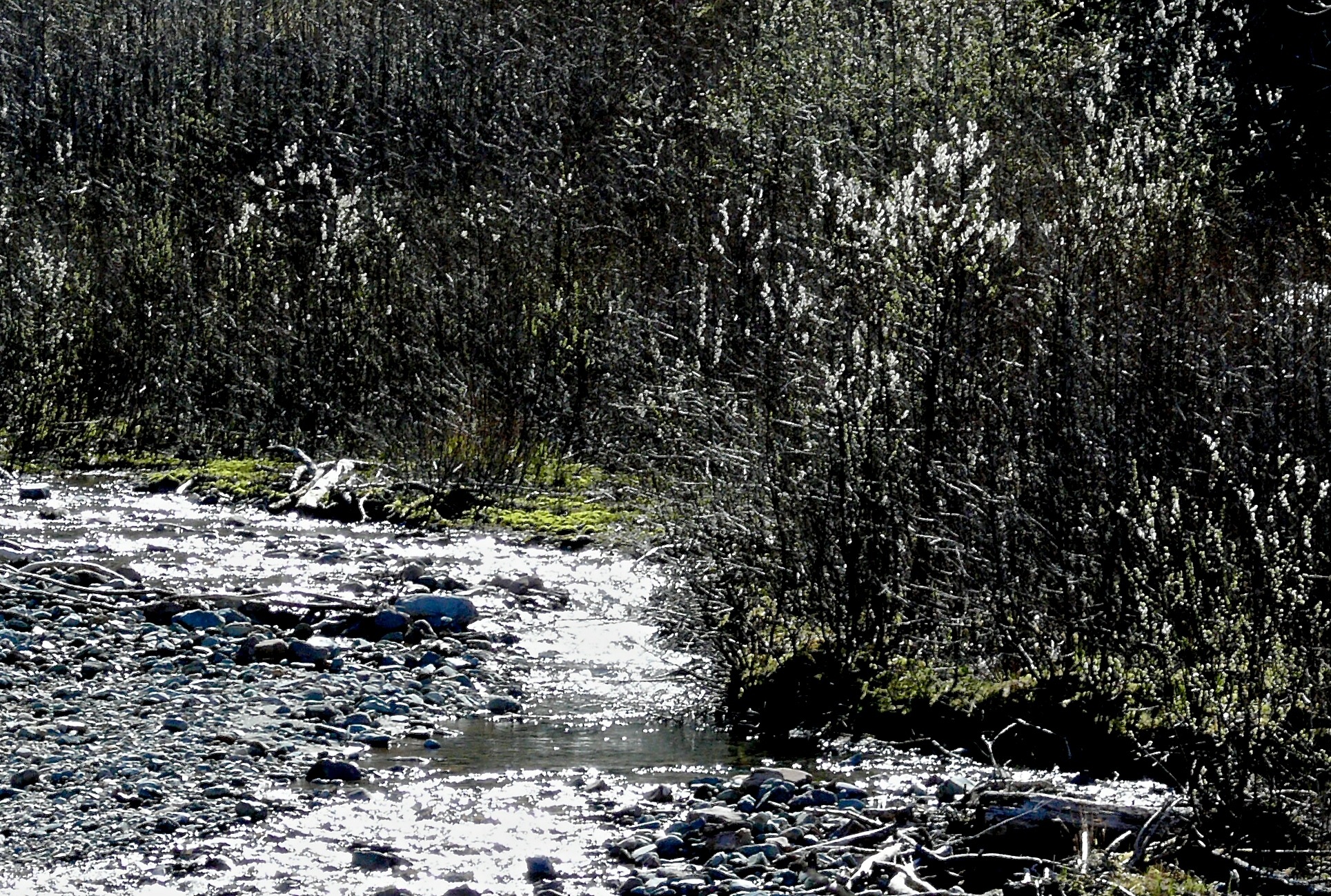 Aki, patience at an end, tugs me away from the goats and up the trail where willow catkins shimmer in strong sunlight.