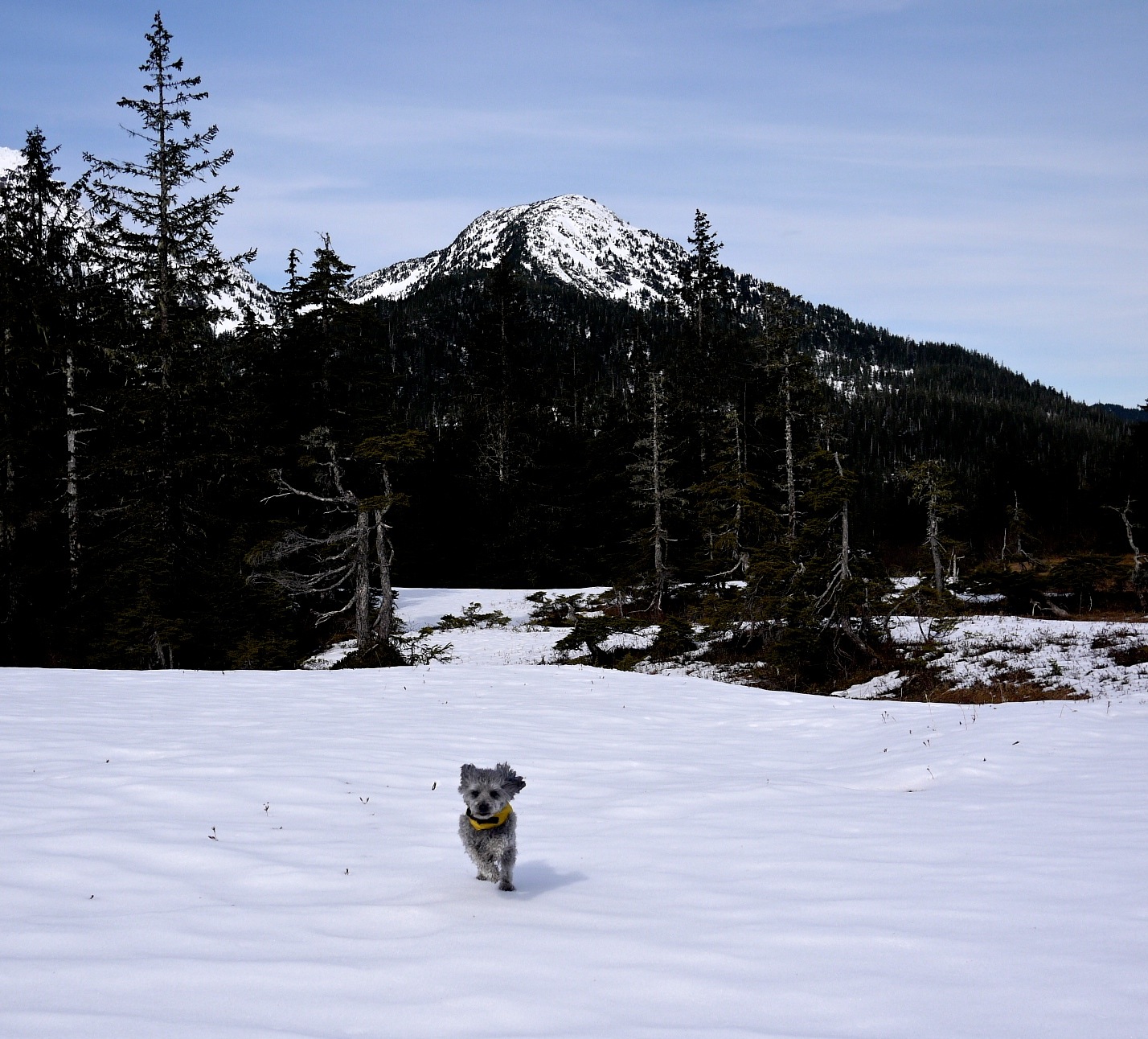 Aki and I climb a service road to a high mountain meadow that still has snow. It’s an odd morning. No one else shares the road even though its over 50 degrees and blue sky backstops mountains, each a spruce green and white quilt. There is sun but it shines through a thin pewter haze that shows no sign of dissipating. Then there is the wind, not the broad breeze that can sweep across mountain and meadow, lifting the poodle’s earflaps when she faces into it, but a wind confined like a river, to unseen channels. When we cross one of these whippy tributaries, Aki dips her head low and I use the jacket, minutes ago unnecessary in the rising heat, as shield. Powering through, the little dog and I reach a saddle covered with snow. She is hesitant to follow me onto it, as if it lay over a lightly sleeping dragon. Maybe she smells the wolf that recently left this single track toward a pocket spruce forest. When the distance between us grows to the edge of her tolerance, Aki dashes toward me. Even though I am prepared for the dash, she runs too fast for me to capture her entire body with the camera.