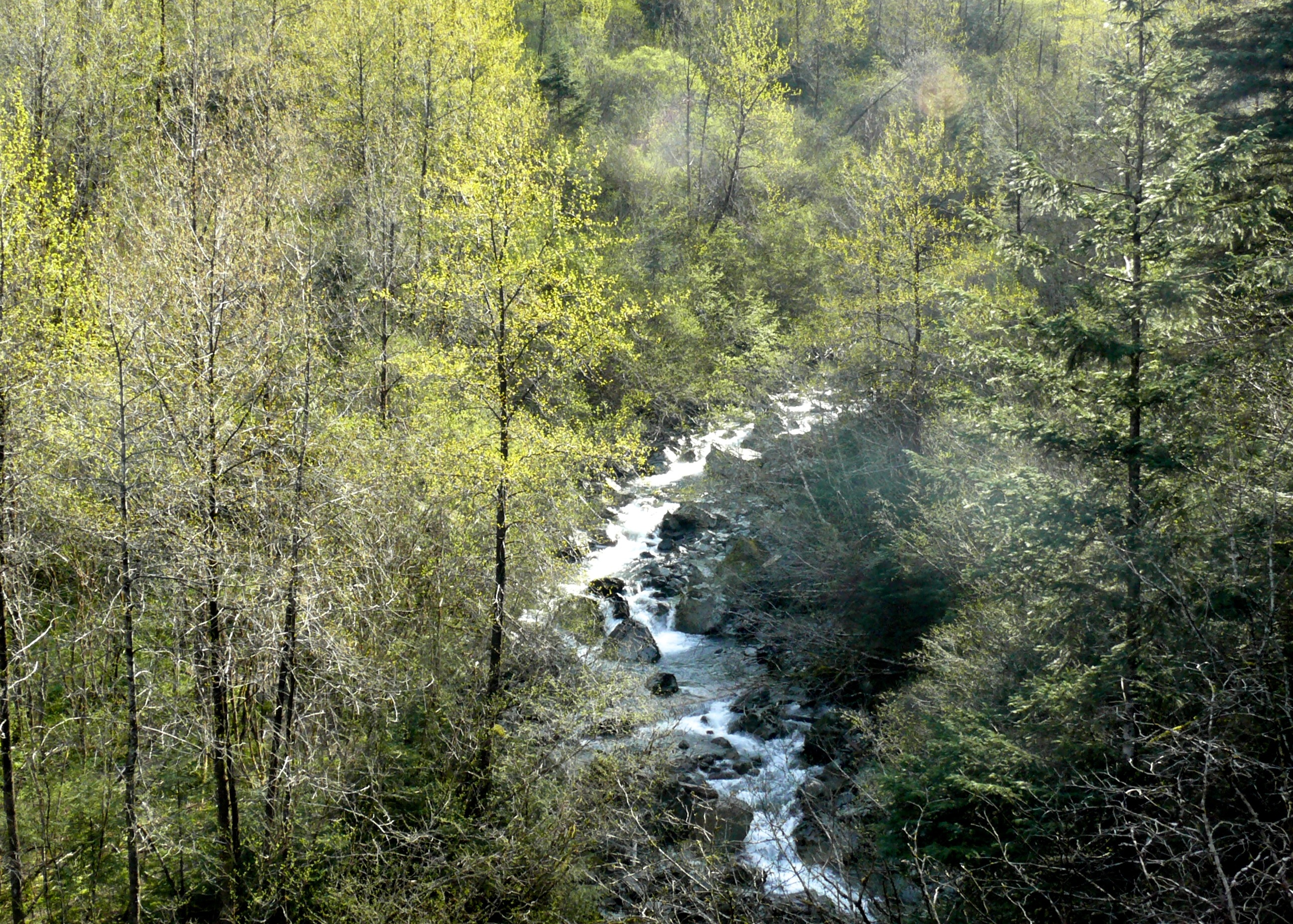 Aki and I saw a wall of sap green leaves when we reached the Basin Road trestle bridge after slowing progressing past a line of craftsmen houses built for miners 80 years ago. The little dog had to check each urinary message and great all the dogs being walked by owners about to head off to work.