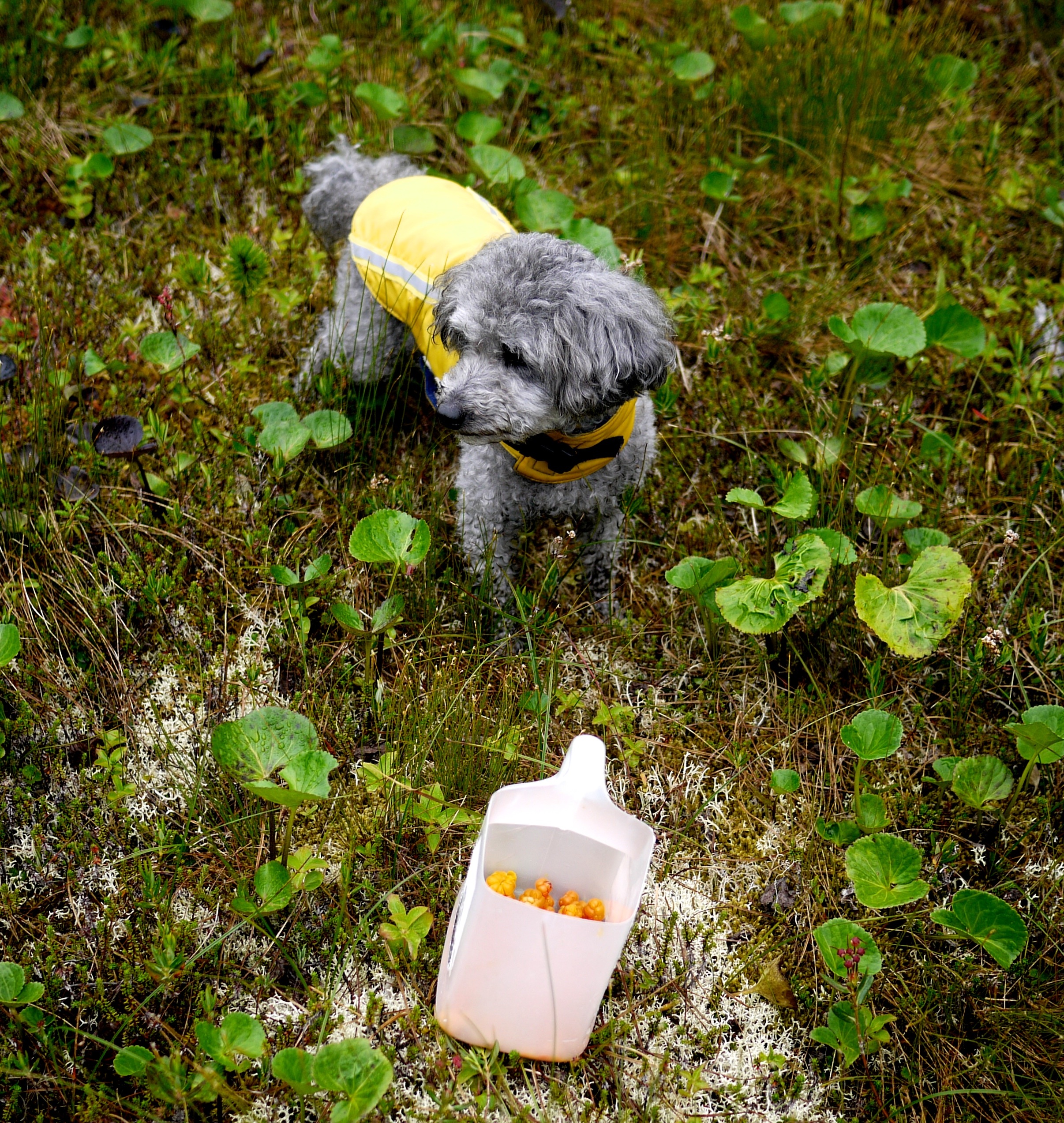 Aki and I are out the road from Juneau berry picking. The little dog’s other human and I work diligently to fill the half-gallon soy sauce containers that now serve as our berry buckets. Aki dashes between her humans with an orange Frisbee in her mouth. When she drops the disc at my feet, I’m expected to immediately send it flying for her to chase.