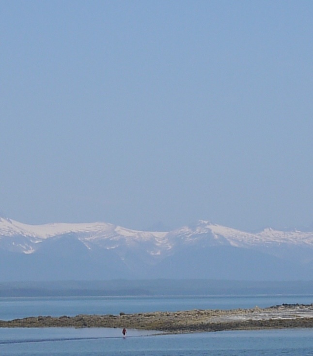 When we reached the beach, it and Lynn Canal were empty except for a skulk of crows and a woman wadding the submerged causeway that will provide a good trail to Shaman Island at low tide in a couple of hours. I thought of barefooted Irish pilgrims approaching their shrines and for some reason the lone killer whale I watched yesterday from the deck of a friend’s fishing boat. Before slipping back into the water, the big male hurled most of his body over the water surface, enough to show all of his high dorsal fin and a thick white strip that wrapped around his lower body. The whale repeated this one time and disappeared like a magician or stealthy performance artist.