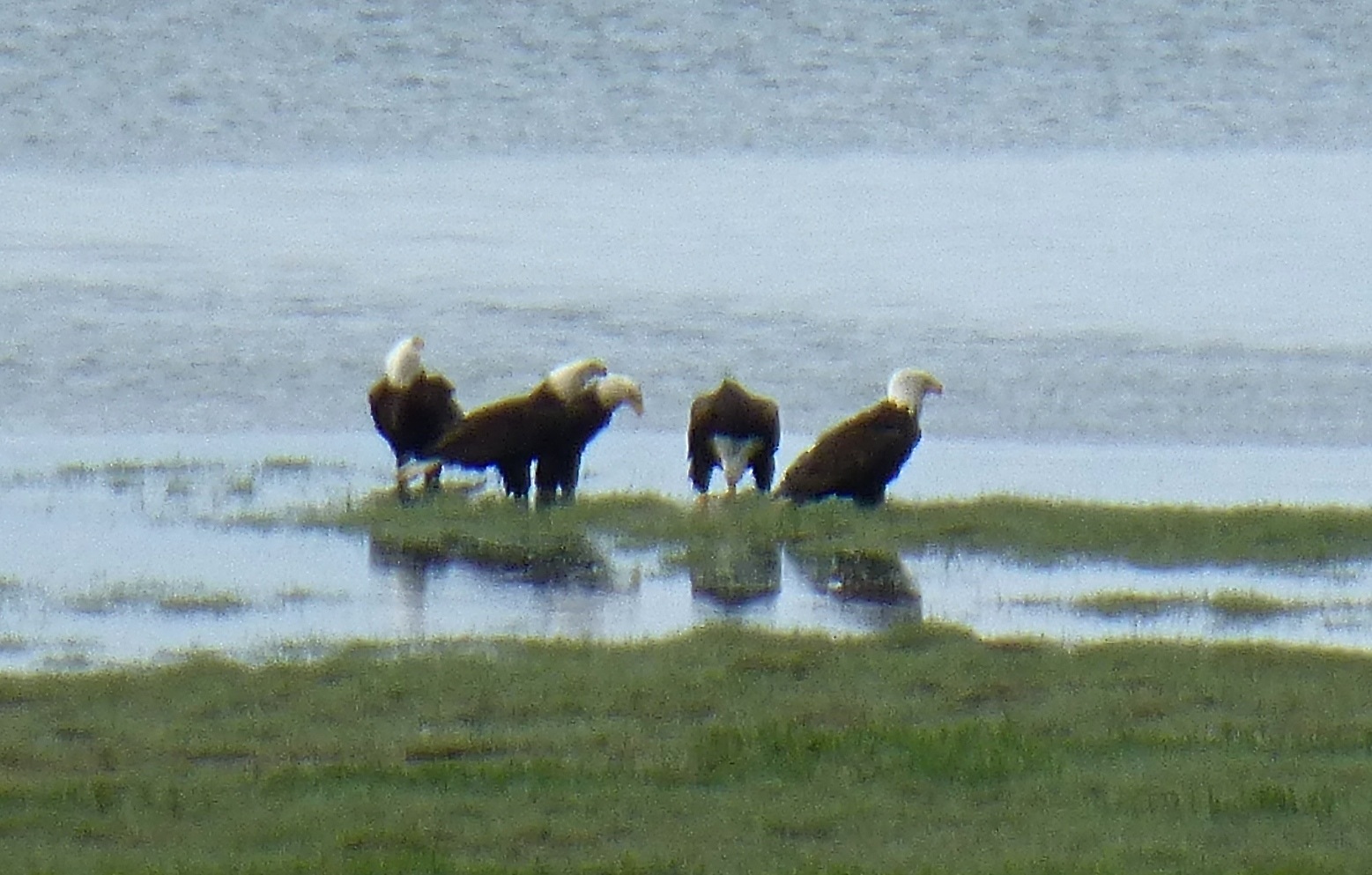 Metaphors fill my mind in between Frisbee tosses. This happens often when picking blue berries. Today mine are ornate and a little strange. When an immature bald eagle rises slowly from the beach, disheveled looking in his spotted brown coat, I see a university don with a publication history that protects him from grooming criticisms, lift himself painfully from his chair. We pass several pickers on their knees to gather low growing nagoon berries and I imagine crones searching the threshing floor for forgotten grain that just may see their families through the winter. Near the tide line five or six mature eagles hunker over a salmon carcass. Another stands erect 30 feet away. They turn into a gang of dope smoking teenagers about to rousted by the law.