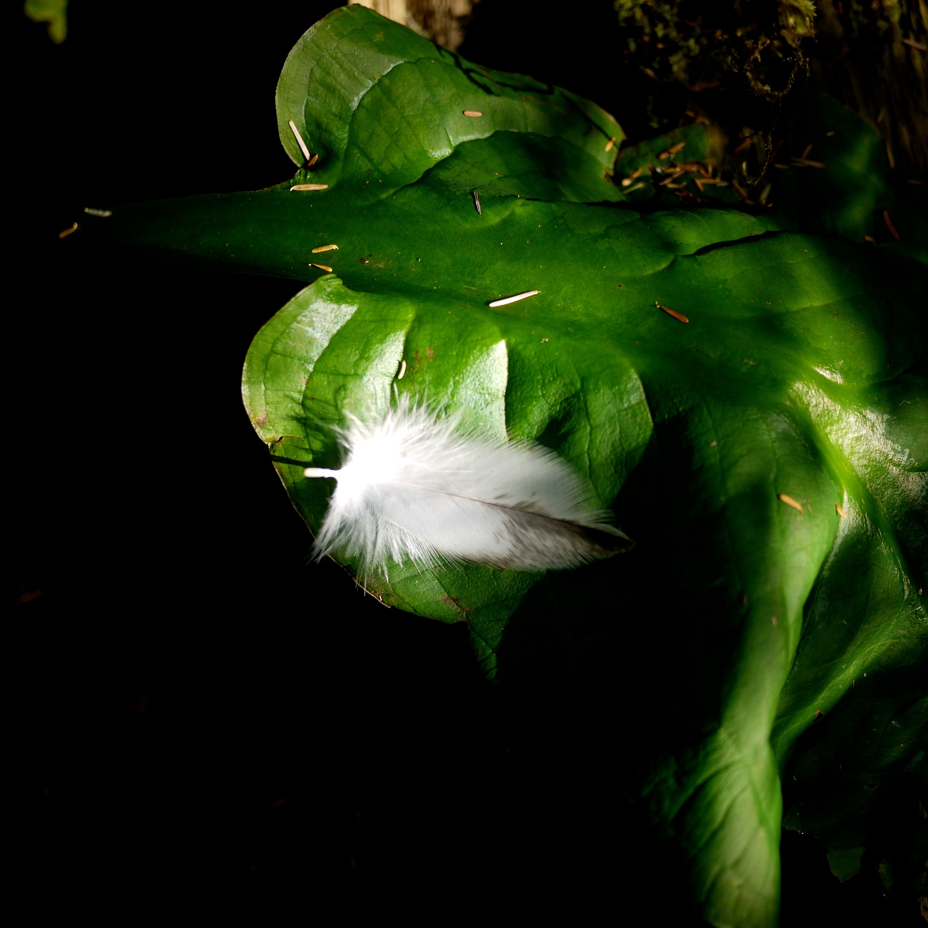It was hot on the muskeg meadow, even at 8 am. I could adjust by slipping off my sweatshirt but Aki could do nothing but pant. So I carried away my cup or so of cloudberries and headed with the little dog into the old growth. Strong morning sun reached into the forest to turn a devastated alder bush into what might be museum quality art if the person who killed it acted with artistic, rather than malicious intent. Later we found another sculpture formed when an eagle let one of its white feathers settle on a damaged skunk cabbage leaf.