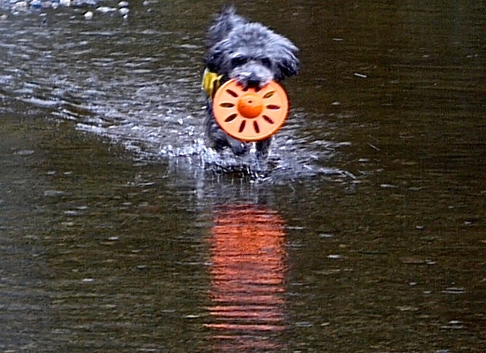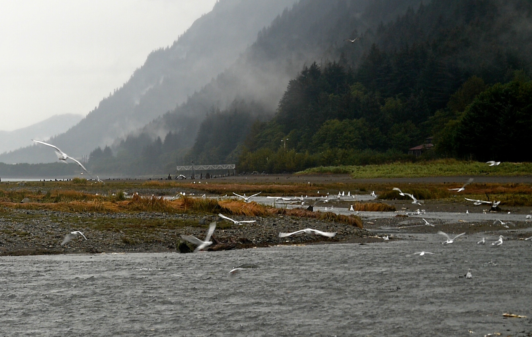In the woods we splash through small lakes. They formed on the trail during the deluge, which overburdened the forest’s natural drains. It’s worse where the ruins of a beaver dam have backed up a normally tiny stream. Heavy water drops fall off the forest canopy and drop on the little dog and me. I brace for worse and walk out of the woods onto the beach. Today, the sloping gravel strip between woods and sea is at peace. No rain falls. No wind blows. No waves pound. We can see all the way to Admiralty Island and hear eagle screams, ravens chortle. Aki searches through heavy ropes of severed rock weed while I plot the shortest, driest path through the wet woods.