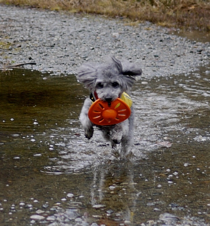 Further up the trail Aki alerts to a gang of five ouzels that fly low over the creek like WWII torpedo planes. They drop themselves, not torpedoes into the creek water but the effect is as deadly for their prey. Afterwards they collect themselves on midstream rocks to do their little bouncing dance. One calmly walks into the water. Another treat.