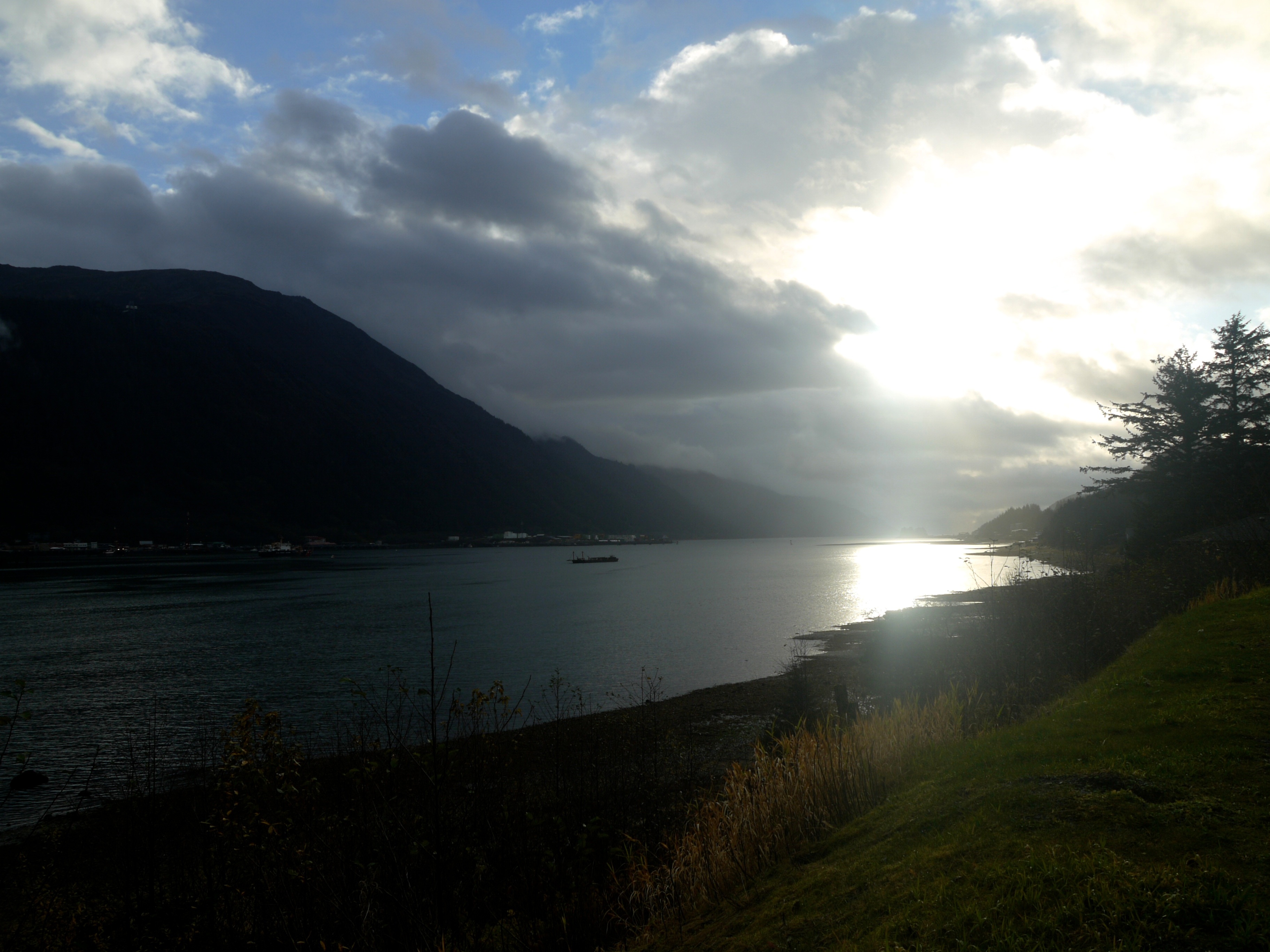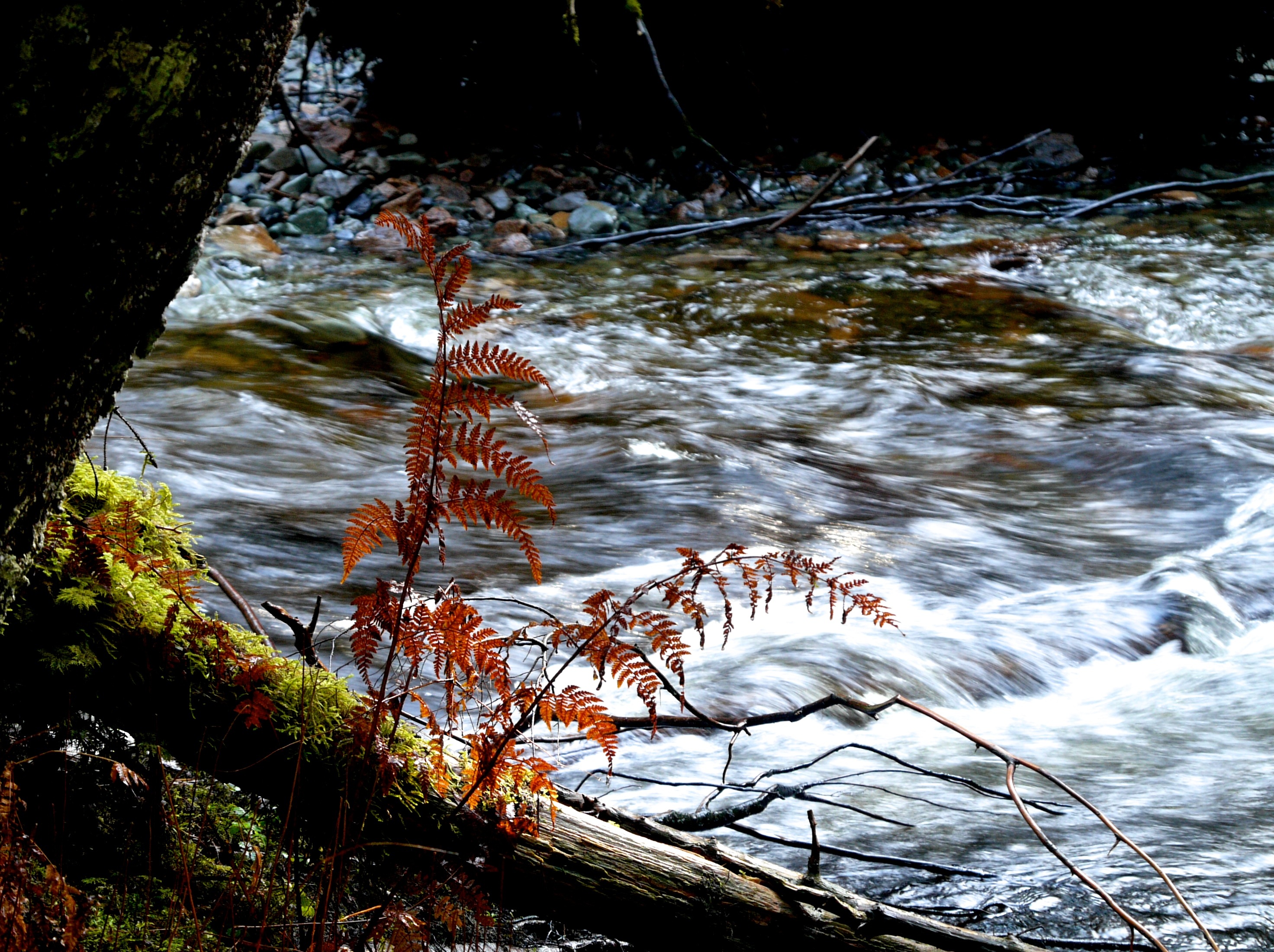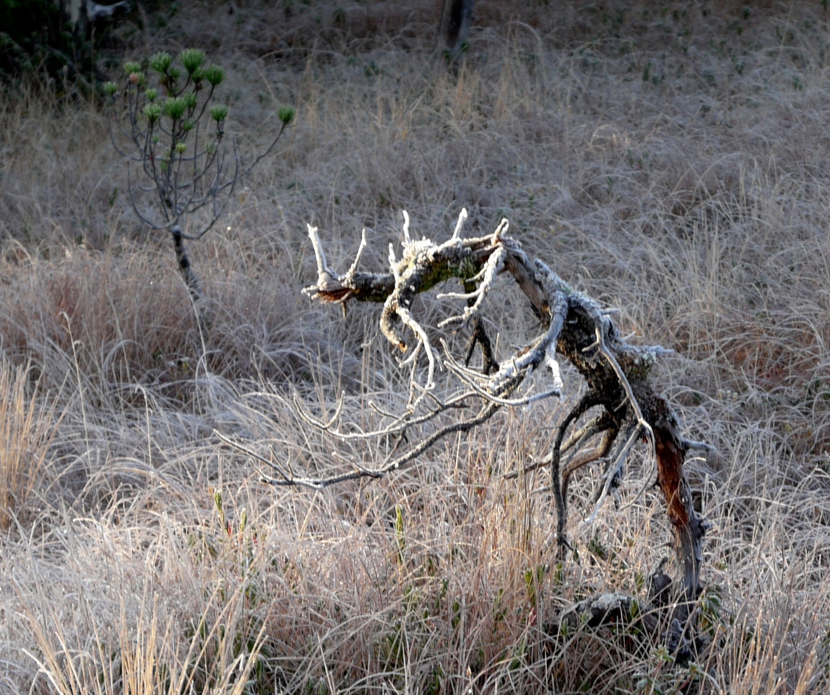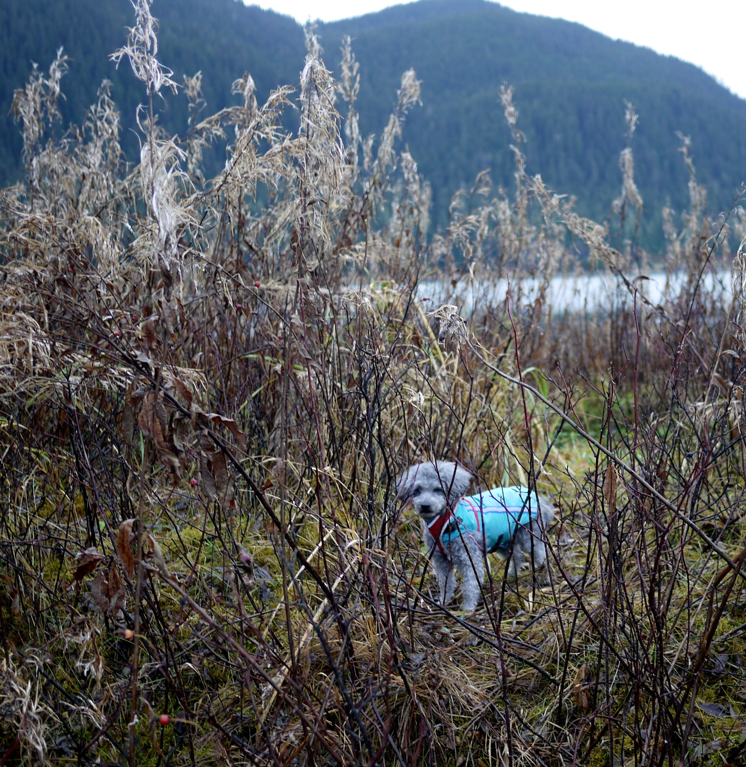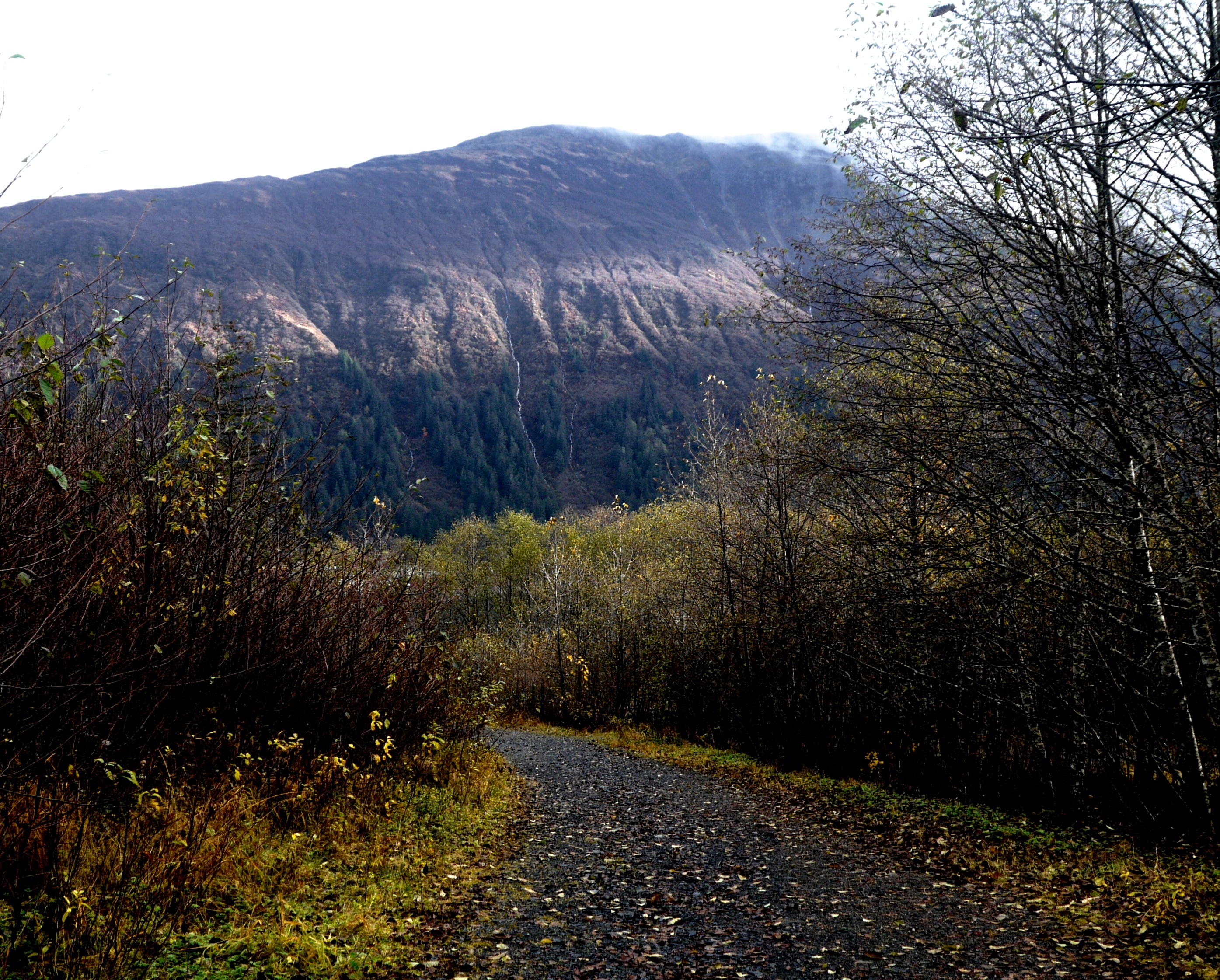 On this Halloween, a traditional day for surprises, Aki and I enjoy two pleasant ones on our walk up Fish Creek. The first is the smell of just sawn spruce and the man who sawed it. He and his new pile of hewn trail boards stand in a pool of bright light. The fast moving sun will soon shift away his spotlight and turn it on some filaments of spider web and strands of old man’s beard, still wet with last night’s rain, that nearby decorate blue berry twigs. Wind blew down the spruce tree last winter and the man’s hobby is to use his saw to improve trails. So, the logger didn’t down a live tree. His efforts produced a treat, not a trick.