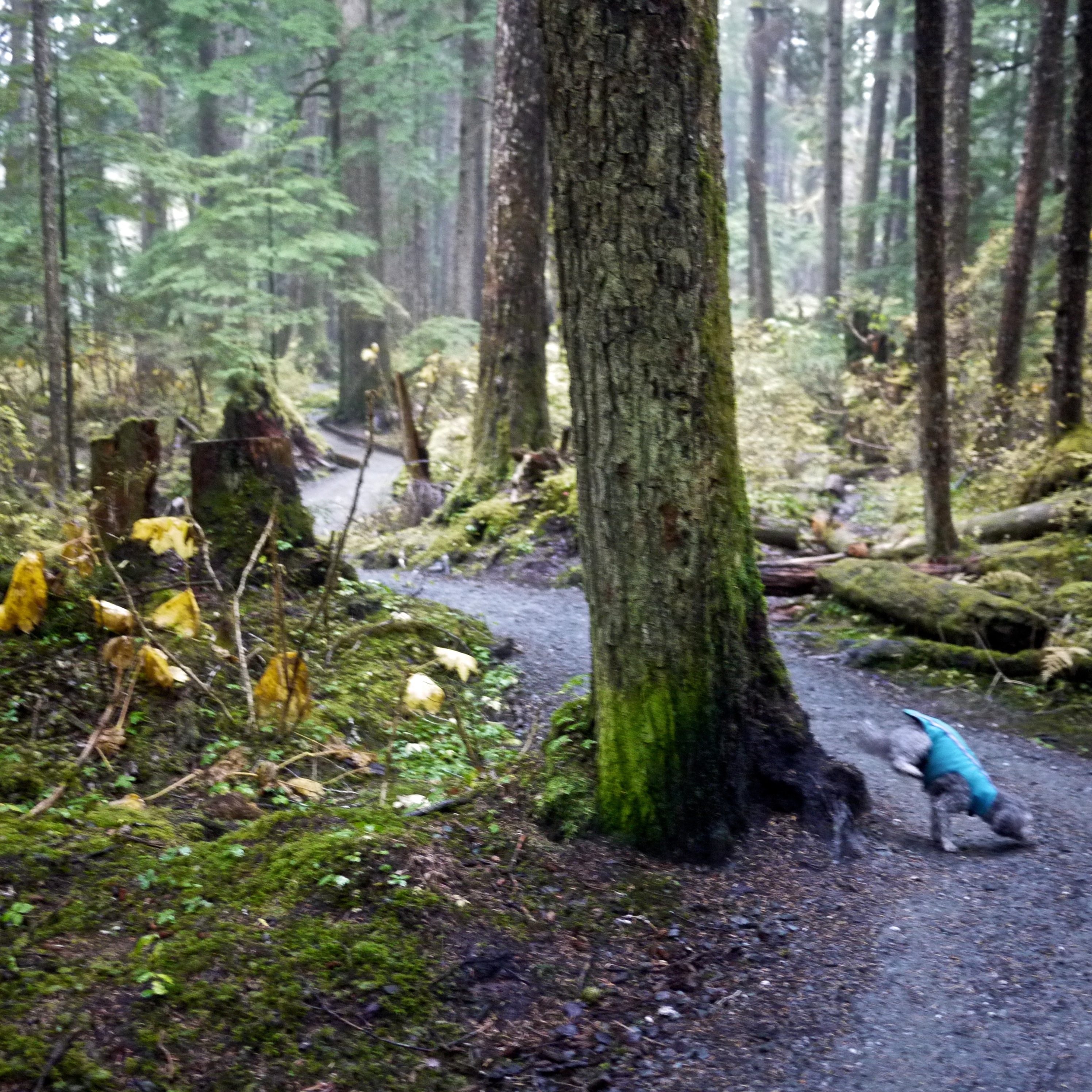 Yesterday a Hawaiian cyclone named Oho slammed into Ketchikan, 300 miles south of Chicken Ridge. It brought that Alaska border town strong winds and heavy rain. Over seven inches fell in 24 hours. Now the cyclone moves up the Alaska Panhandle. NOAA predicts high winds and a soaking for Juneau. Aki and want to be home in time to watch the show so we move up the time for this walk through the North Douglass old growth.
