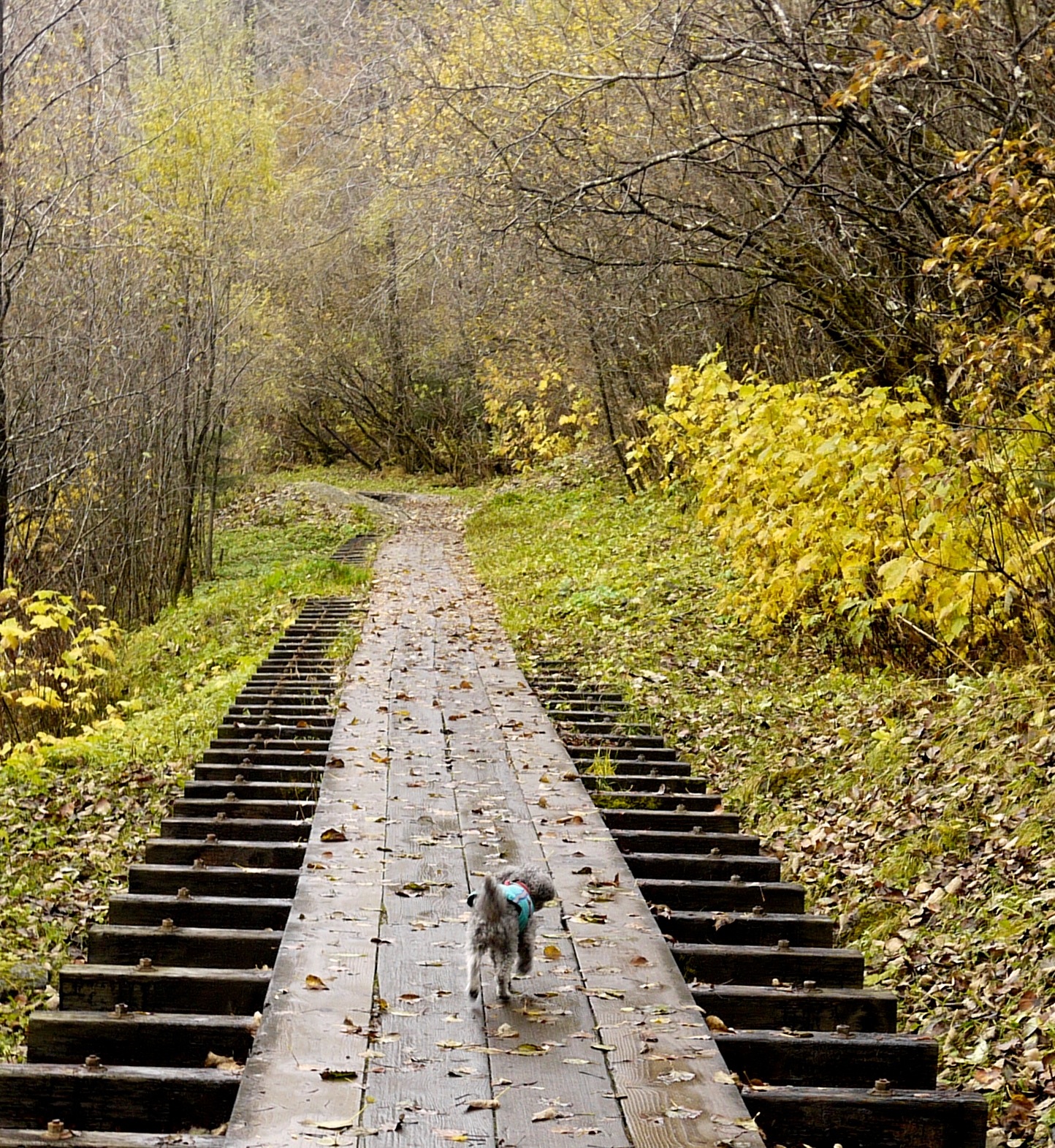 On this Saturday after the storm, Aki and I walk the flume trail, a neighborhood route that climbs up one side of Gold Greek and down the other. The little dog stays on lead during the ascent, which involves city streets like Gold Street, and once over the old wooden trestle bridge, a gravel road. Like Marmots taking advantage of the fair weather, dog owners are out and provide Aki with much entertainment.