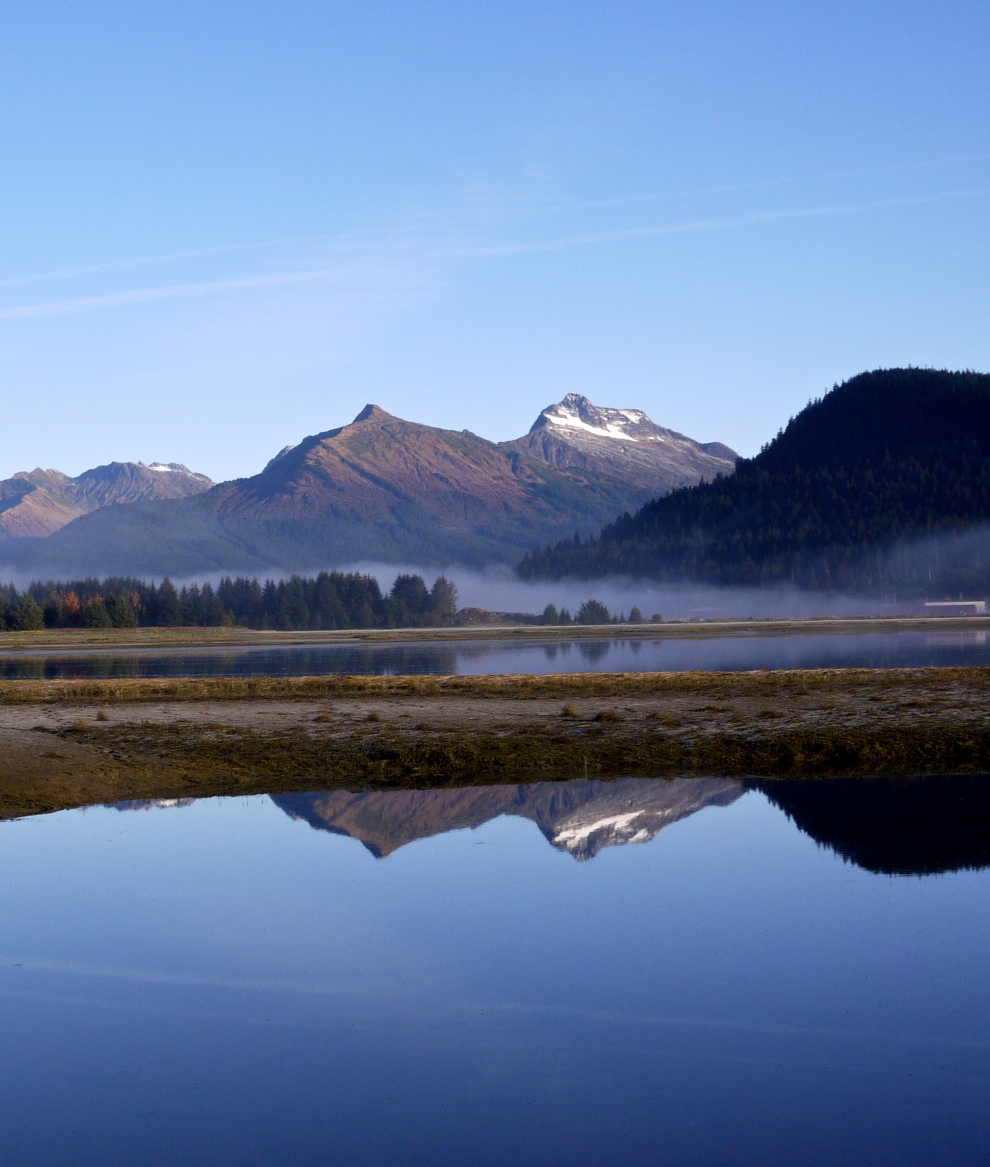 Another sunny day, a day for the ducks to fly above the guns on the wetlands. Aki and I take advantage of the resulting lack of hunters to use the Nine Mile Creek access point to edge onto a plain of flaxen colored beach glass. Still-green patches show through the standing dead stalks. Everything is covered with frost that is already yielding to the rising sun. I want to linger under the cloud-free sky and watch ground fog dissipate to reveal the islands dotting Gastineau Channel. Even now I can just make out a patch of orange-leafed cottonwoods that challenge the green monopoly held on the island by spruce most of the year.