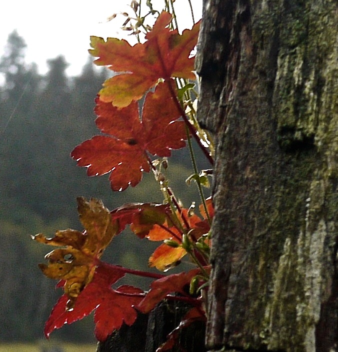 still-yellow Sitka mountain ash leaves. If we walked here yesterday, I would have been draw to the flashy show of colors of cottonwoods and ashes against the always-dark green spruce. But in today’s softer light, the Alder’s strong form and subtle palette can compete with yellowing leaves for attention.
