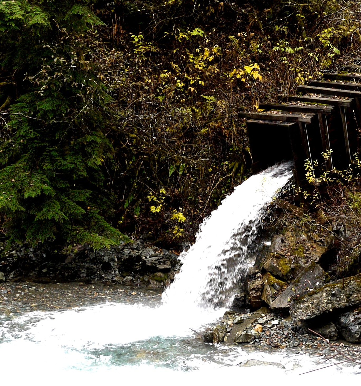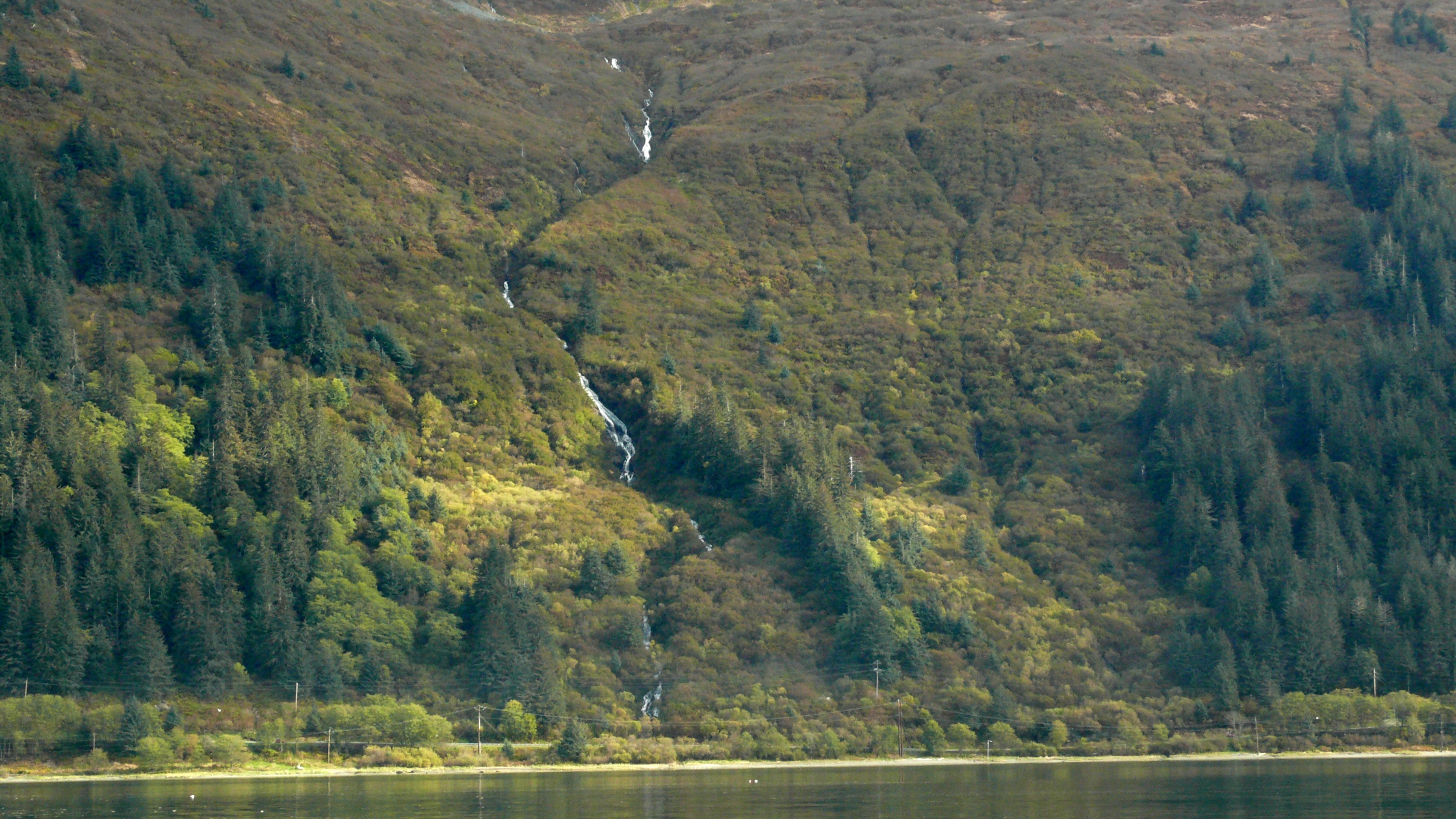 The time of autumn sun is over. Rain comes this afternoon. Aki and I are squeezing in a quick walk through the Treadwell mining town ruins. Aki will see no dogs on the walk and we will only spot four people. We are the only ones to see a random shaft of sunlight strike a mallard hen as she wanders among old wharf pilings. The shaft moves north across Gastineau Channel to make Slide Creek sparkle for a few seconds before clouds cut off the spotlight.